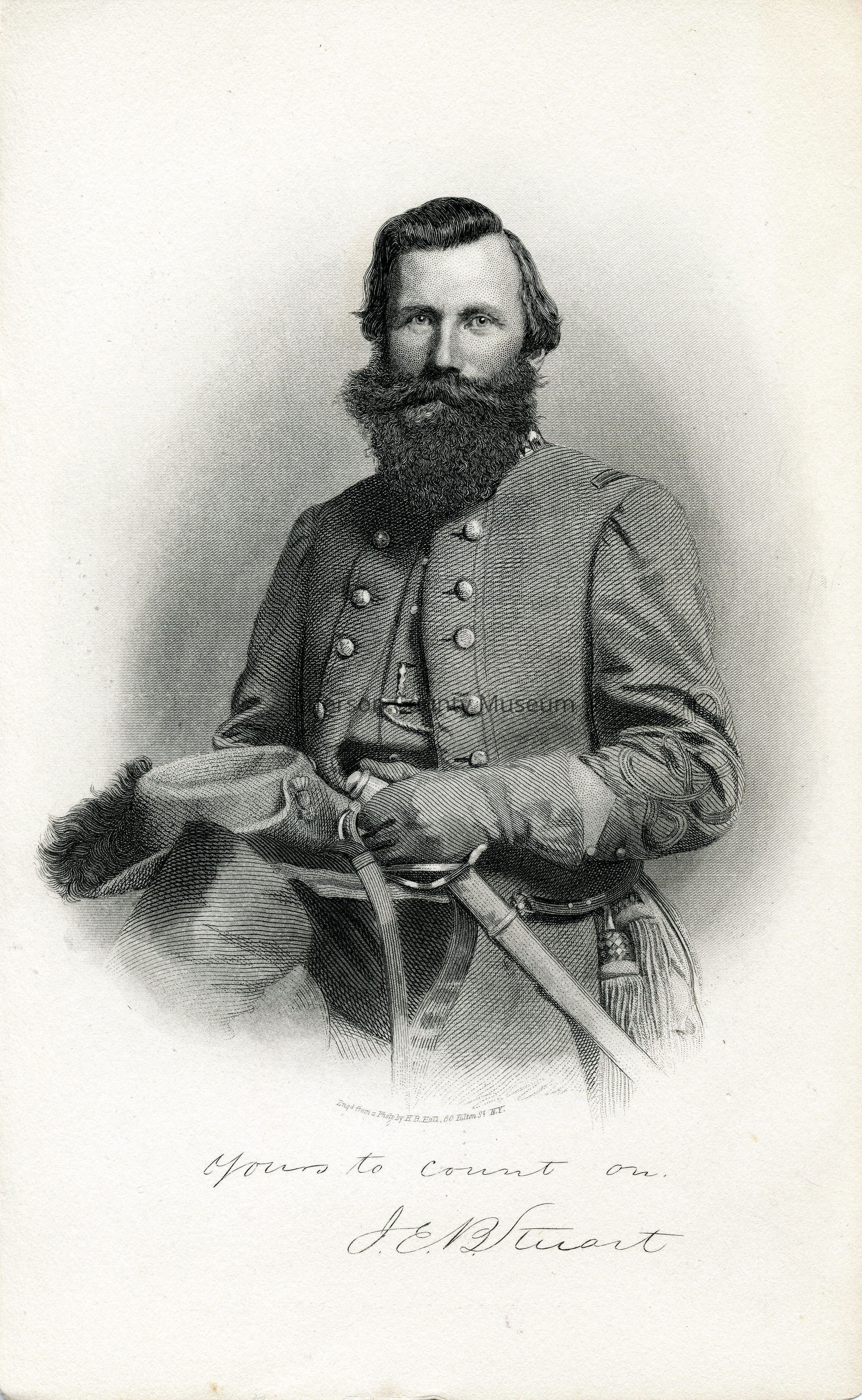 J.E.B. Stuart. Shows Stuart with long black hair, black beard and long, large moustache. Stuart is seated with gloved left hand on hilt of sword, plumed hat in lap. Tasseled sash is at left side. Watch chain hanging from inside shirt or vest. Top of cavalry boot is visible on crossed leg. At bottom in script is printed by publisher "yours to count on. J.E.B. Stuart". Directly under image of Stuart is "Engd from a photo by H.B. Hall, 60 Fulton St. N.Y."Acquisition