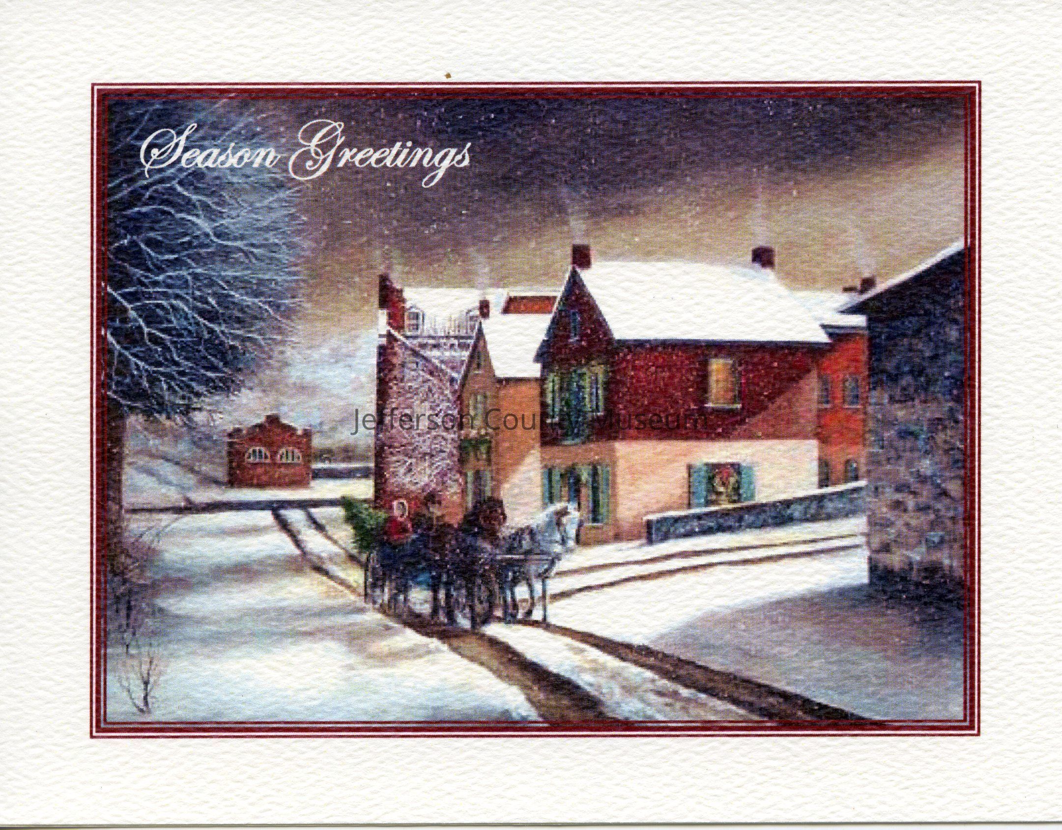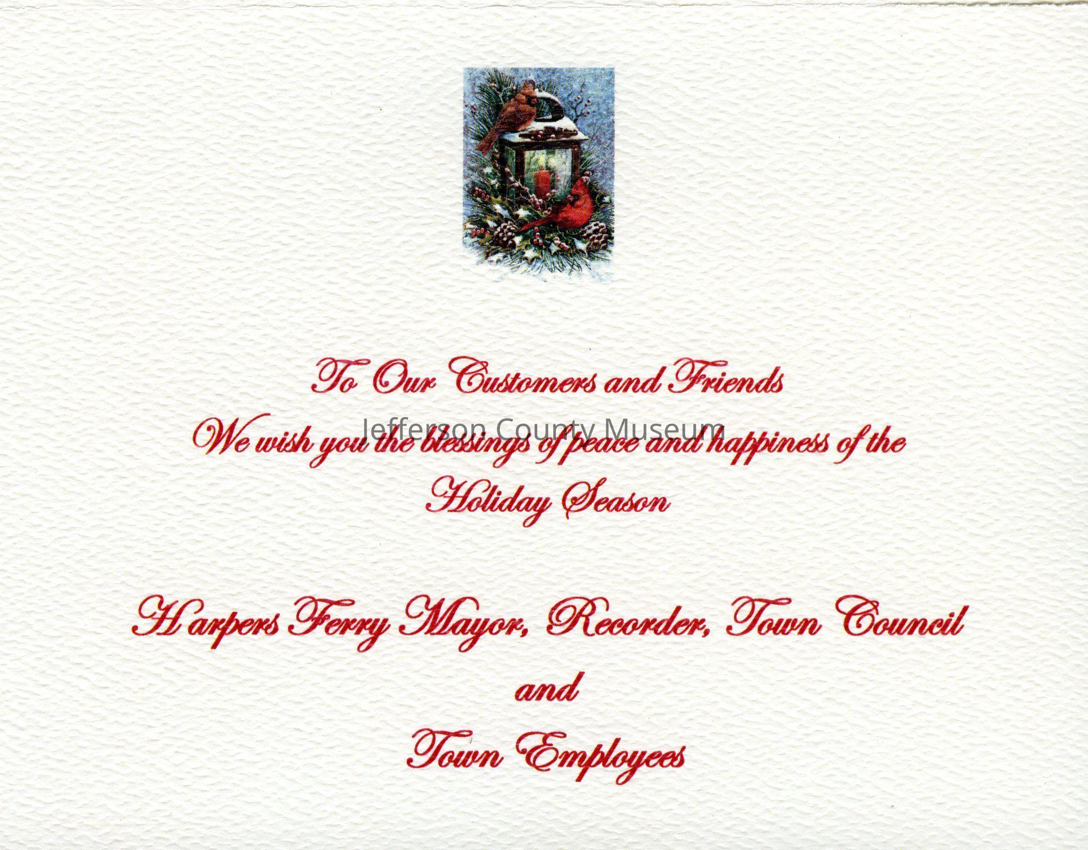 Front of card shows artist's rendering of Potomac Street in Harpers Ferry with horse-drawn cart pulled by two horses, with two people seated in cart hauling an evergreen tree. Printed in white script in upper left corner: "Season Greetings". Inside card, printed in red script: "To Our Customers and Friends We wish you the blessings of peace and happiness of the Holiday Season Harpers Ferry Mayor, Recorder, Town Council and Town Employees". On back of card, Printed in black: "Potomac Street Harpers Ferry, WV"Acquisition