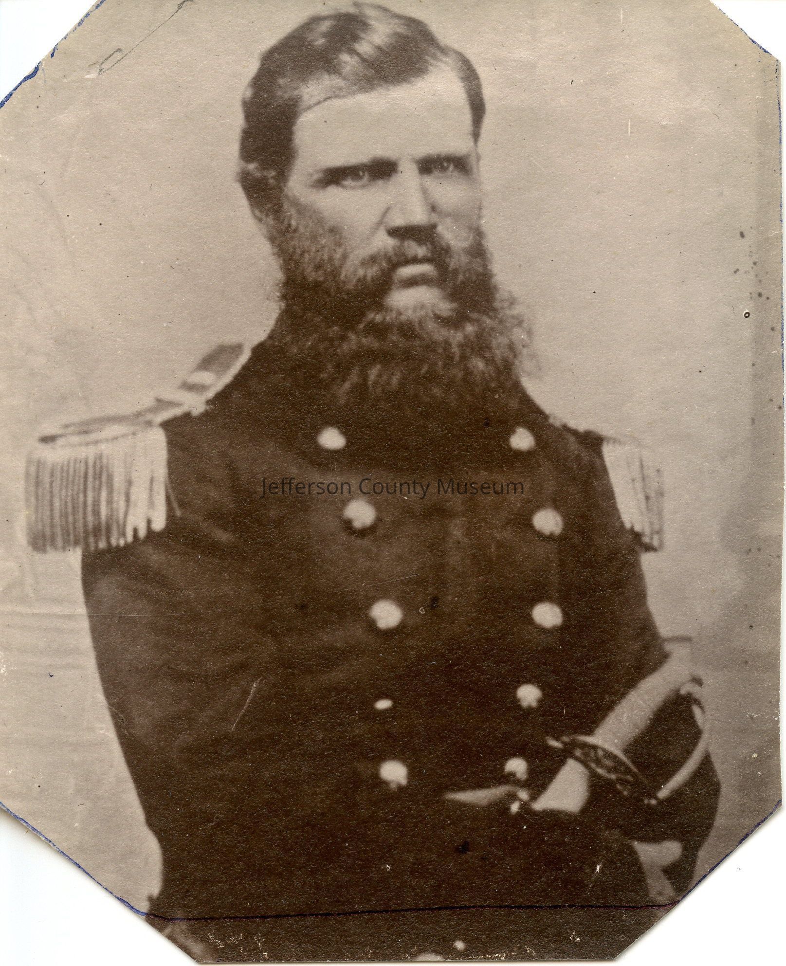 Robert Baylor in Confederate uniform holding sword, wearing epaulets in the museum collection.