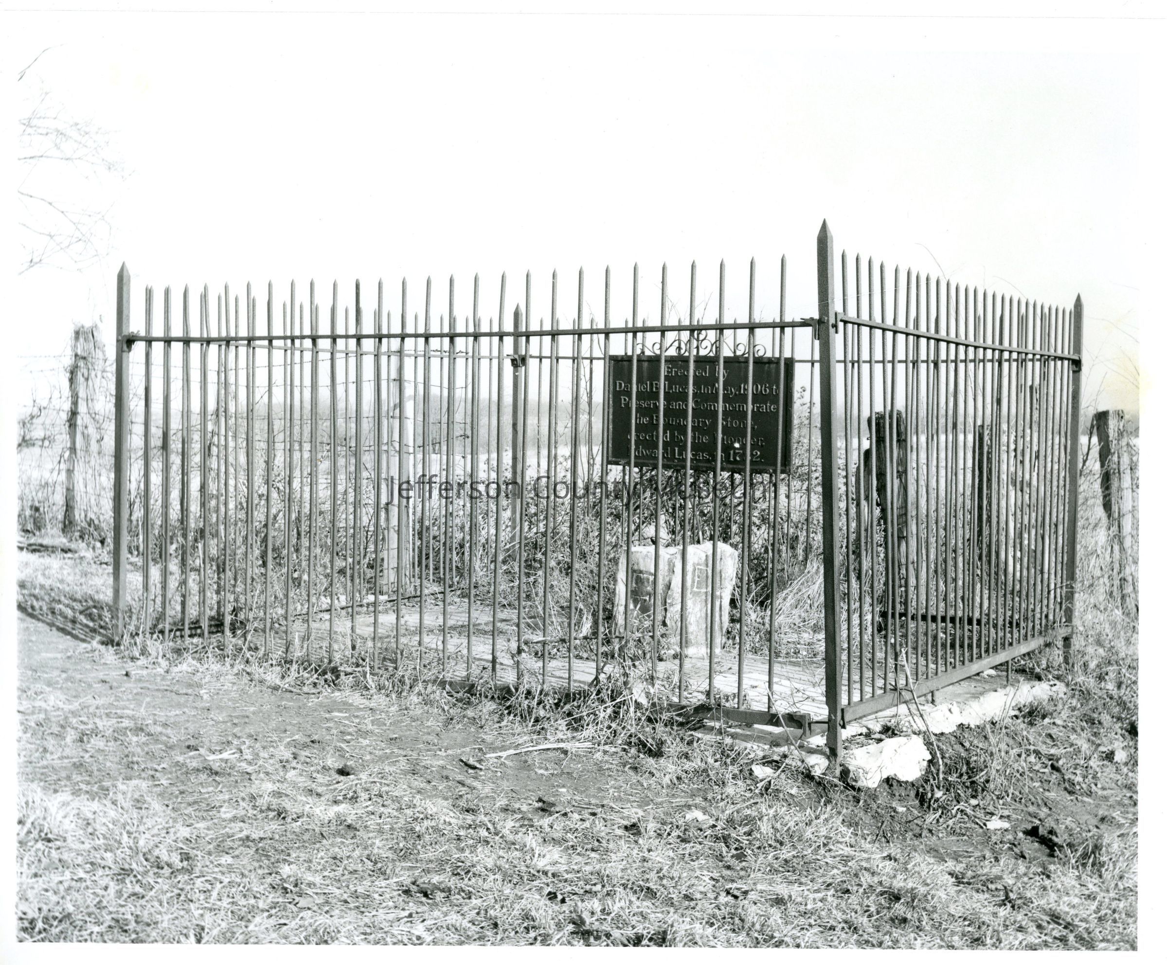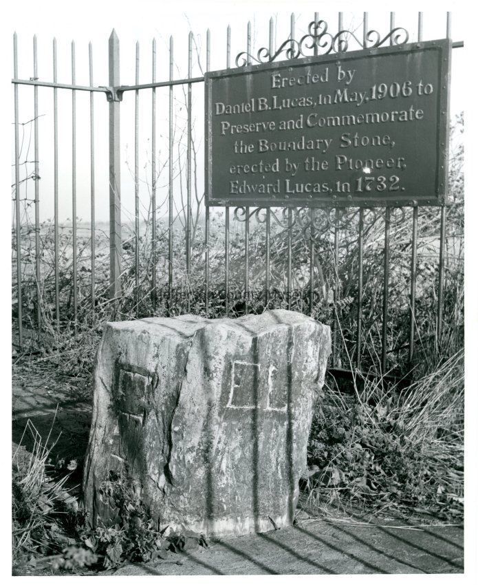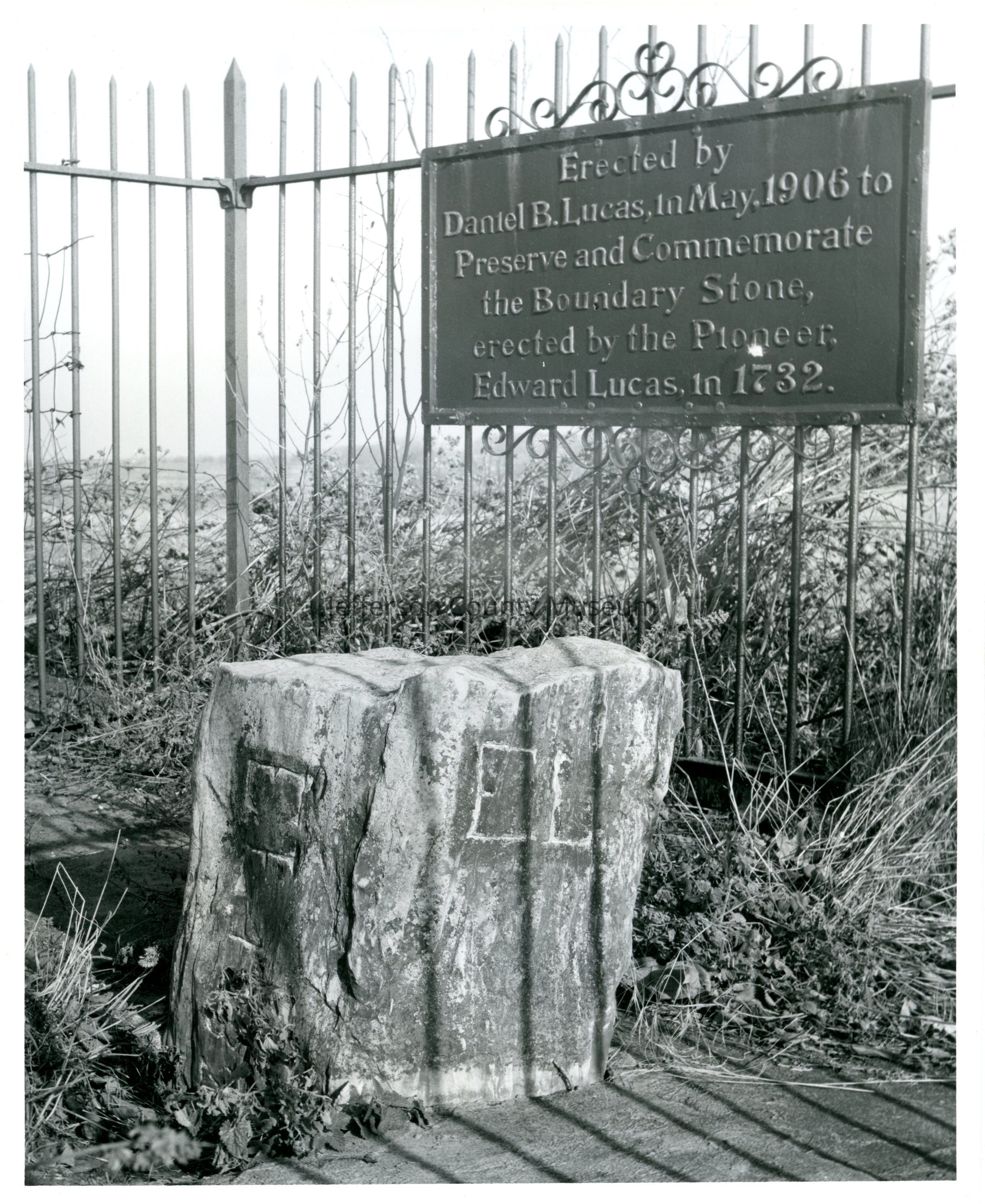 IMG3699-4: [There are two identical copies of photograph.] Boundary stone at Elmwood and plaque that reads: "Erected by Daniel B. Lucas in May 1906 to preserve and commemorate the boundary stone erected by the pioneer Edward Lucas in 1732"