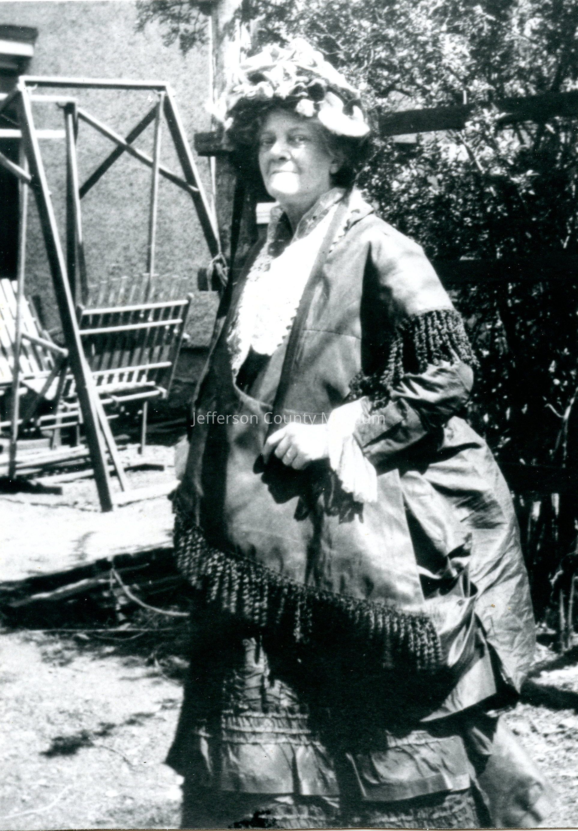 Mrs. Anna Morgan Getzendanner in a dress and hat of the late Victorian period. Mrs. Getzendanner was the organizing regent of the Beeline Chapter of the D.A.R. In the background are a wooden swing and trees..Acquisition