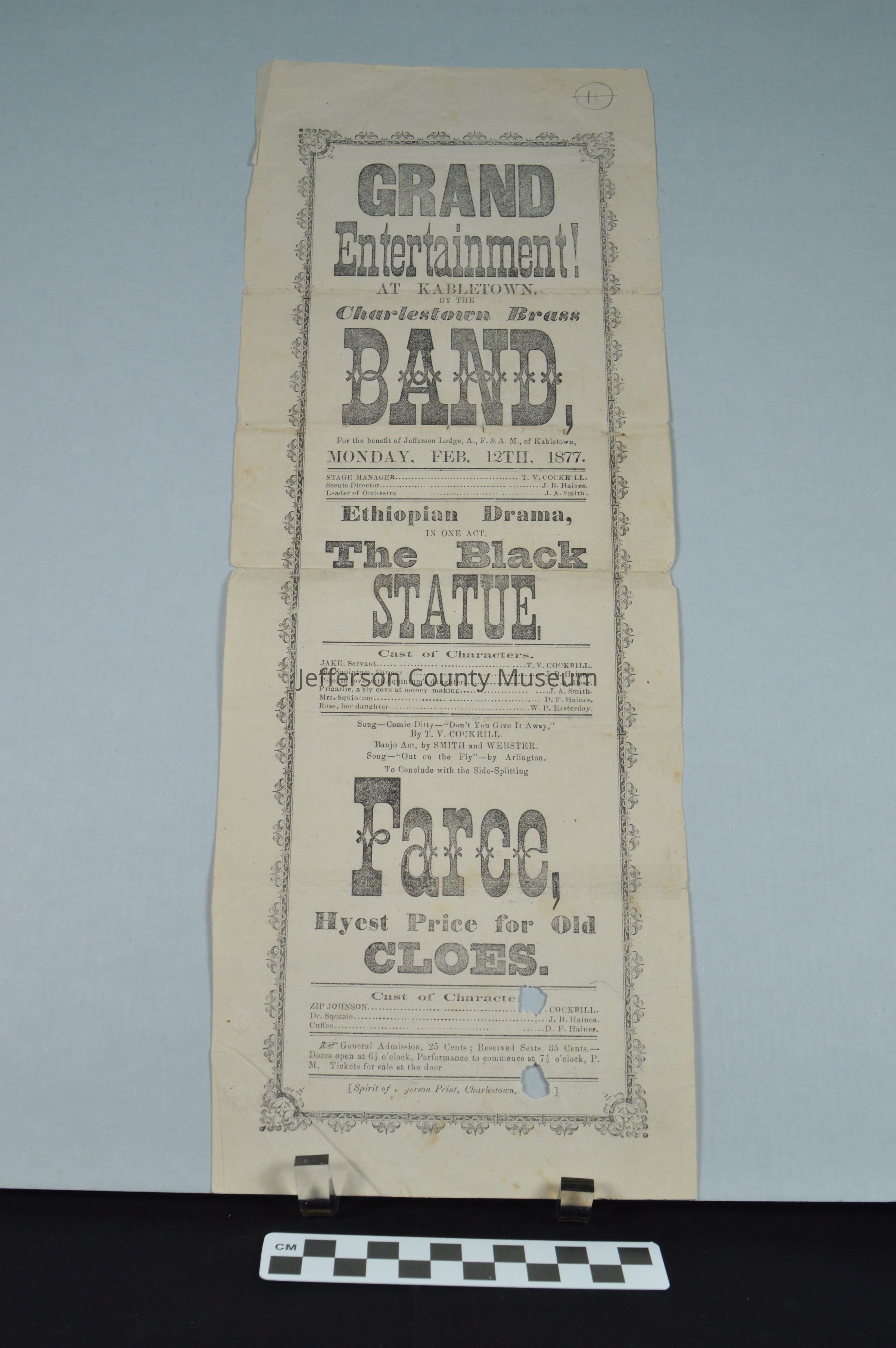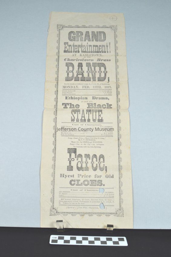 Theater poster from February 12, 1877, for entertainment at Kabletown by the Charlestown Brass Band; an Ethiopian Drama, The Black Statue; and a farce. The production was a benefit for the Jefferson Lodge, A., F. & A. M. of Kabletown. Spirit of Jefferson Print.