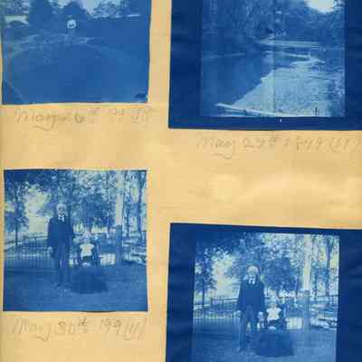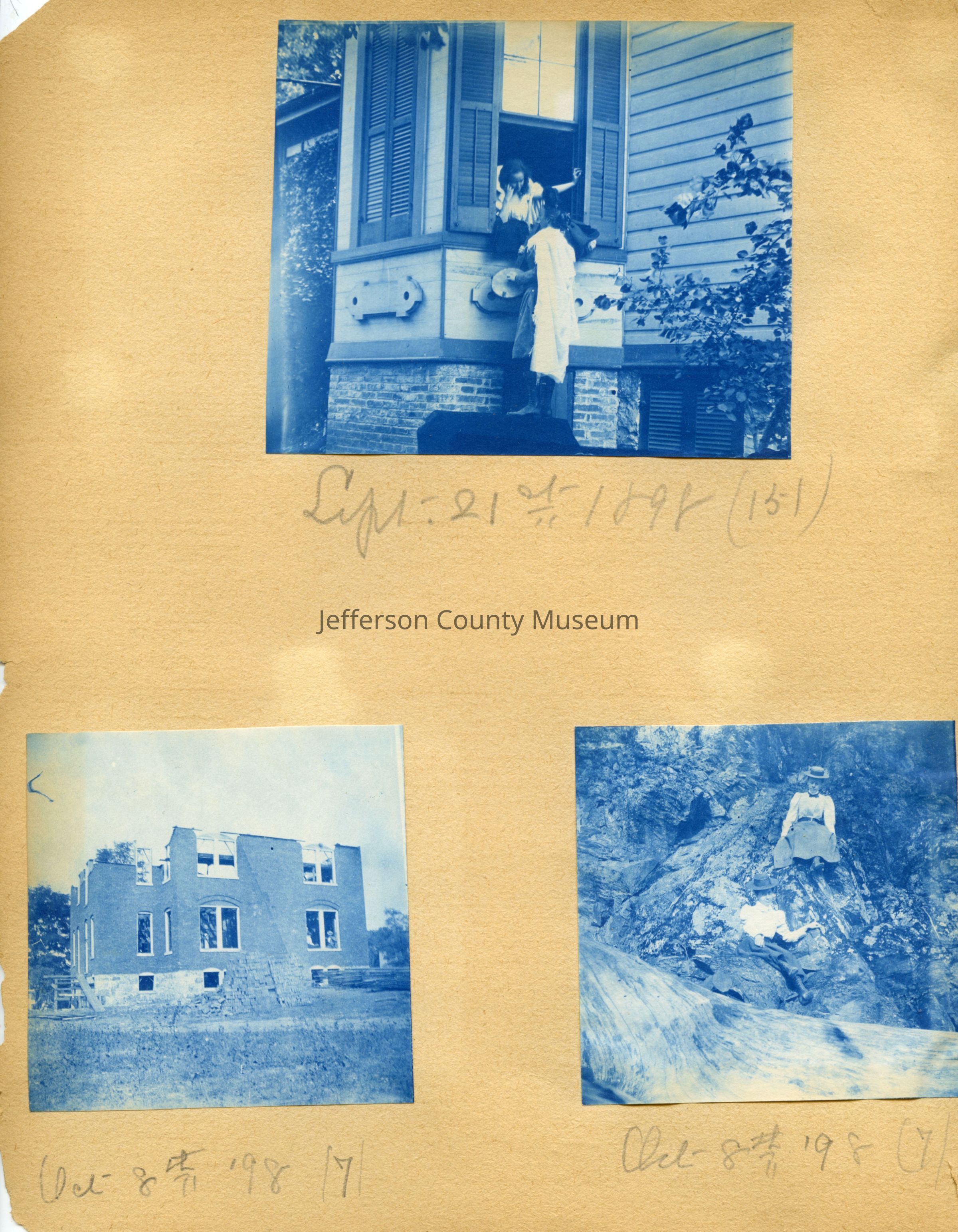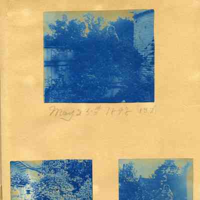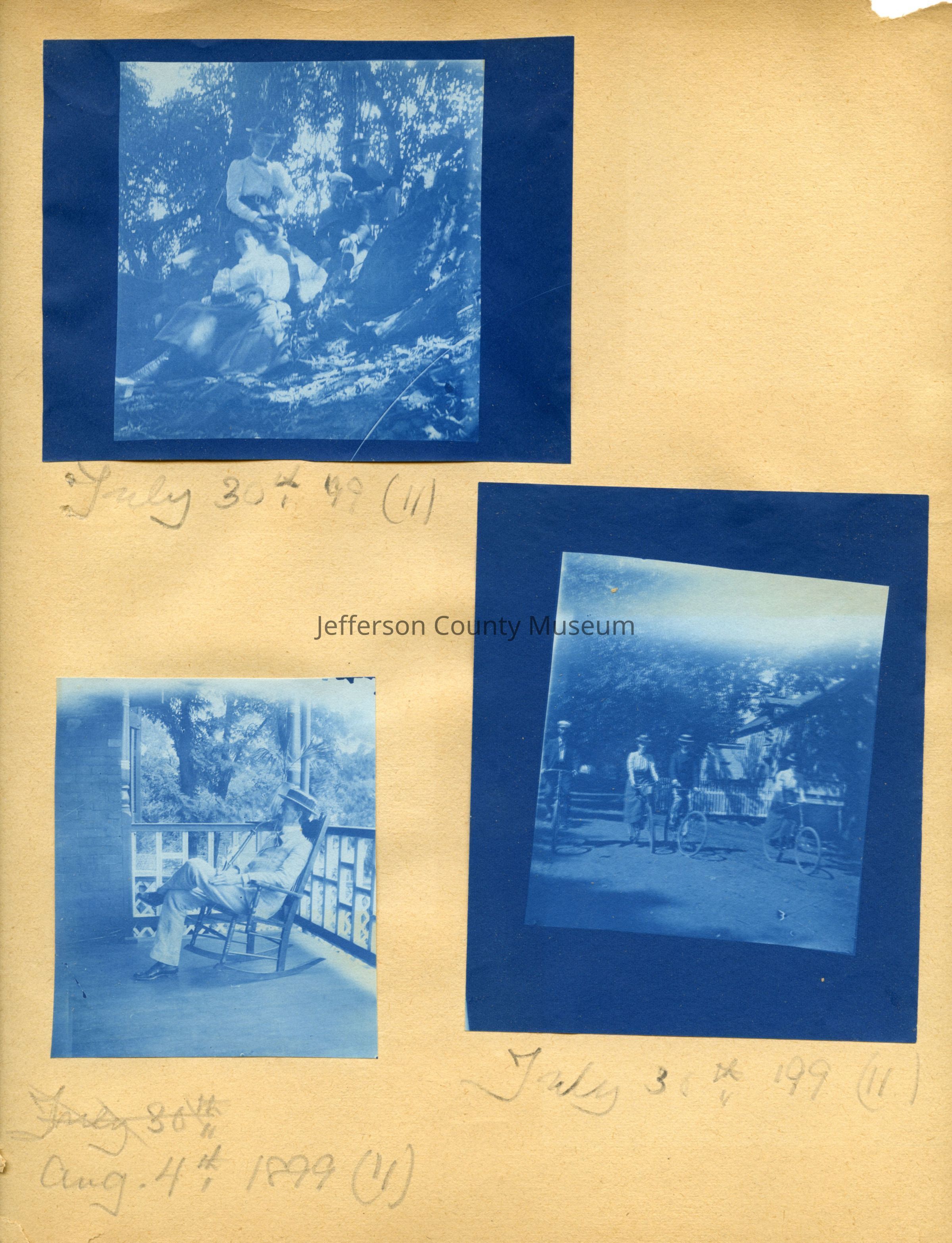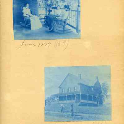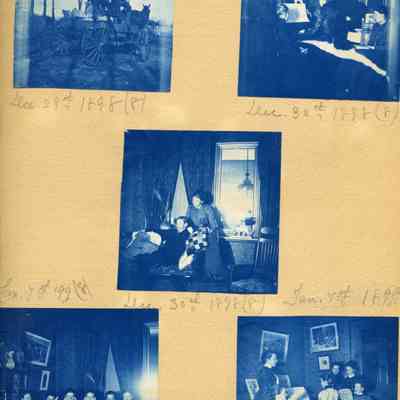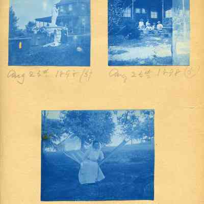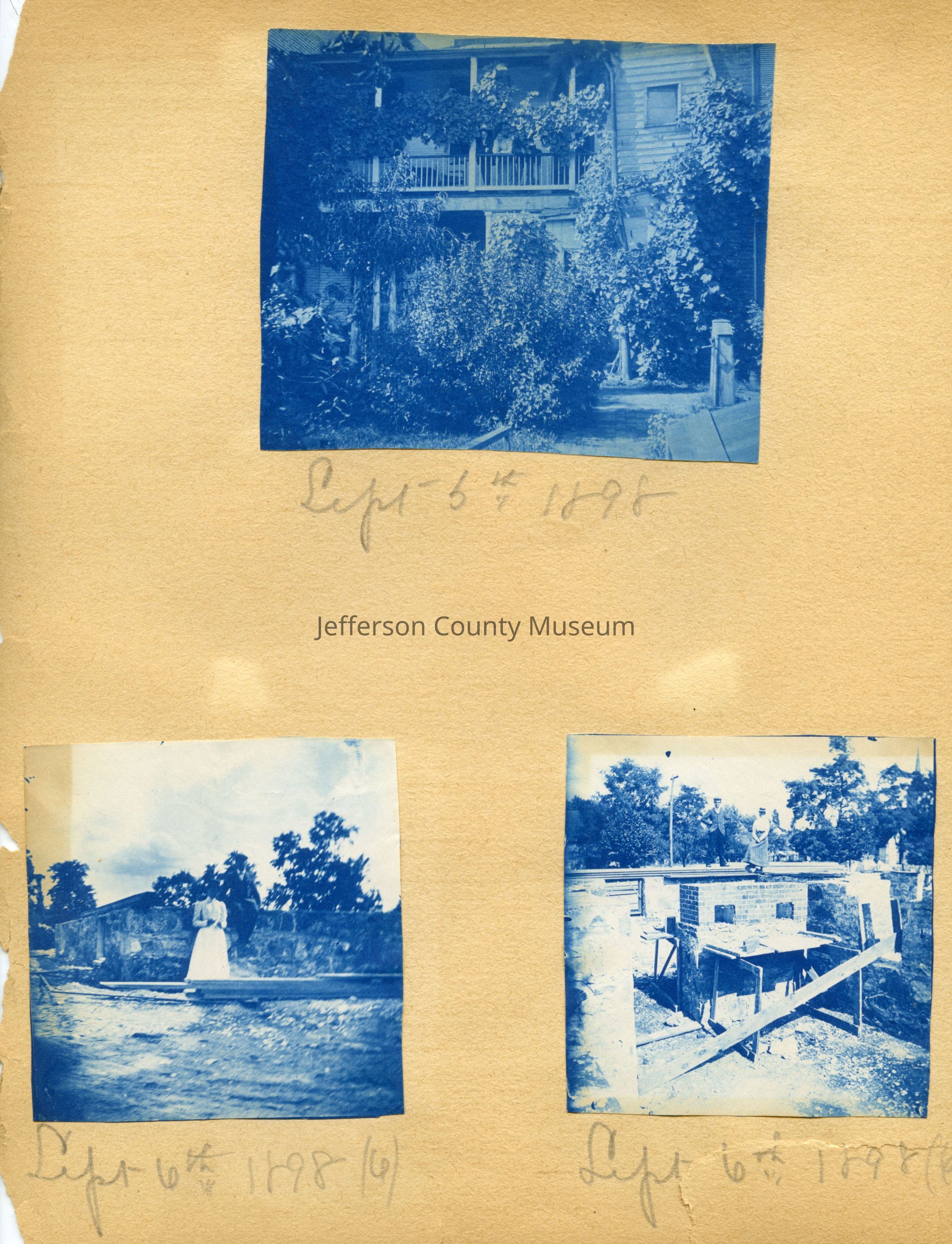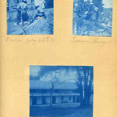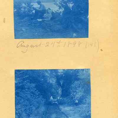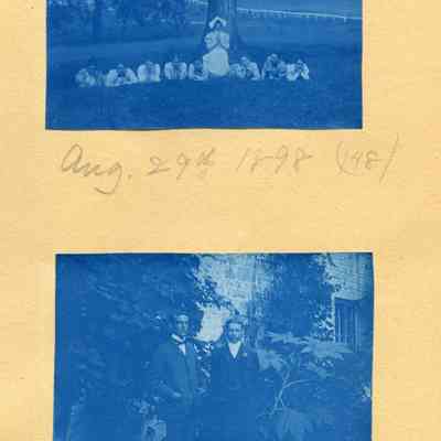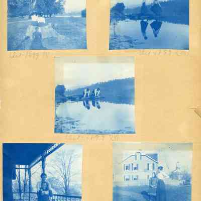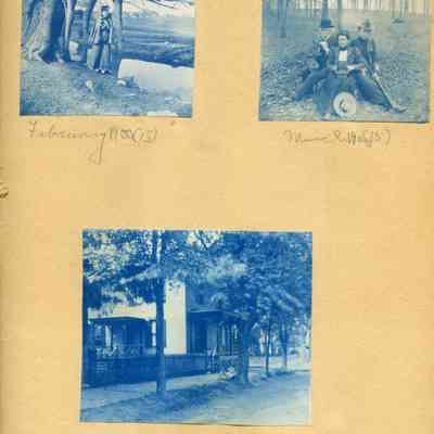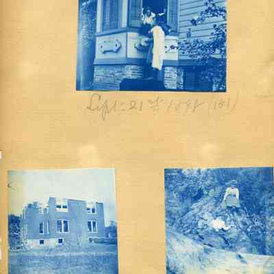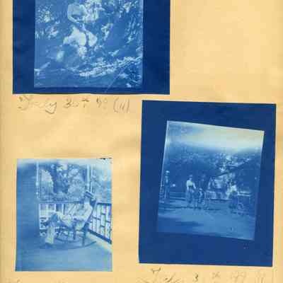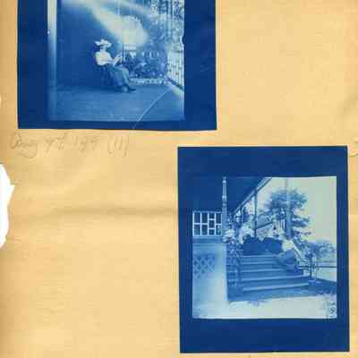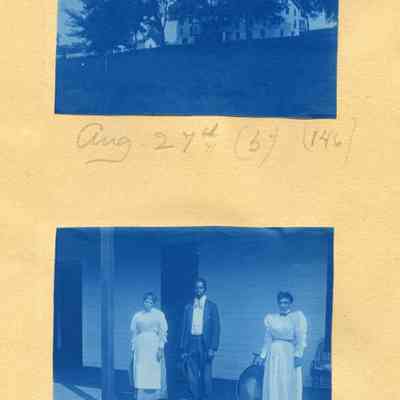 Album 1) Photos dated Feb 1896 to May 14, 1898 (Letty Cary Ambler written inside front cover) (blue & white photos--cyanotypes) (pages are loose and not numbered, 3 photos scanned: Lucy Ambler and 2 men Feb 10, 1896; Harewood Dec 10, 1896 (70); Prato Rio Sep 6, 1897 (111); St. Philip's Sewing School, August 27, 1896)) (All scanned pages are from Album 1).
