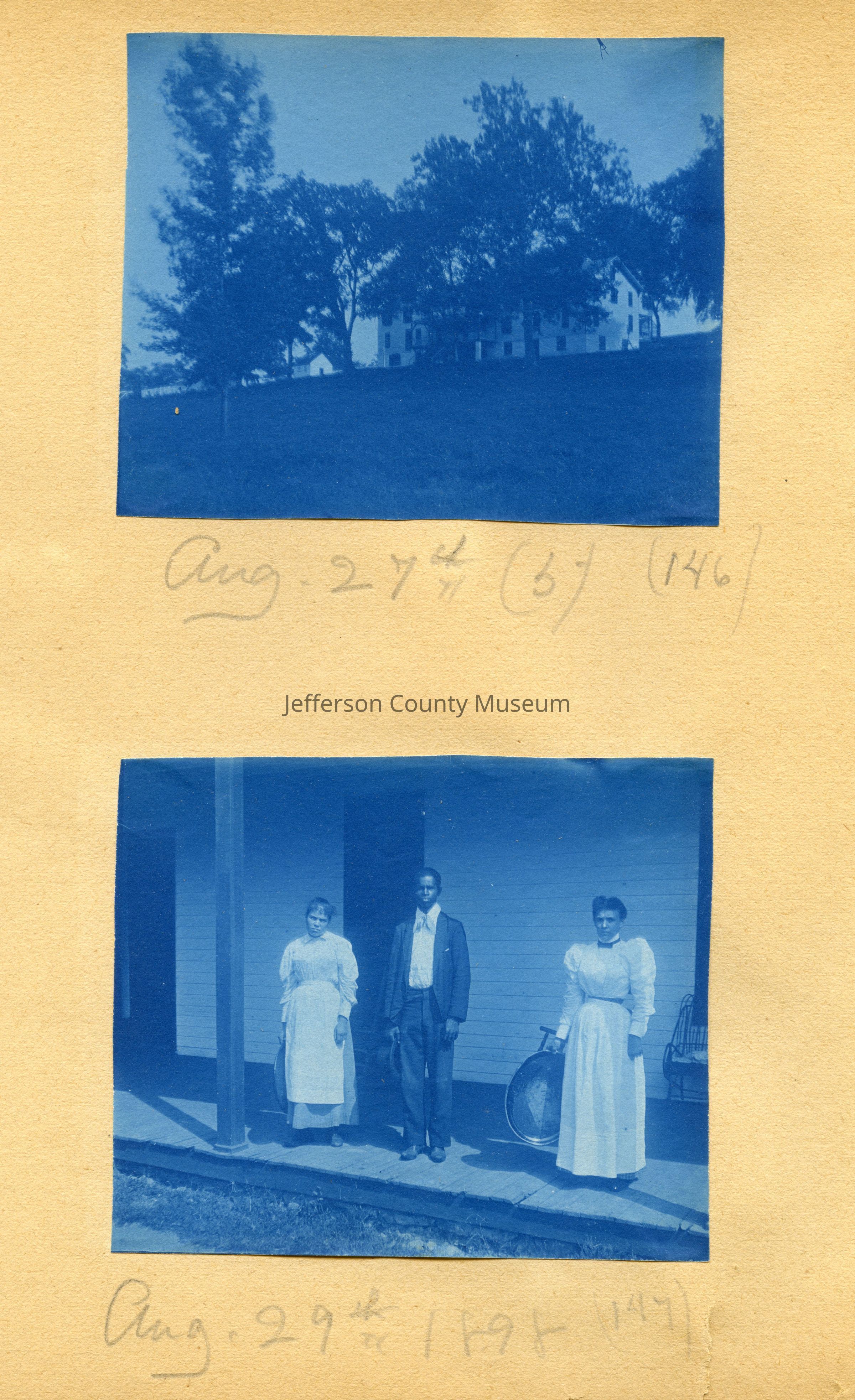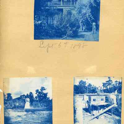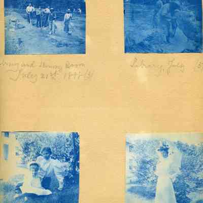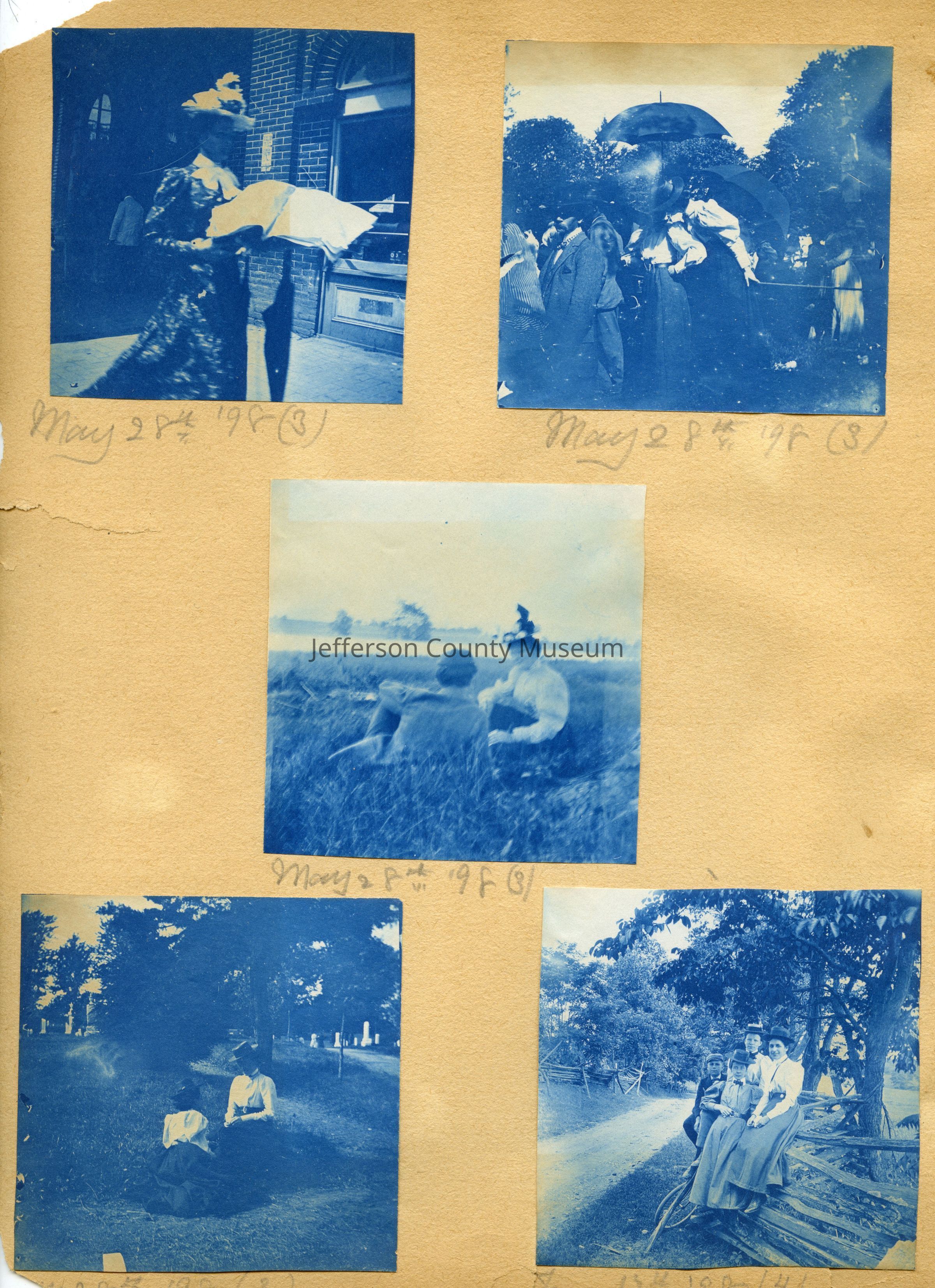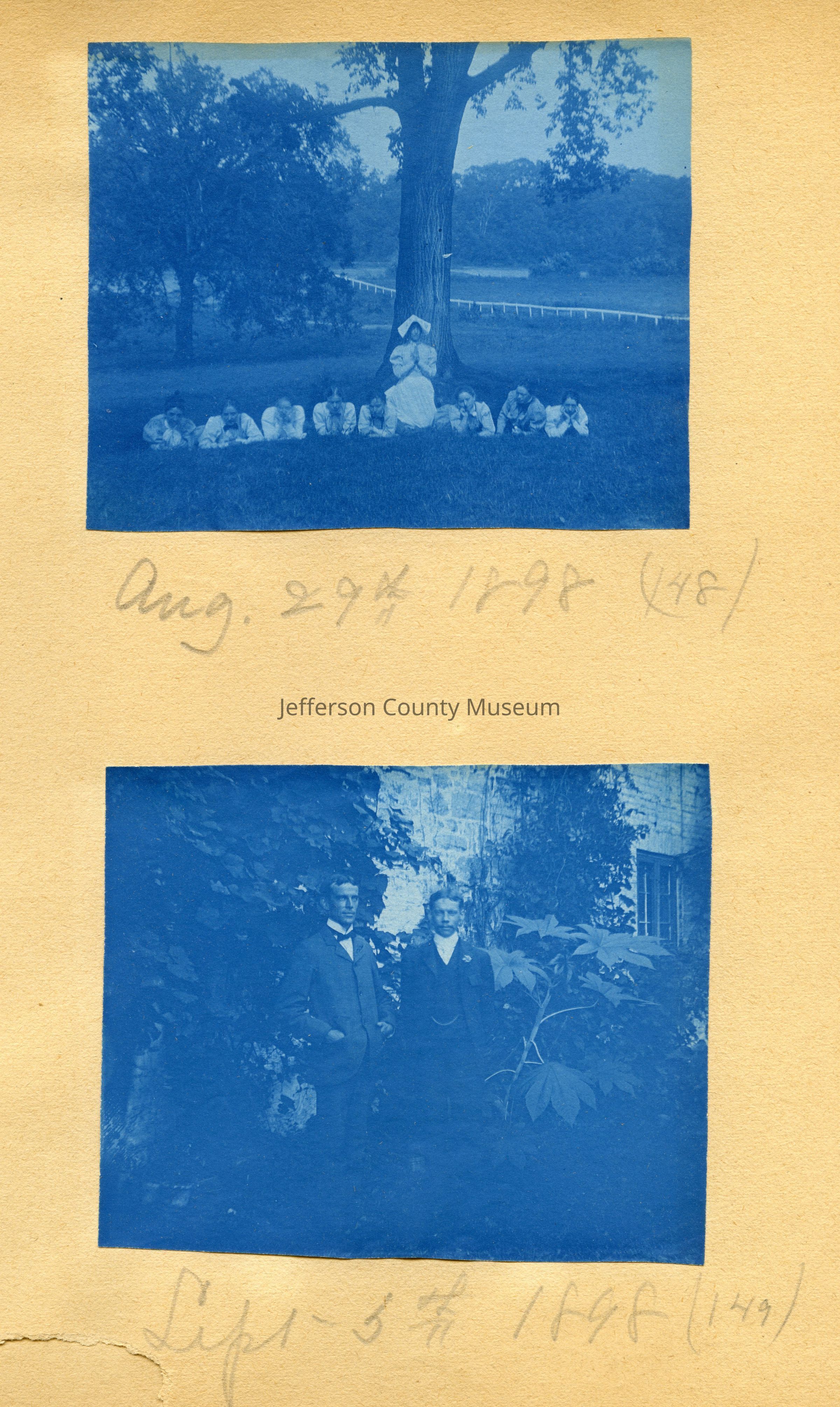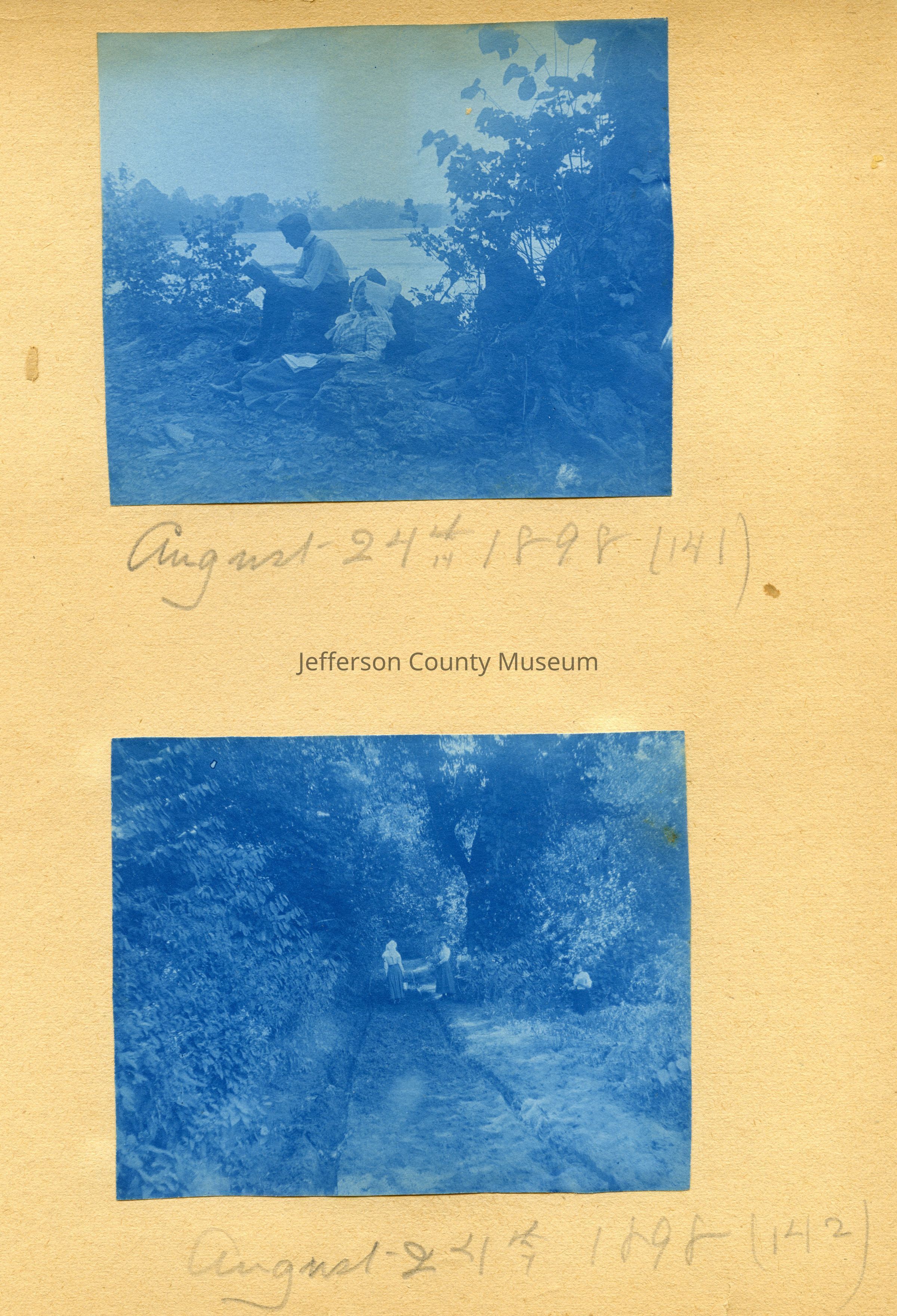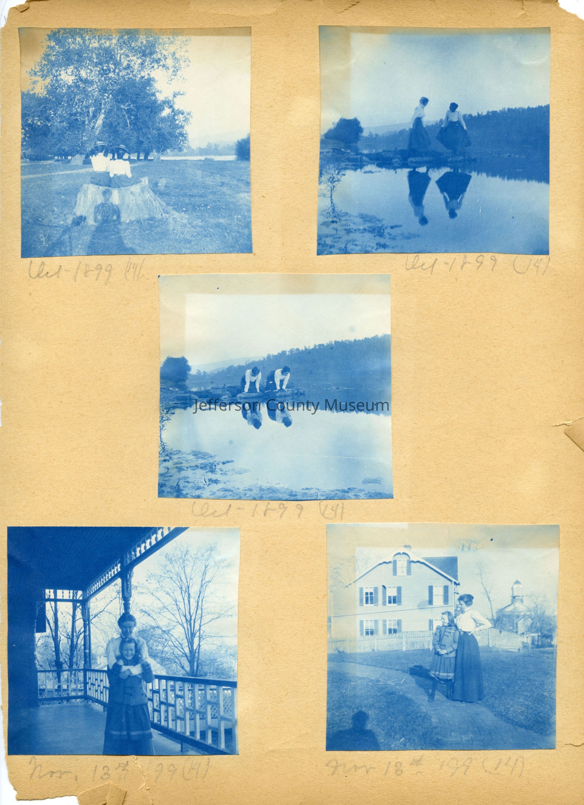 Album 1) Photos dated Feb 1896 to May 14, 1898 (Letty Cary Ambler written inside front cover) (blue & white photos--cyanotypes) (pages are loose and not numbered, 3 photos scanned: Lucy Ambler and 2 men Feb 10, 1896; Harewood Dec 10, 1896 (70); Prato Rio Sep 6, 1897 (111); St. Philip's Sewing School, August 27, 1896)) (All scanned pages are from Album 1).