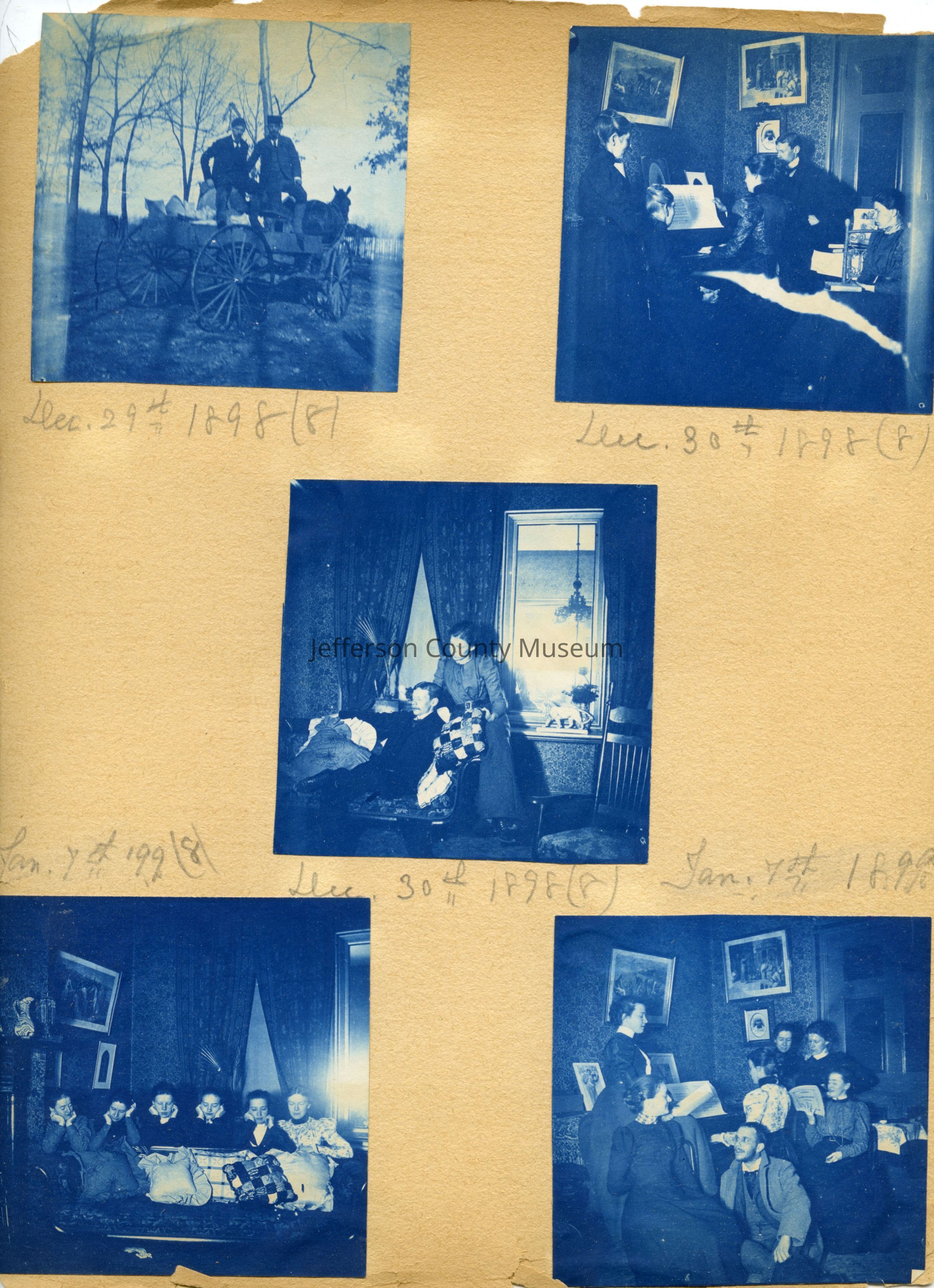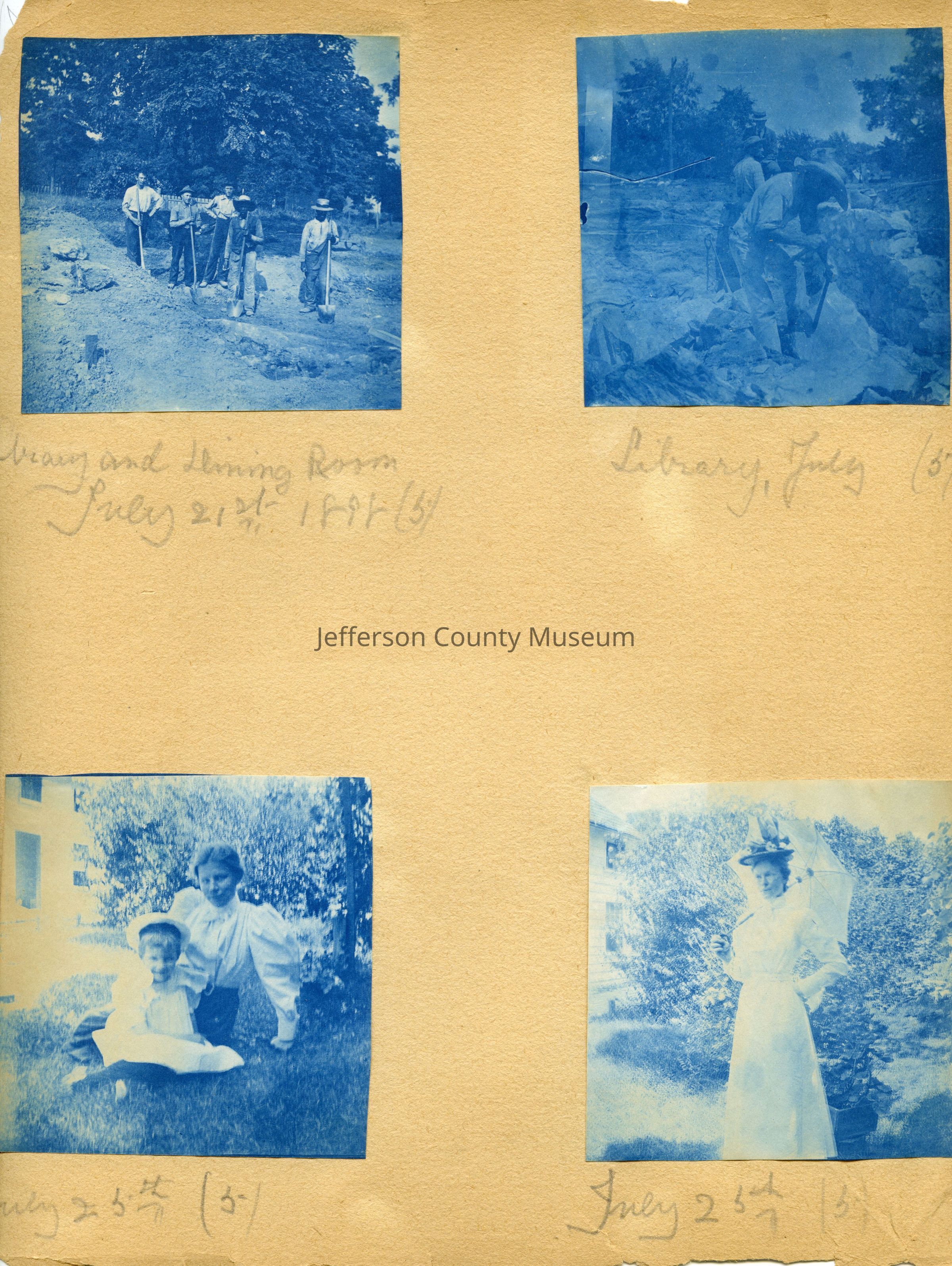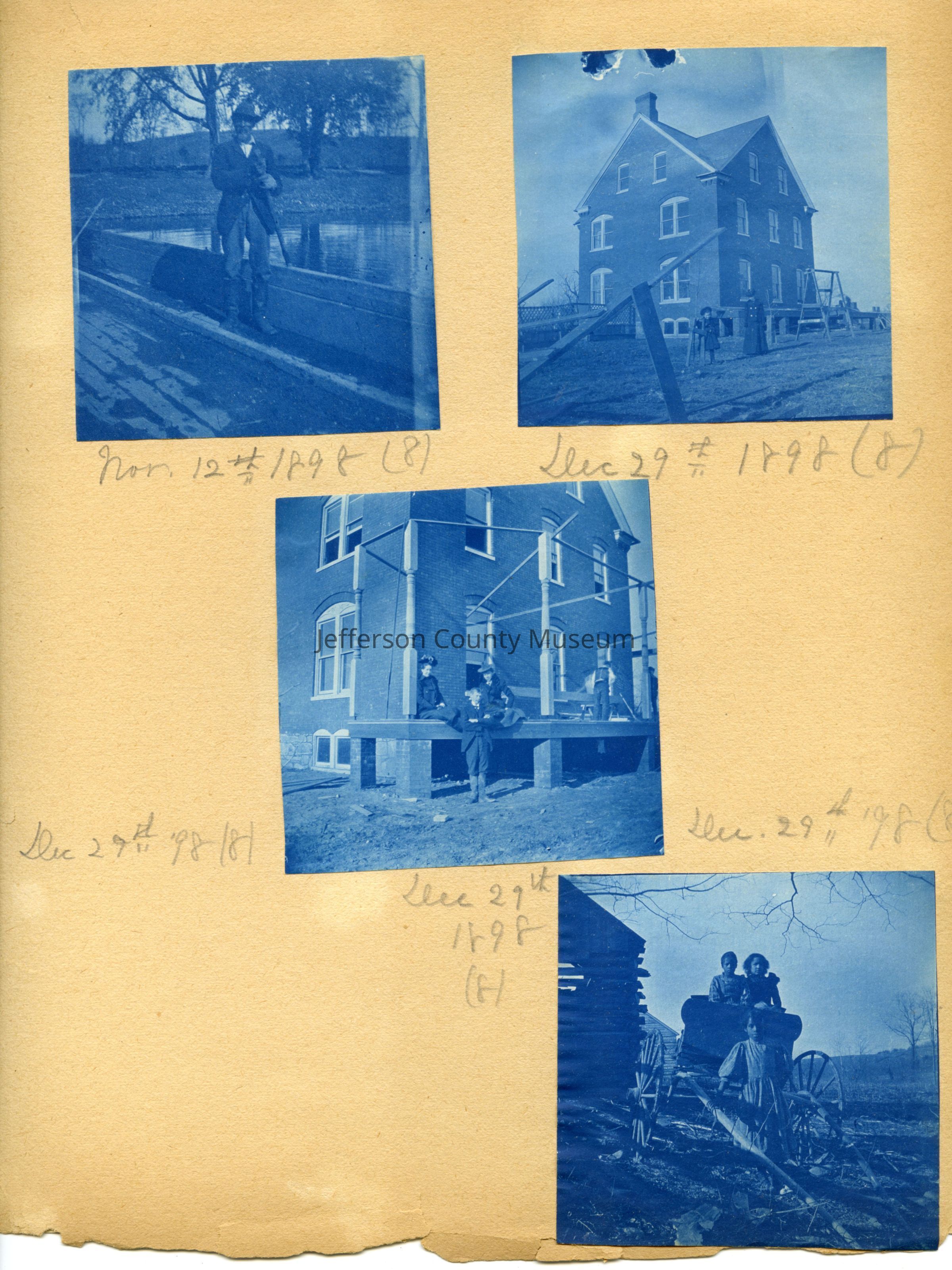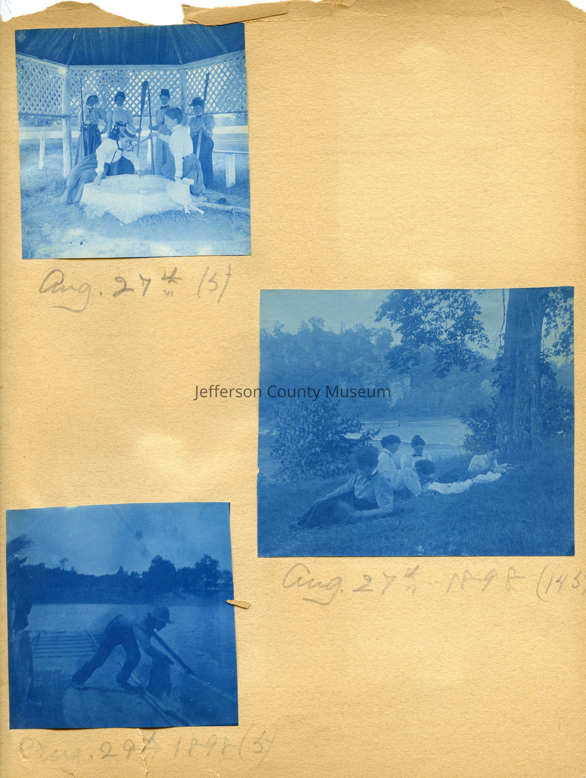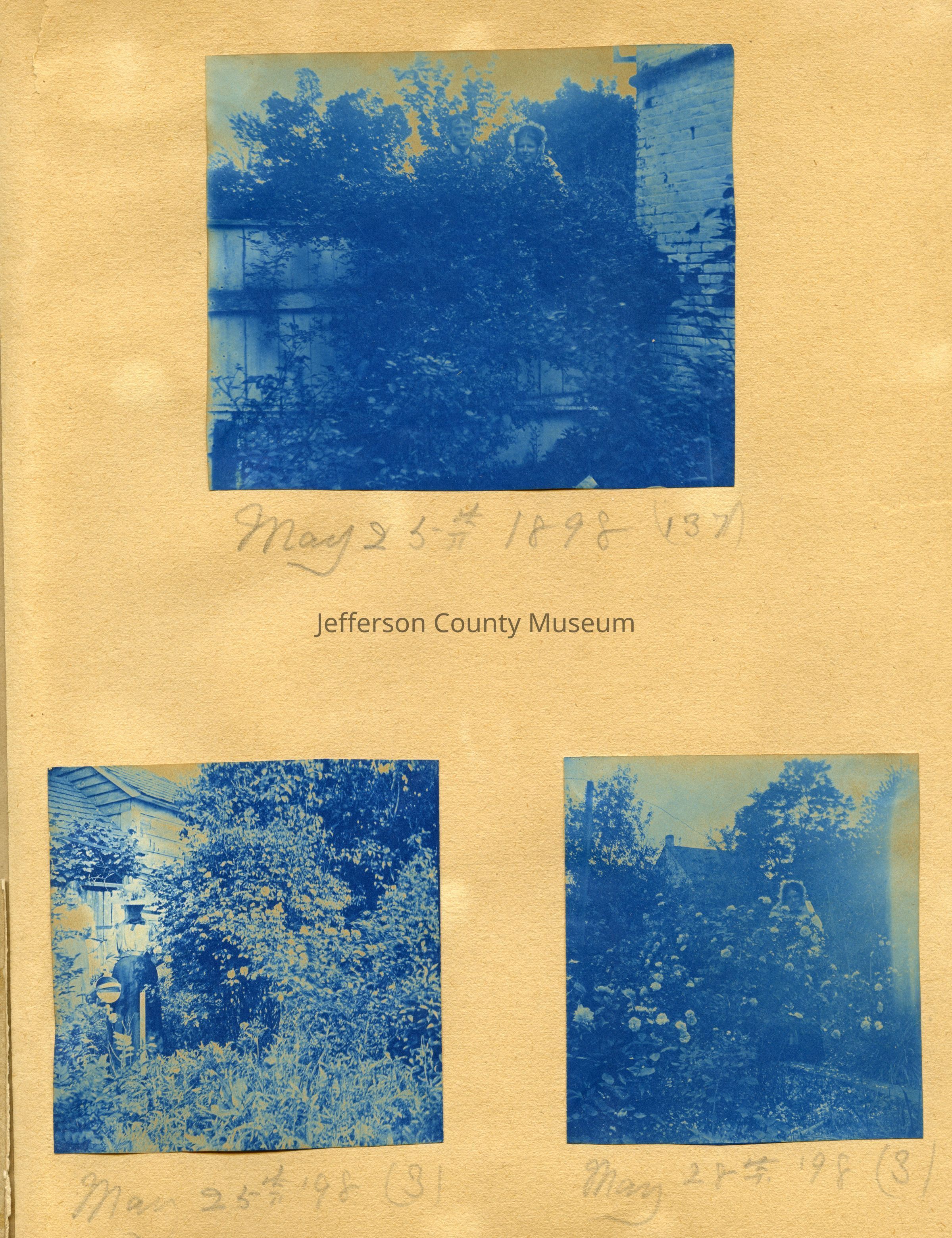 Album 1) Photos dated Feb 1896 to May 14, 1898 (Letty Cary Ambler written inside front cover) (blue & white photos--cyanotypes) (pages are loose and not numbered, 3 photos scanned: Lucy Ambler and 2 men Feb 10, 1896; Harewood Dec 10, 1896 (70); Prato Rio Sep 6, 1897 (111); St. Philip's Sewing School, August 27, 1896)) (All scanned pages are from Album 1).