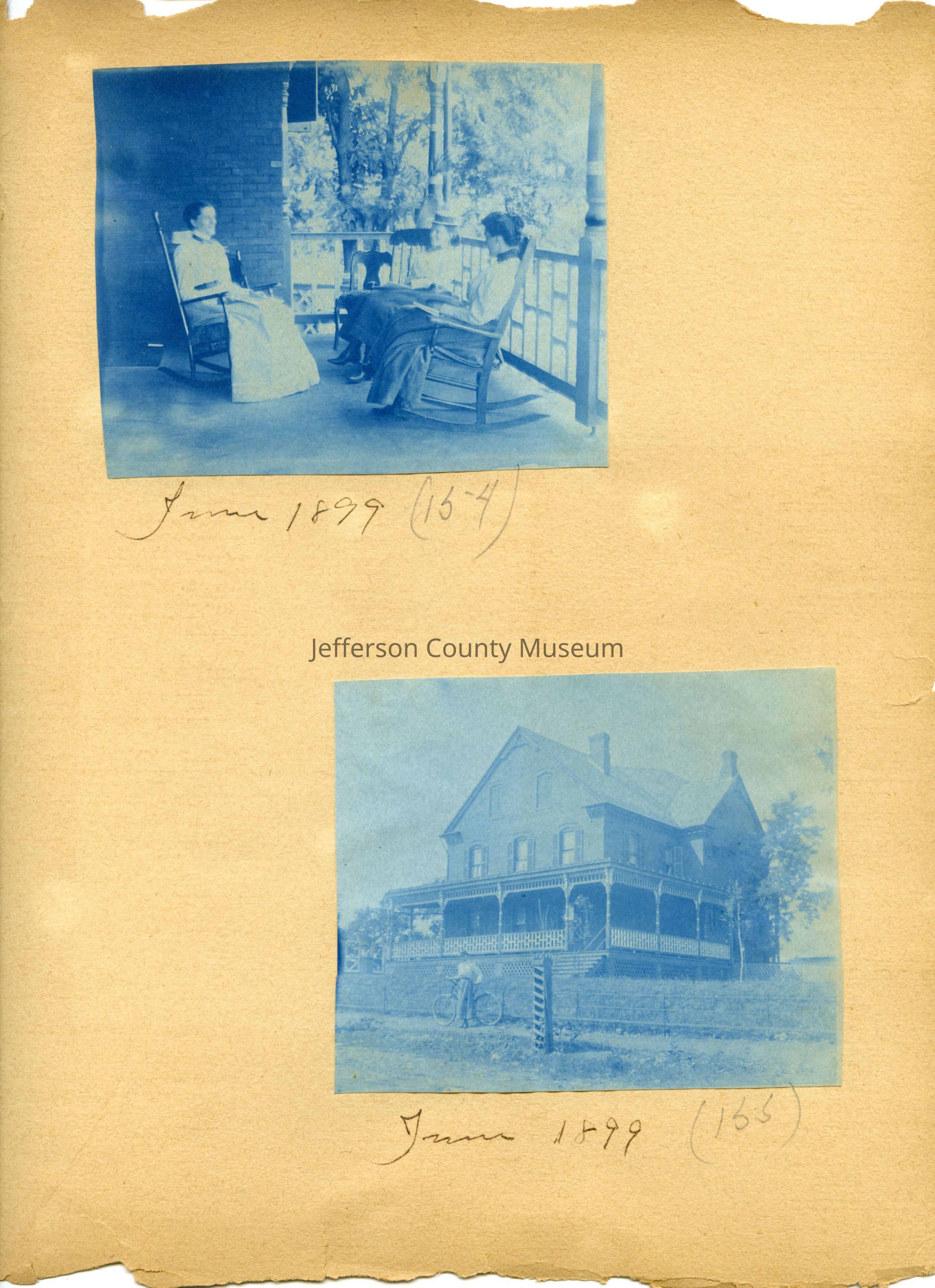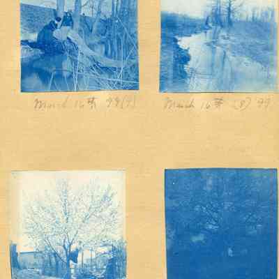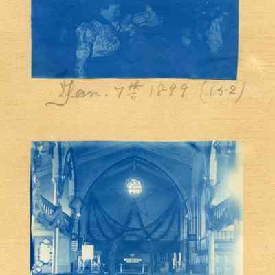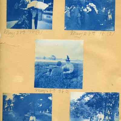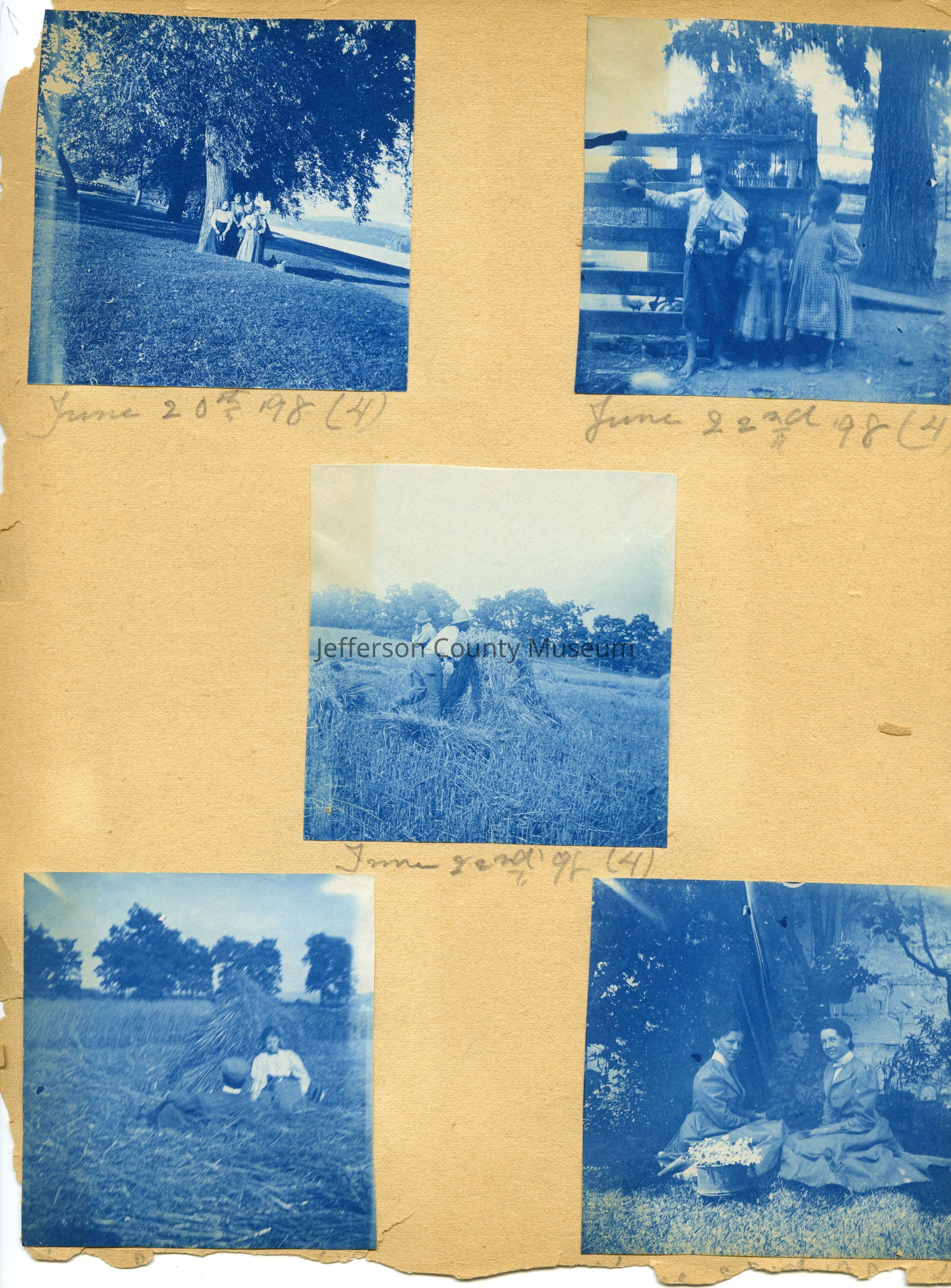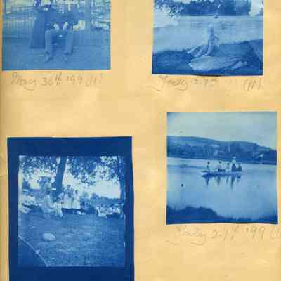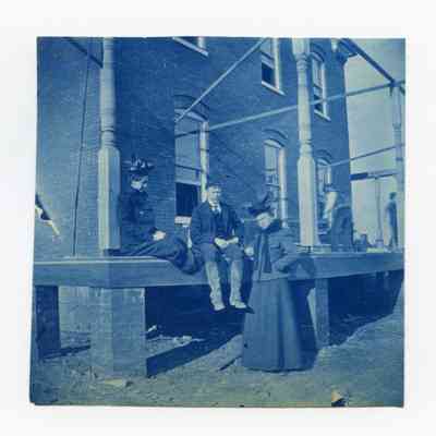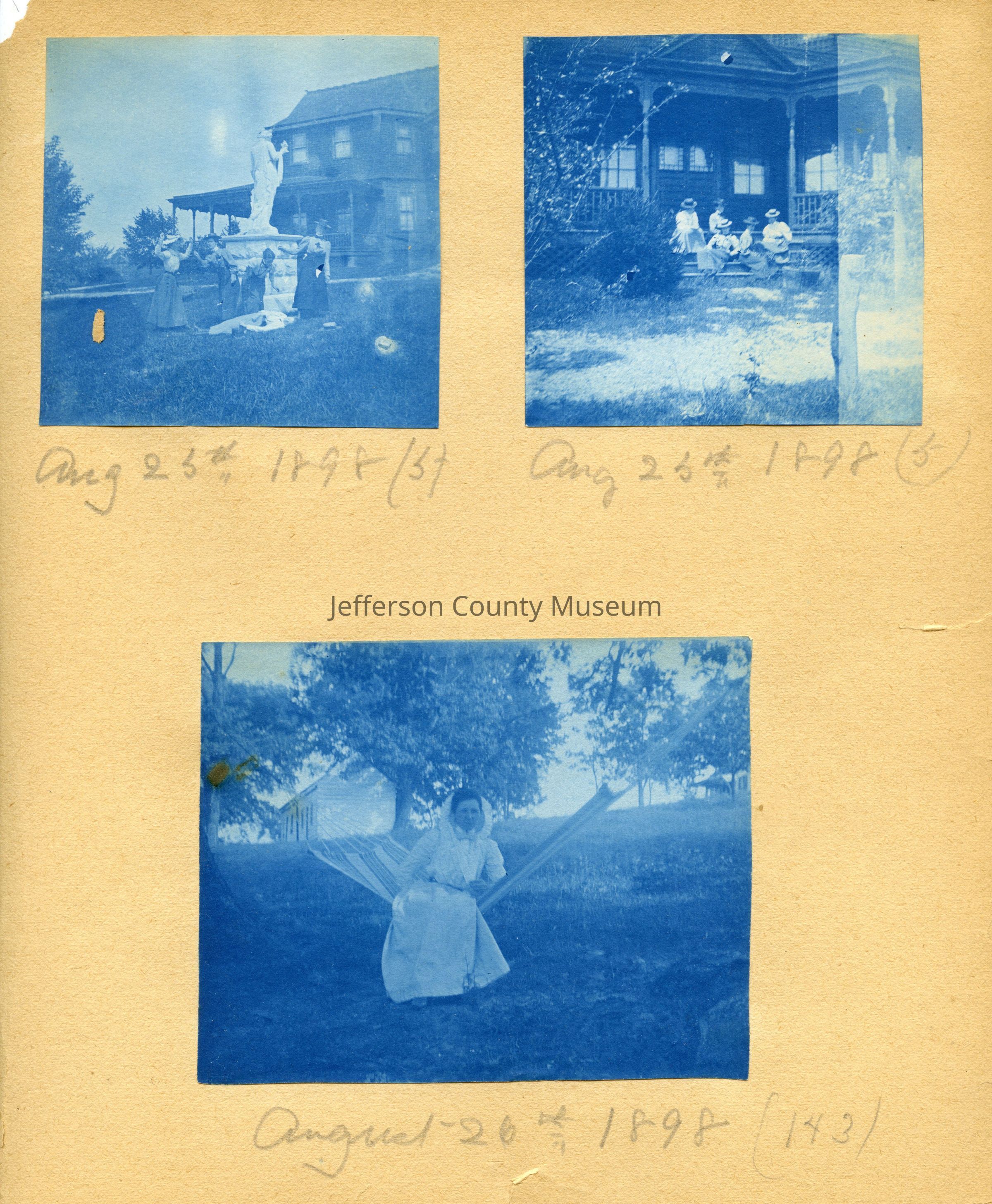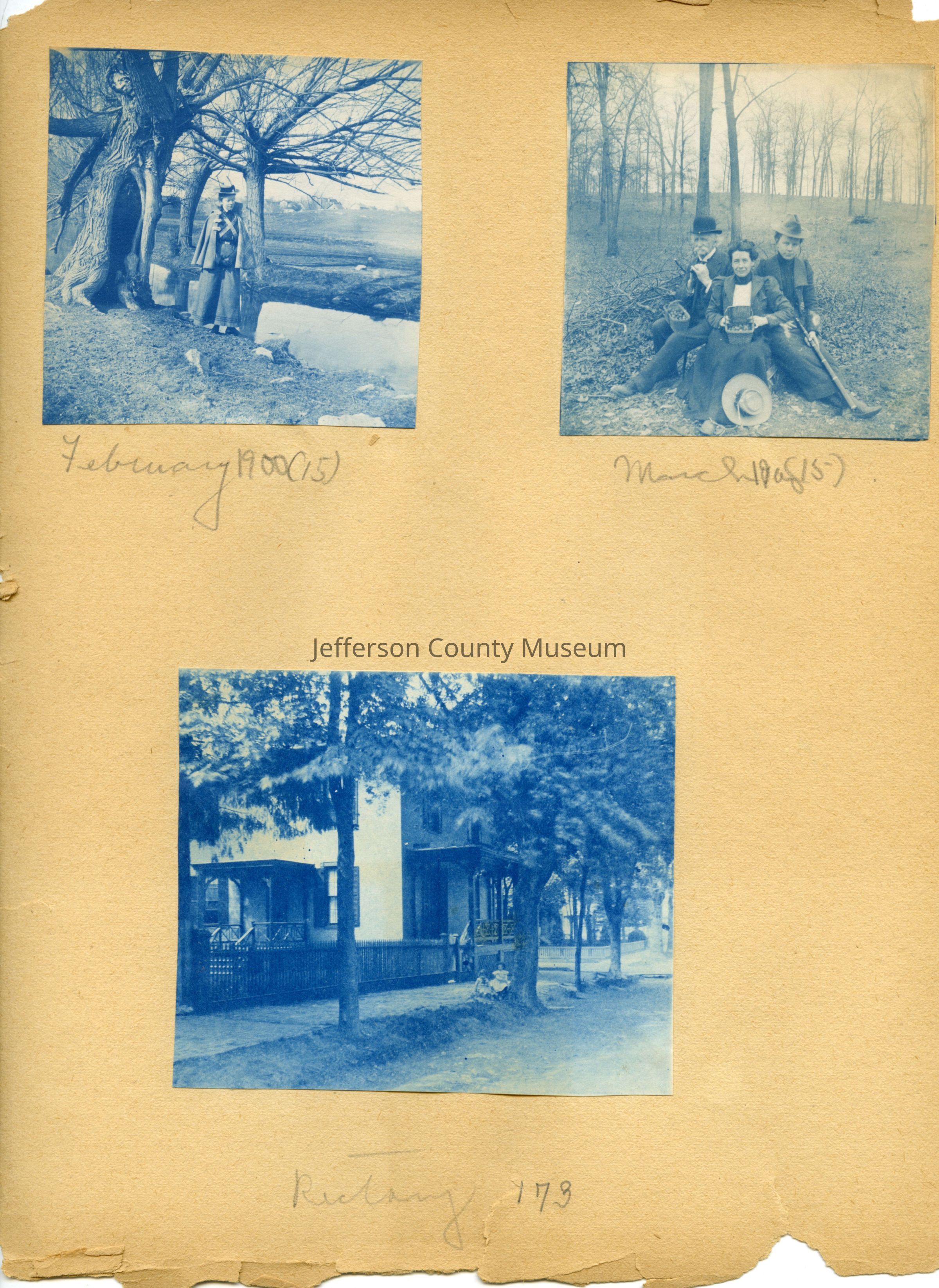 Album 1) Photos dated Feb 1896 to May 14, 1898 (Letty Cary Ambler written inside front cover) (blue & white photos--cyanotypes) (pages are loose and not numbered, 3 photos scanned: Lucy Ambler and 2 men Feb 10, 1896; Harewood Dec 10, 1896 (70); Prato Rio Sep 6, 1897 (111); St. Philip's Sewing School, August 27, 1896)) (All scanned pages are from Album 1).