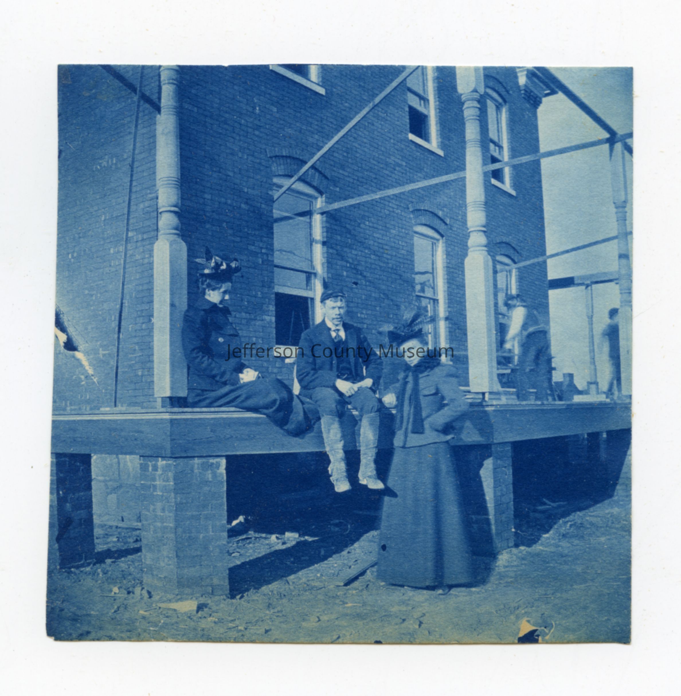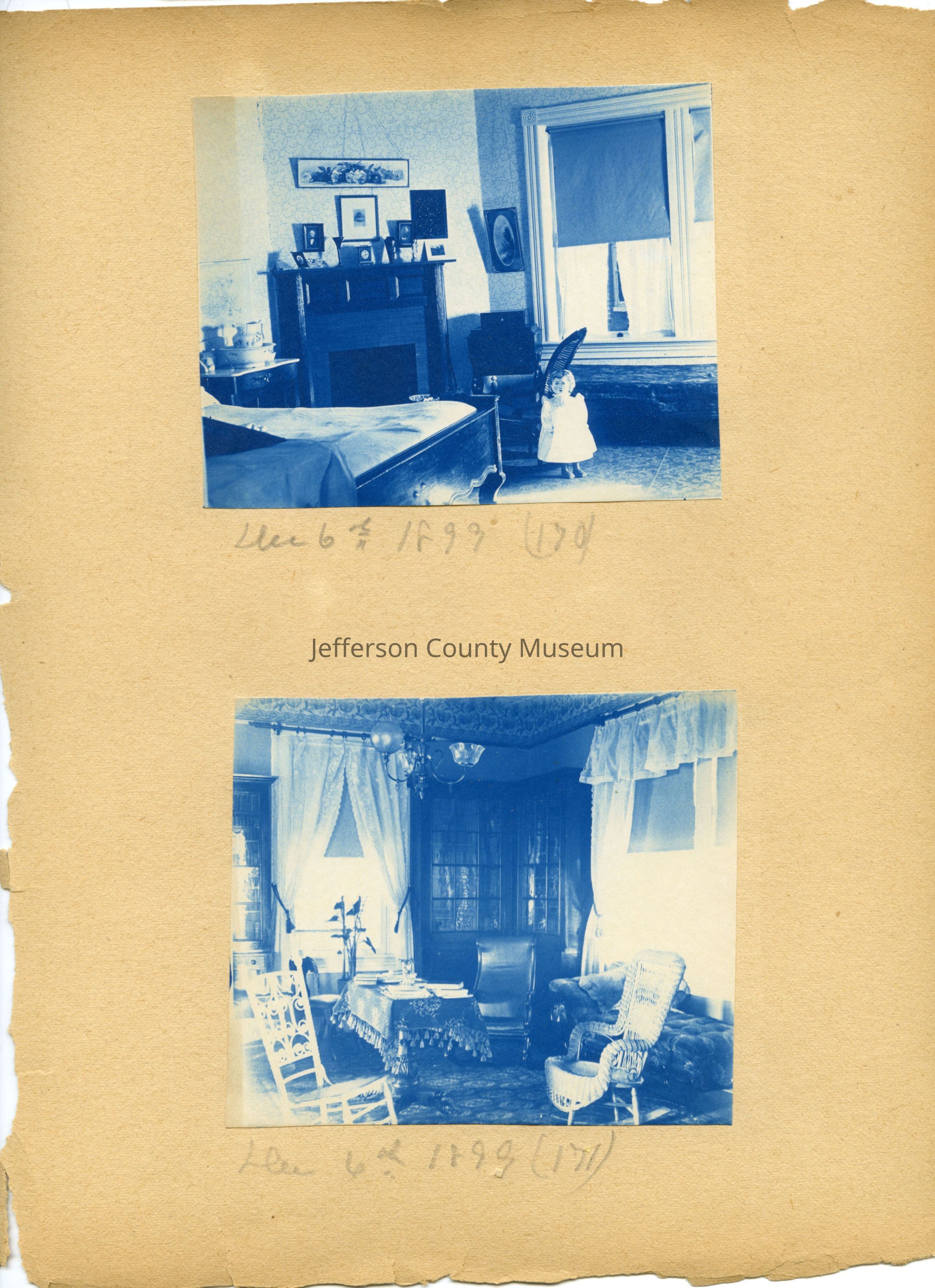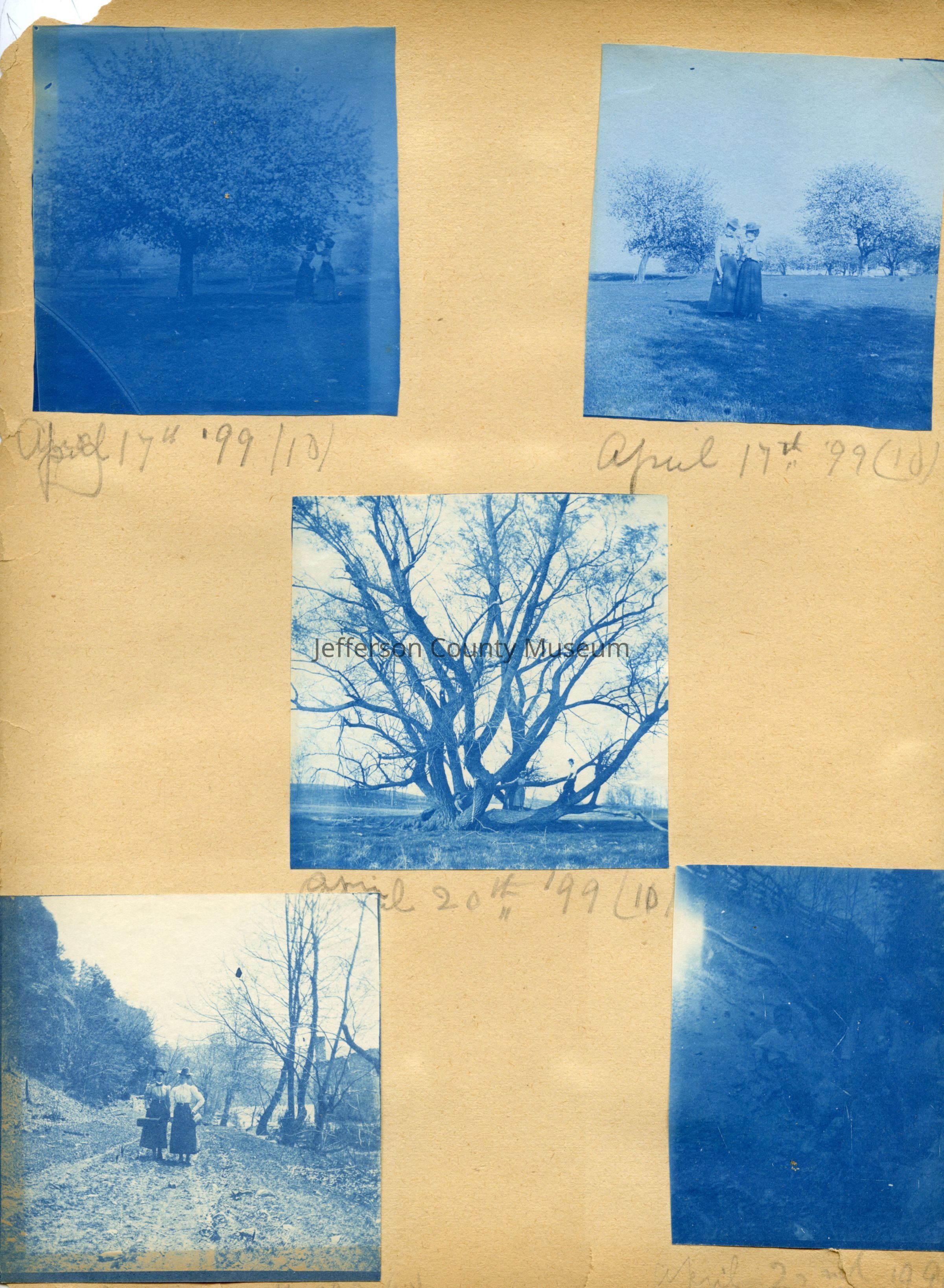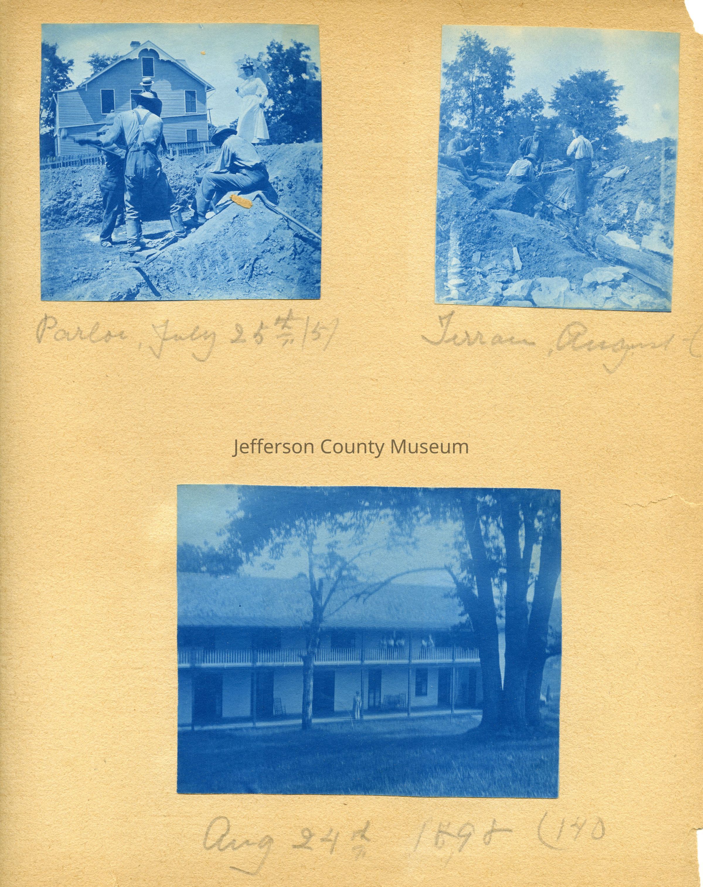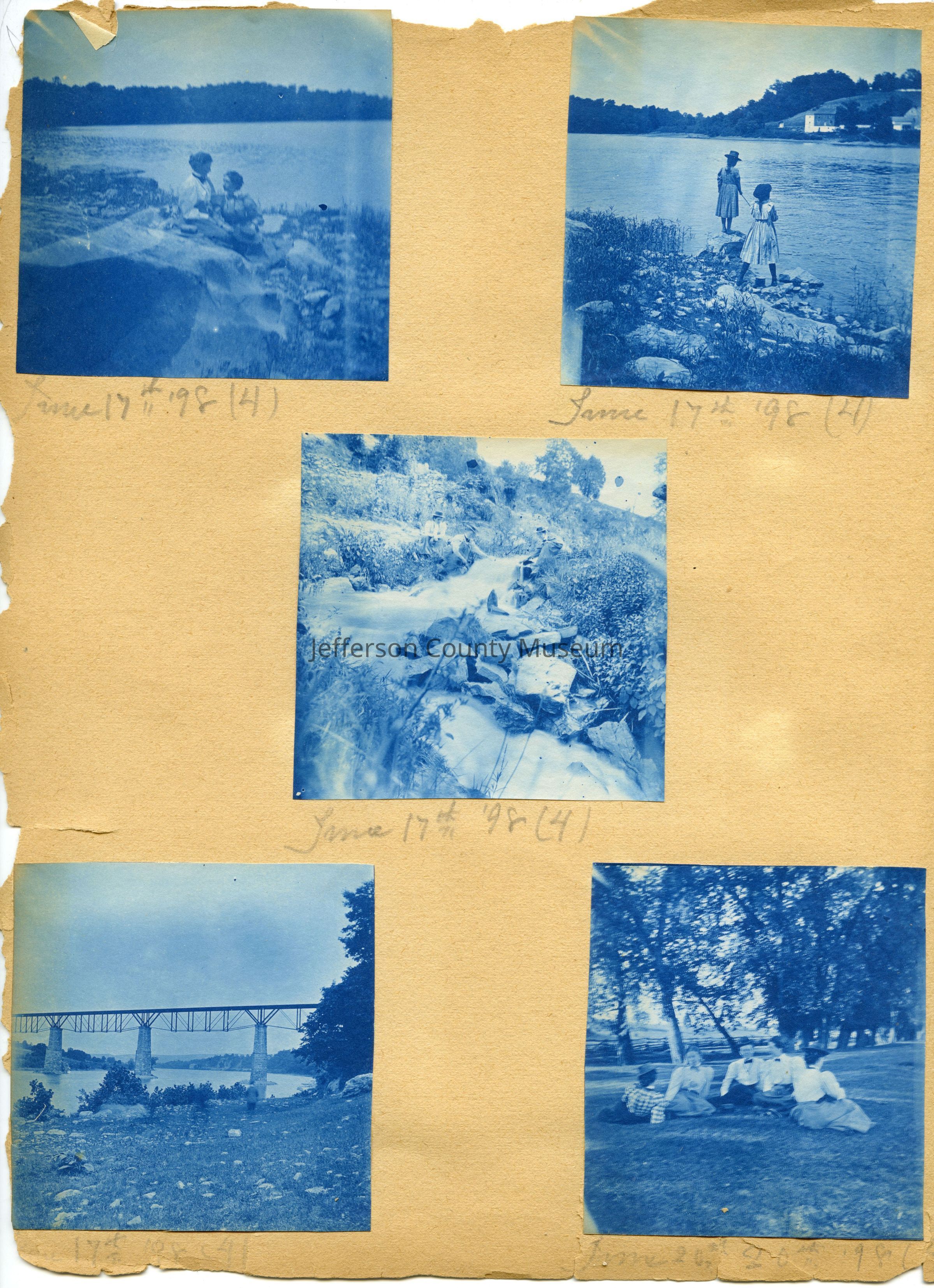 Album 1) Photos dated Feb 1896 to May 14, 1898 (Letty Cary Ambler written inside front cover) (blue & white photos--cyanotypes) (pages are loose and not numbered, 3 photos scanned: Lucy Ambler and 2 men Feb 10, 1896; Harewood Dec 10, 1896 (70); Prato Rio Sep 6, 1897 (111); St. Philip's Sewing School, August 27, 1896)) (All scanned pages are from Album 1).
