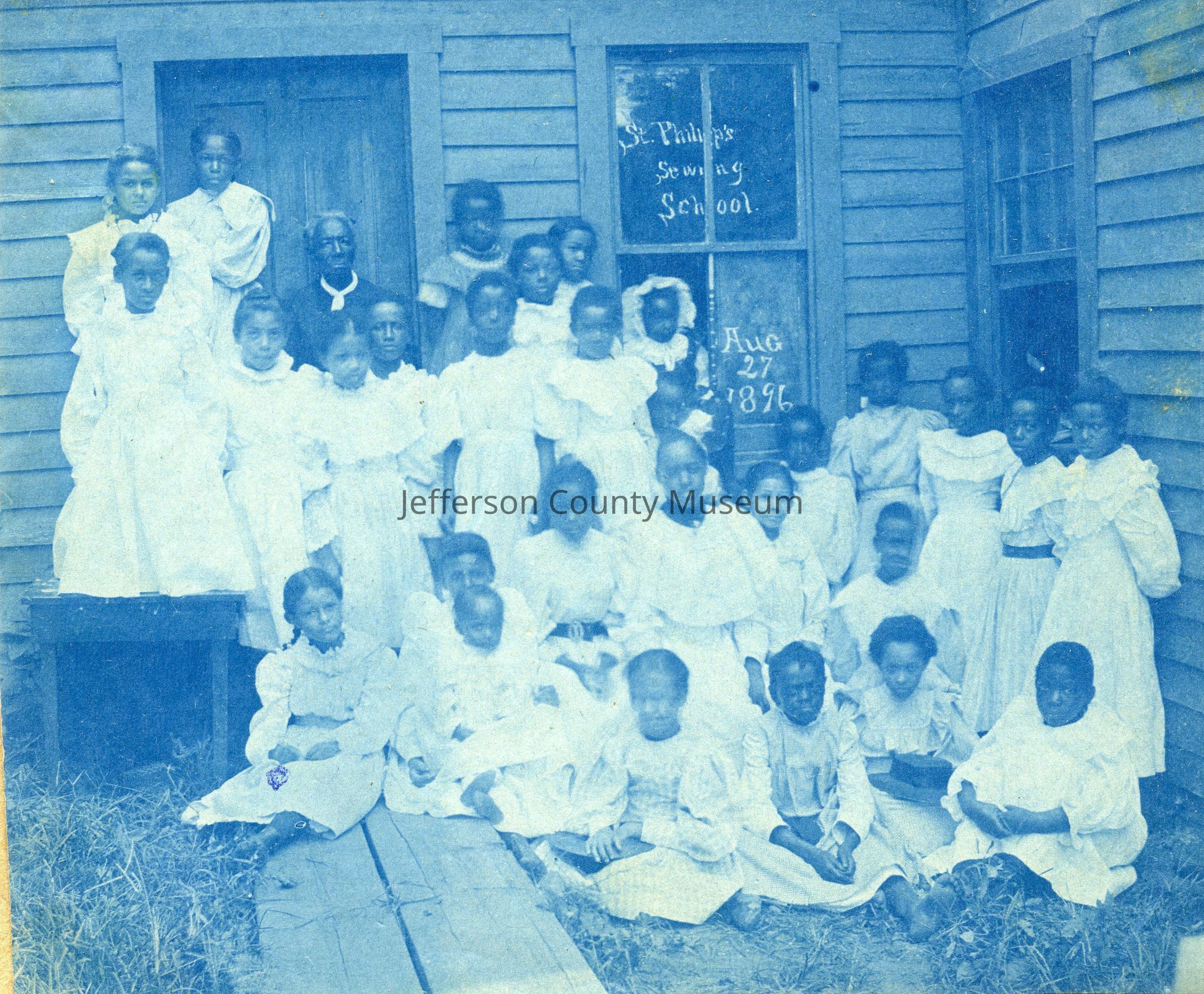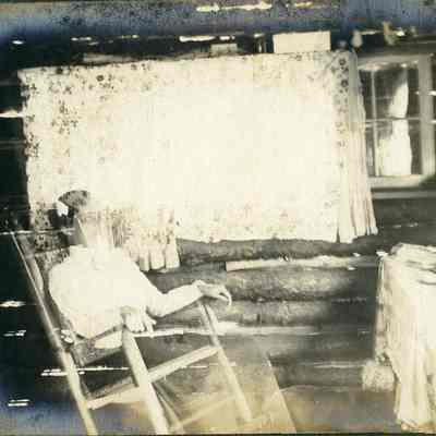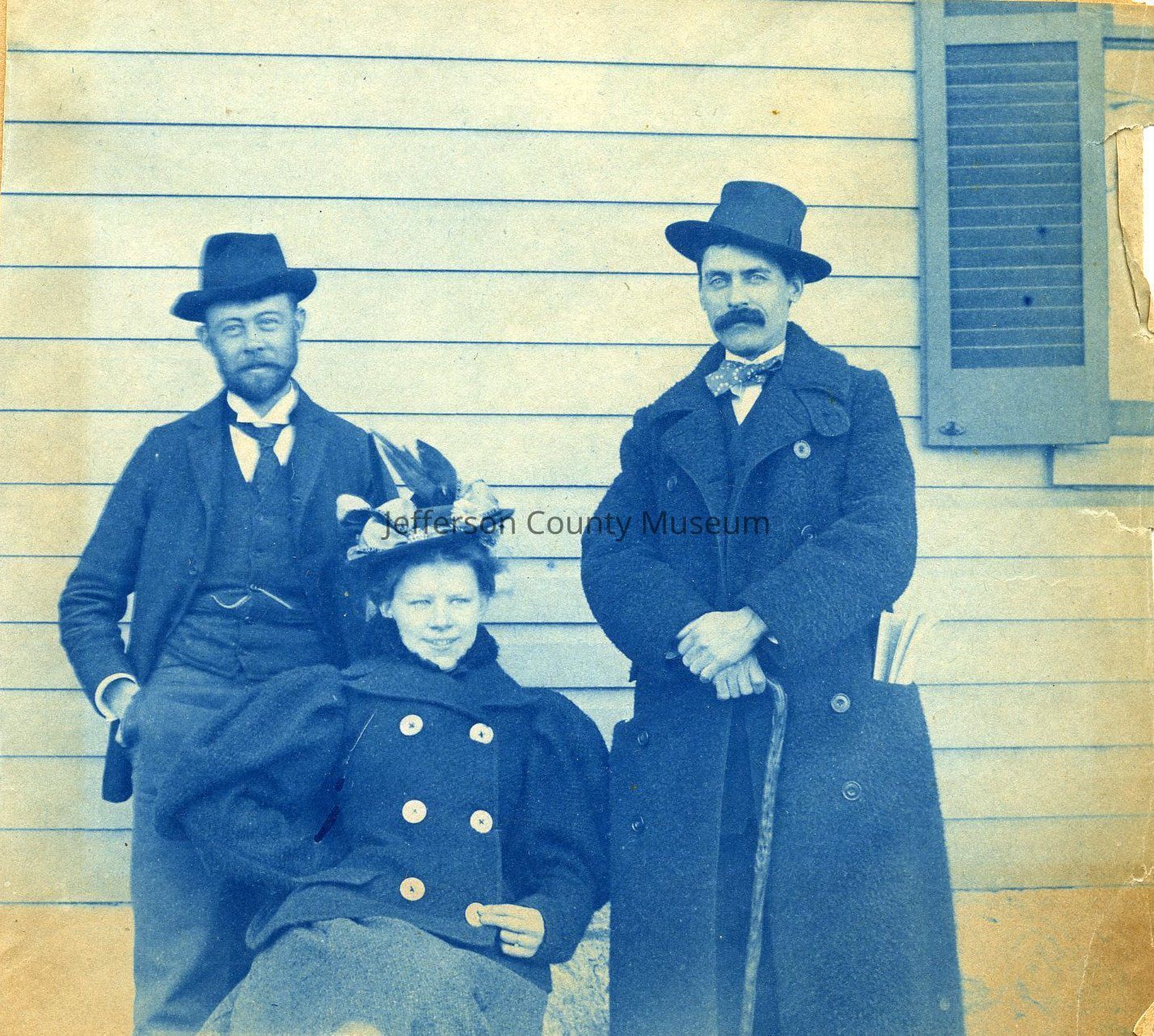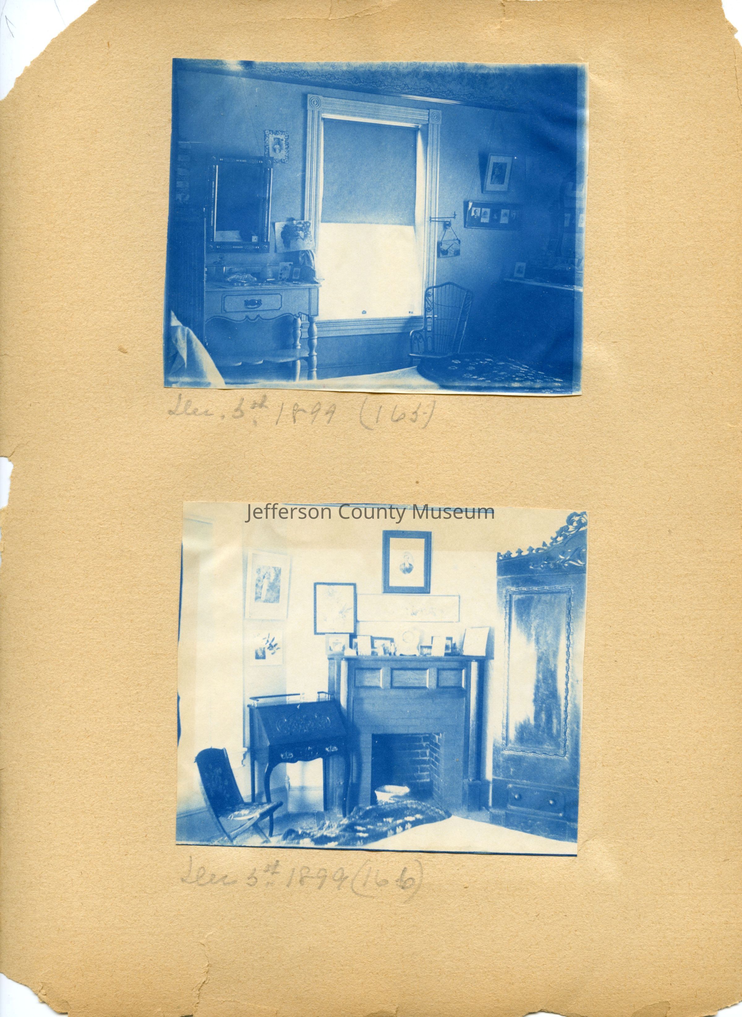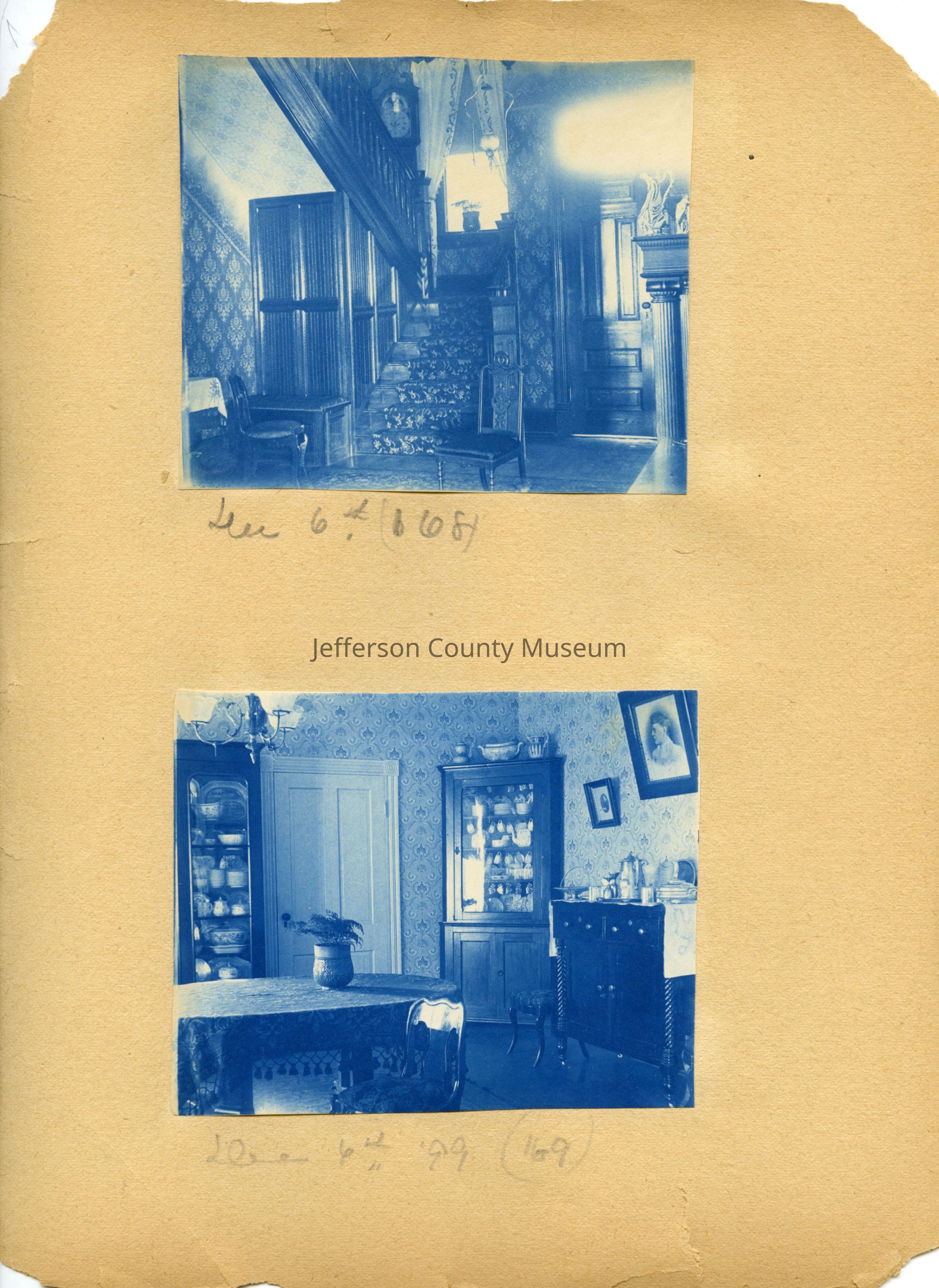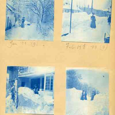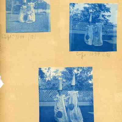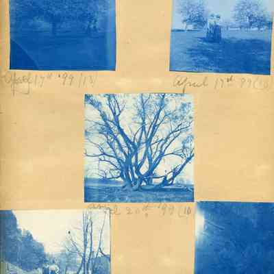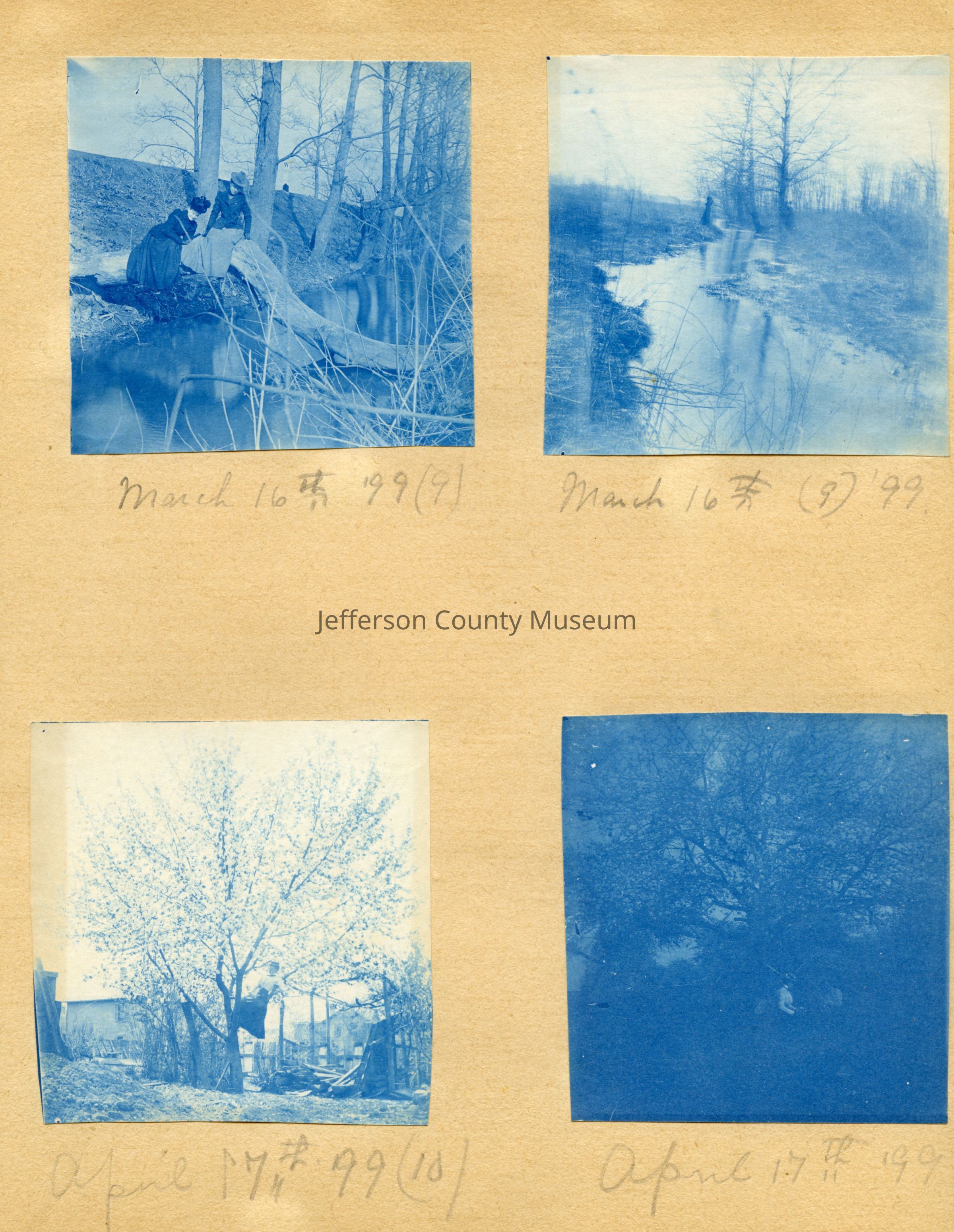 Album 1) Photos dated Feb 1896 to May 14, 1898 (Letty Cary Ambler written inside front cover) (blue & white photos--cyanotypes) (pages are loose and not numbered, 3 photos scanned: Lucy Ambler and 2 men Feb 10, 1896; Harewood Dec 10, 1896 (70); Prato Rio Sep 6, 1897 (111); St. Philip's Sewing School, August 27, 1896)) (All scanned pages are from Album 1).