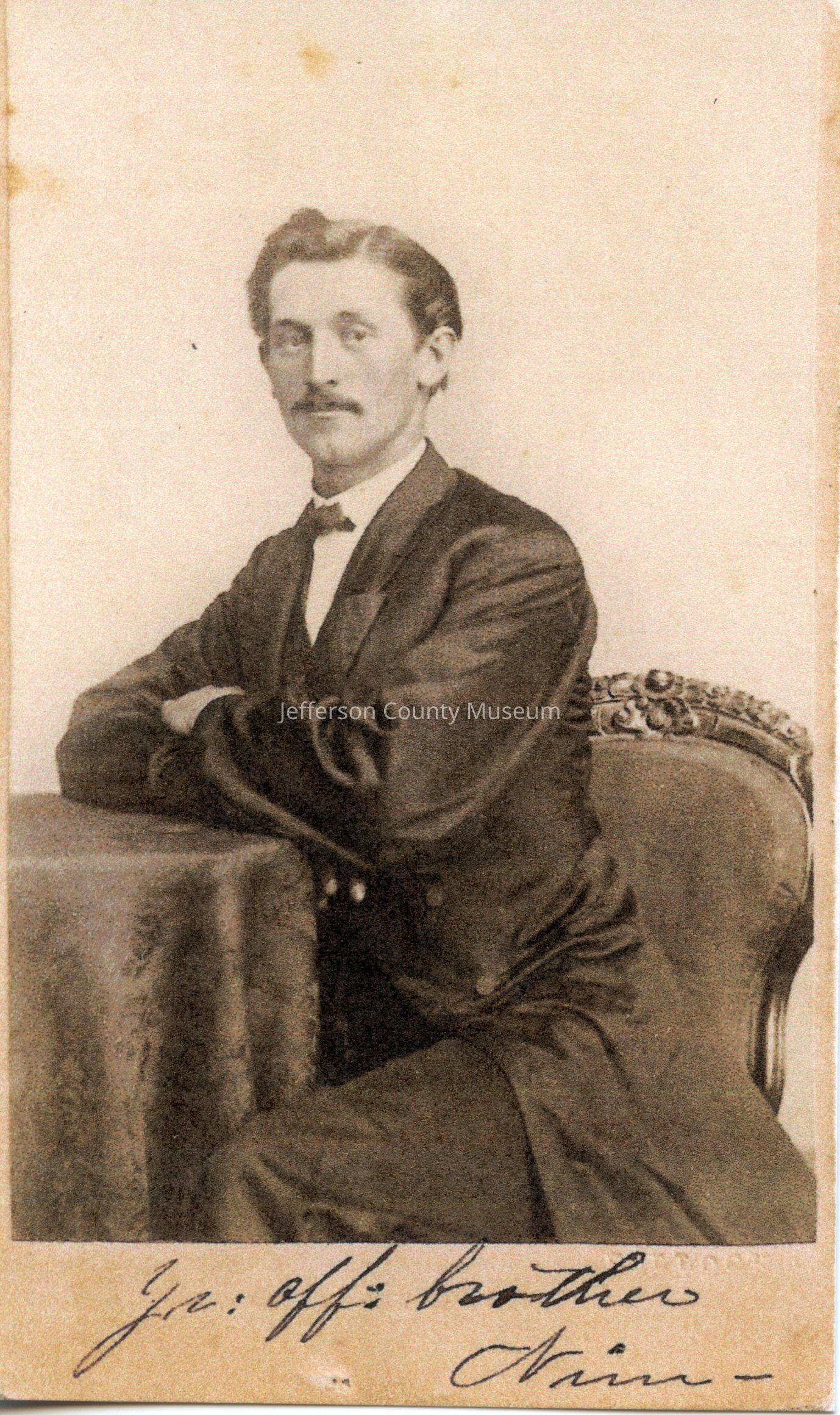 Nimrod A. Ware. He is seated with his arms folded and leaning on a table. Has on black frock coat and vest and has a moustache. At bottom in script "Yr: aff. brother Nim--Acquisition