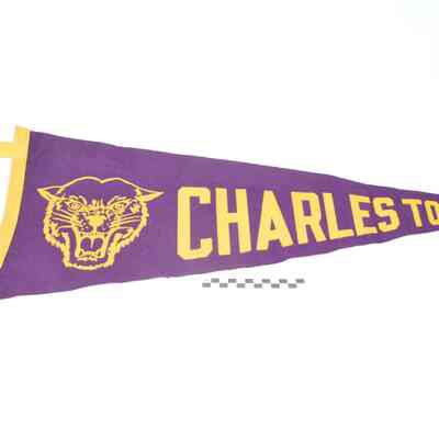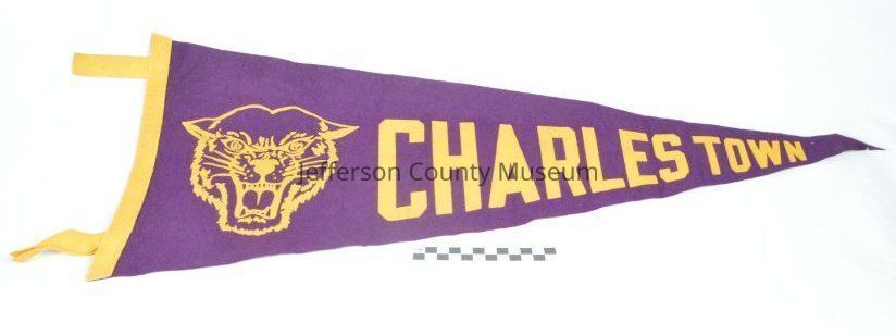 (a) Purple felt pennant with CHARLES TOWN spelled out in yellow paint, at the large end of the pennant is the face of a panther in yellow paint. Yellow felt border along large end of pennant. 11.75" along large end of pennant; approximately 28" in length.