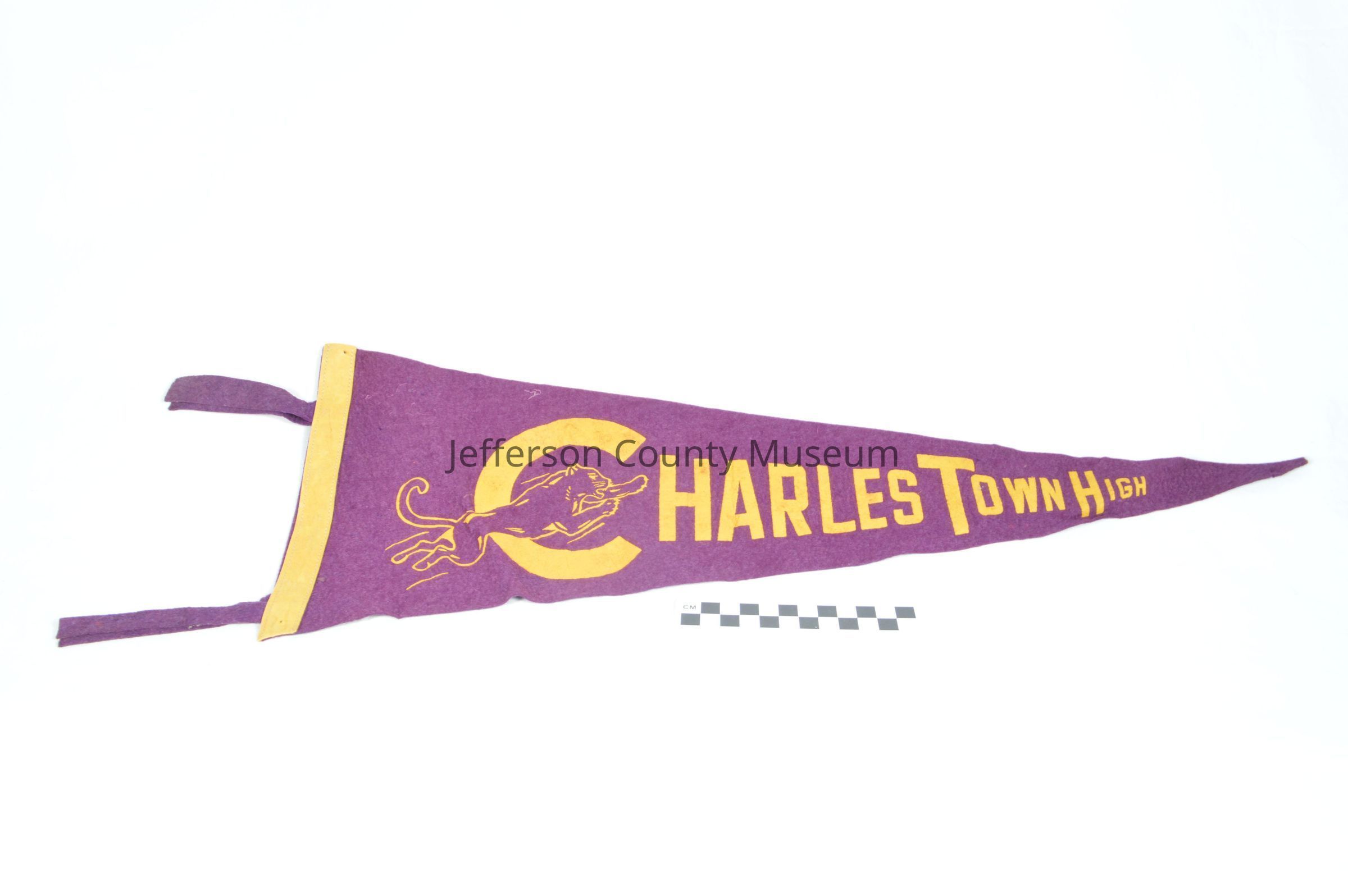(b) Purple felt pennant with CHARLES TOWN HIGH spelled out in yellow paint; a leaping panther is outlined in yellow paint and is leaping through the "C" in Charles Town. Yellow felt border along large end of pennant. 8 & 5/8" along large end of pennant; approximately 23" in length.Acquisition
