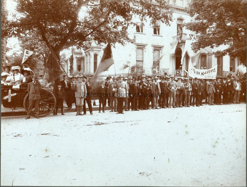 Group on street standing in front of large house. Several are carrying Confederate flags. The second flag from the left may be the 2nd National Confederate flag, the Stuart Artillery flag on display in the museum. Roger Preston Chew appears behind and to the left of the flag holder.