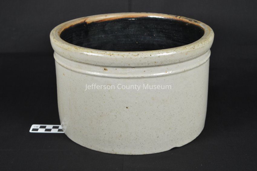 Glazed stoneware crock, beige exterior with dark brown interior, no decoration or markings. Three small indentations around outside of bottom. Crock is an example of pottery widely used by local families for everyday food production and storage in the 19th and early-to-mid 20th centuries.Acquisition