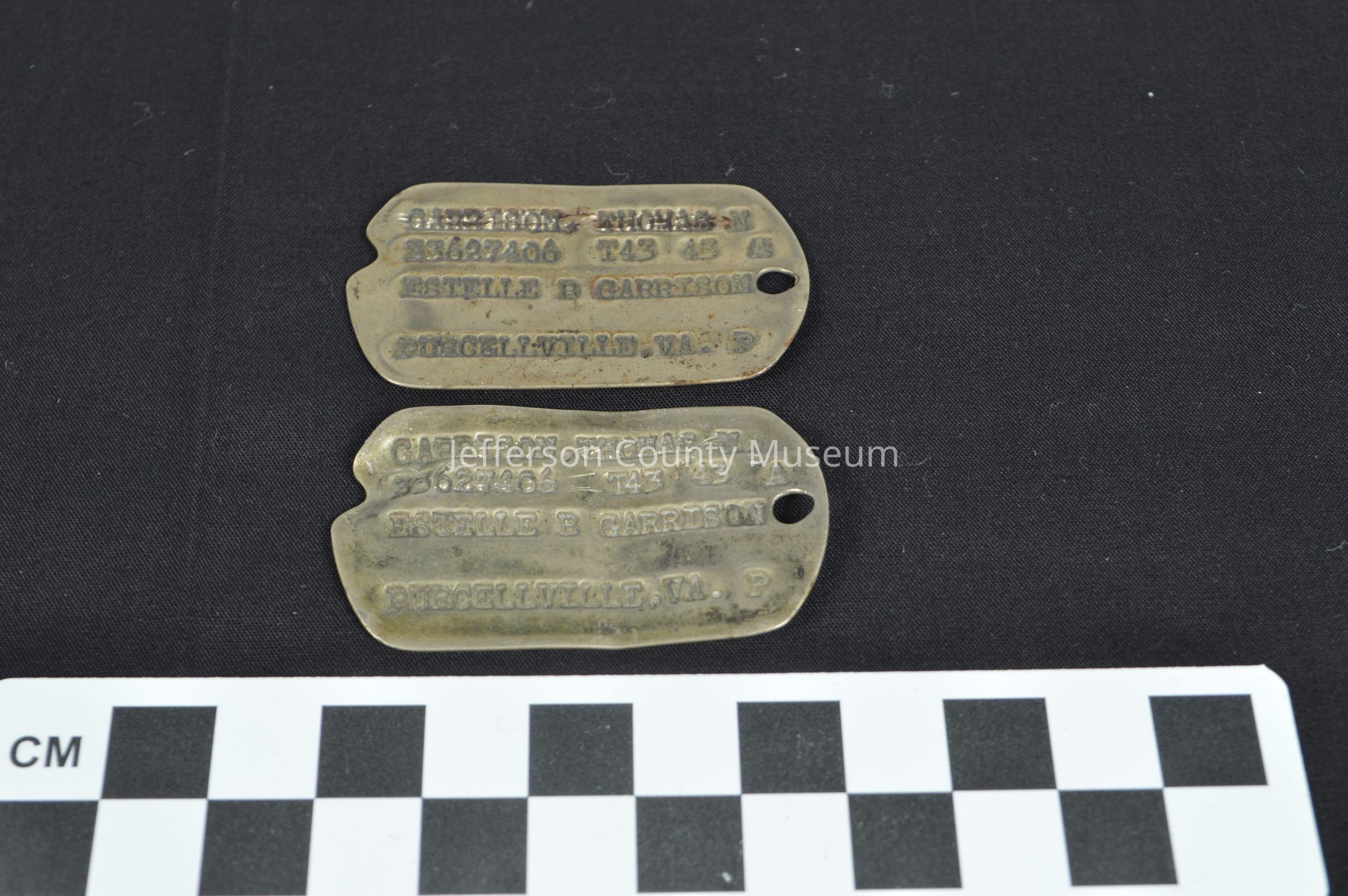 Two identical dog tags (2072-a and 2072-b), World War II era, belonging to "Thomas N. Garrison, 33627406 T43 43 A, Estelle B. Garrison, Purcellville, VA. P". Hole in center of one edge for hanging from a chain. Small indentation on opposite edge.Acquisition
