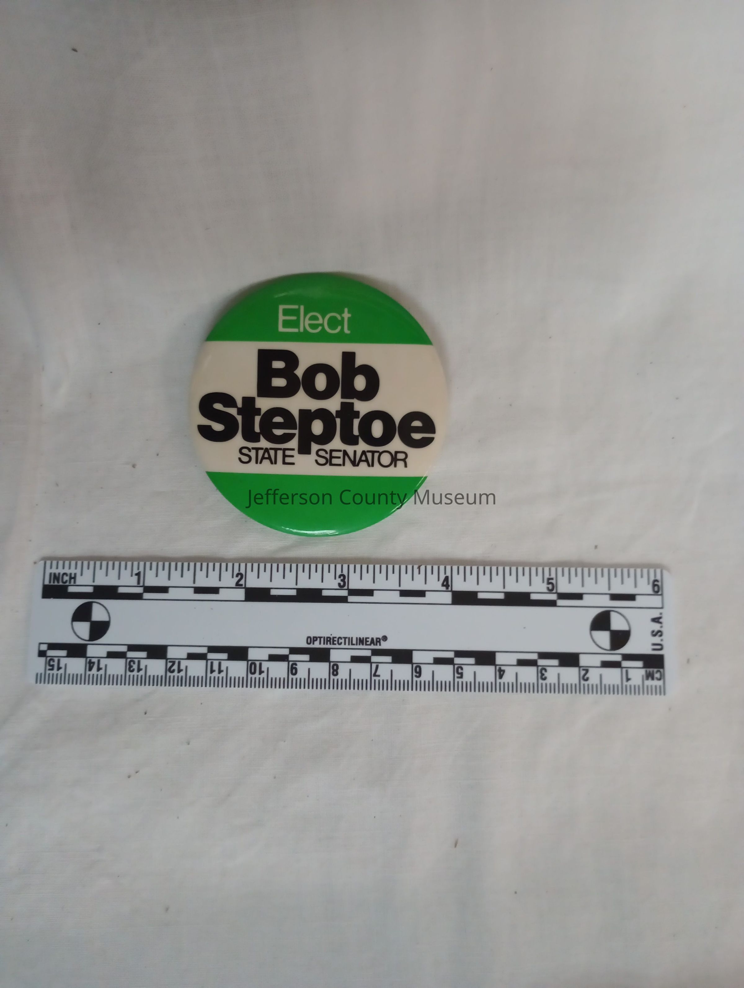 Green and white campaign button with the text "Elect Bob Steptoe State Senator"Context