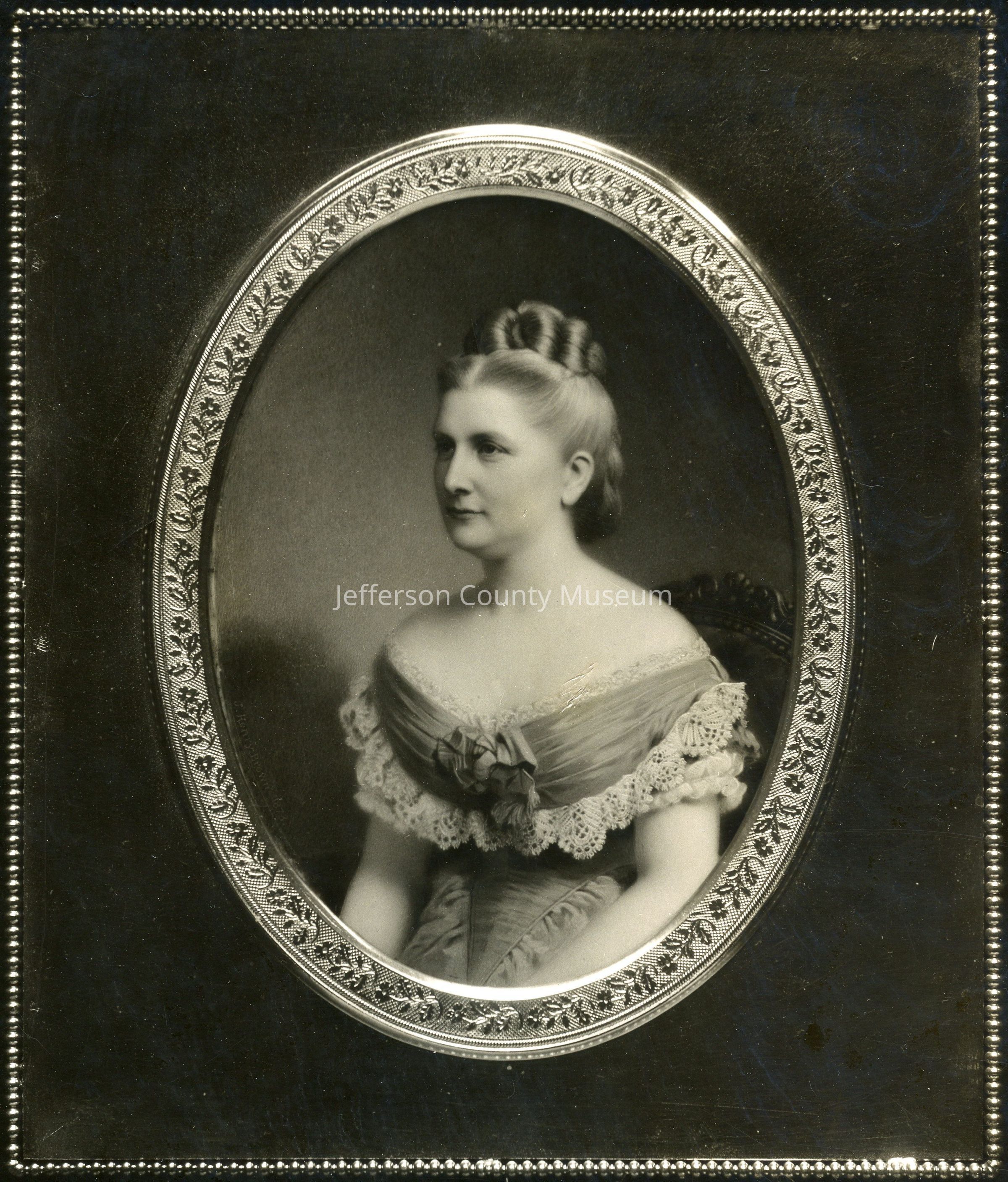 Harriet Lane Johnston wearing an evening gown with lace fringe and large bow. Hair on top of head is coiled in a bun arrangement. Gold colored frame. Picture is on black paper.Photograph Details