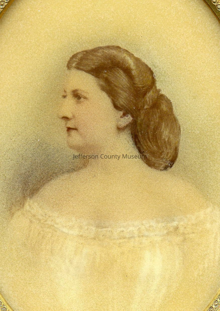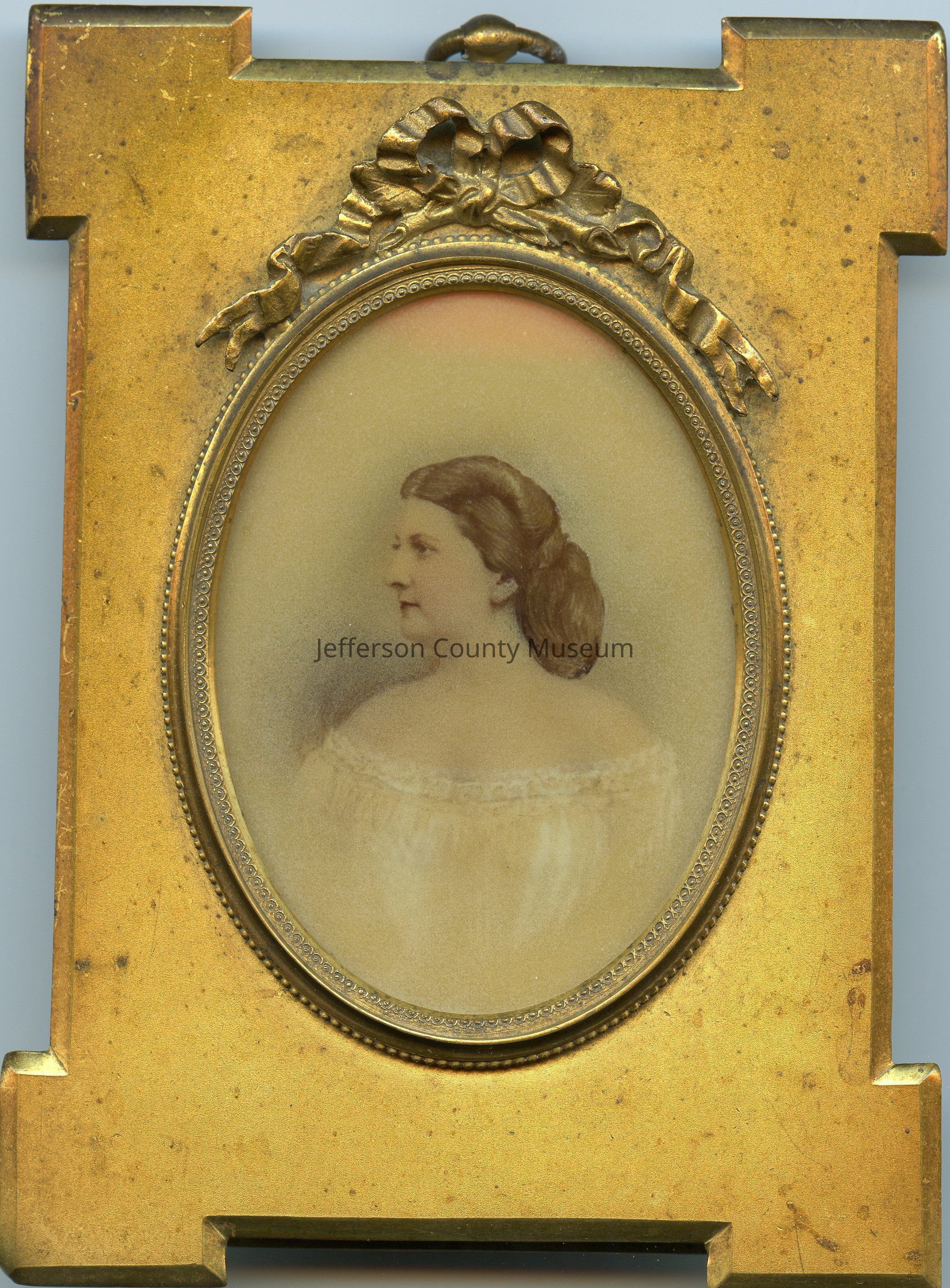 Harriet Lane. Painting on porcelain. Frame is gold colored metal with bow design at top and round hook at top.Acquisition