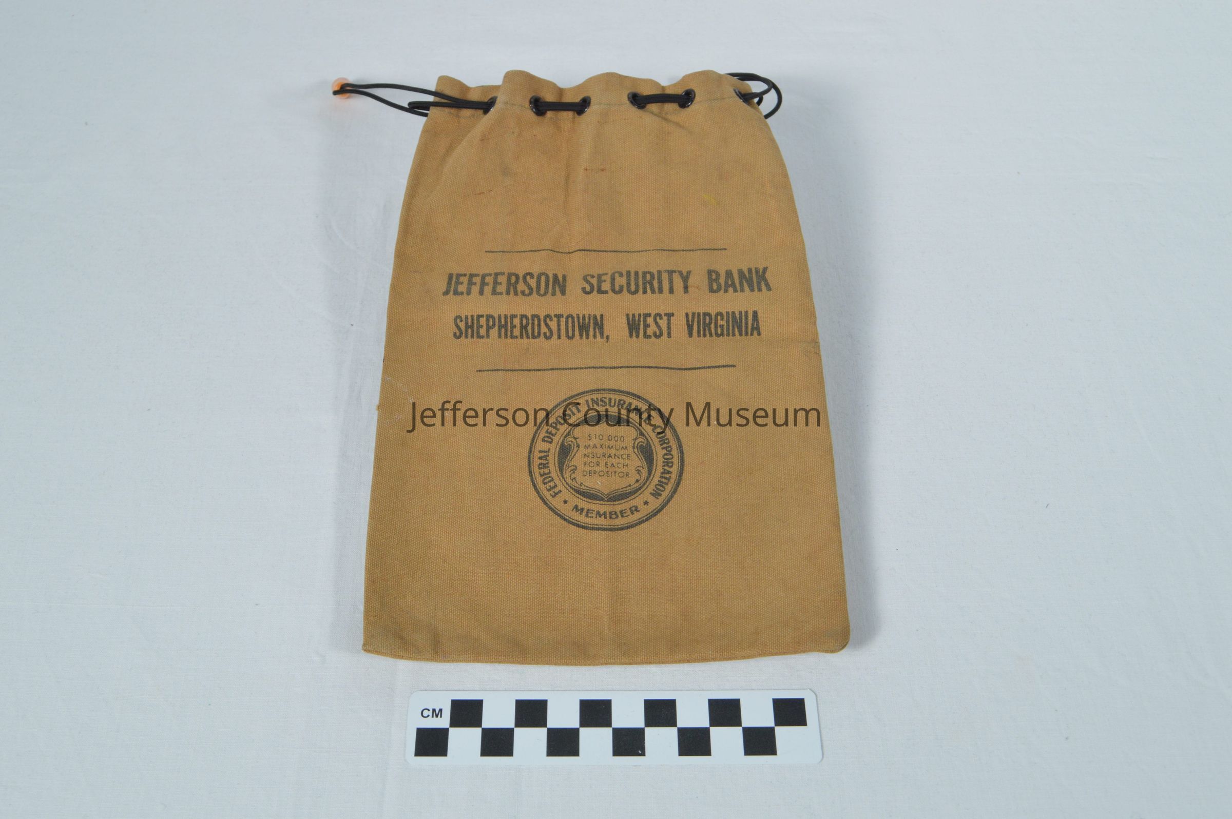 Brown canvas drawstring bag stamped "JEFFERSON SECURITY BANK / SHEPERDSTOWN, WEST VIRGINIA". Below name of bank is "FDIC" logo. Handwritten in ink on reverse: "Receipts - / M___ & Fitzgerald /___ - 72". Sewn inside is white label: "A. RIFKIN & CO."Acquisition