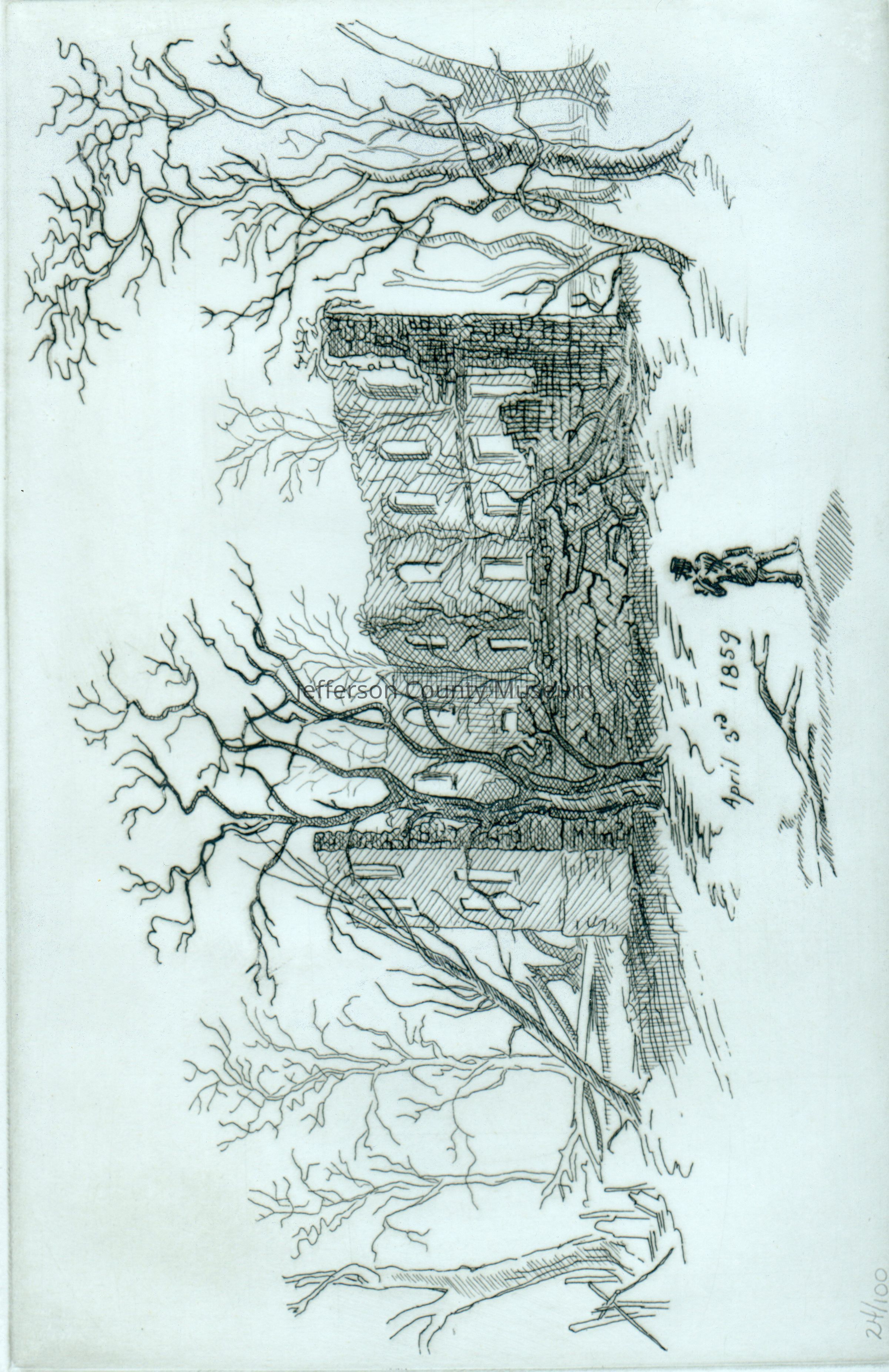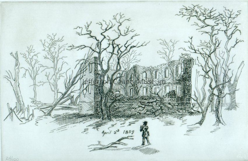 Framed Reproduction of drawing of St. George's Chapel in black wood frame. David Hunter Strother (Porte Crayon) made the original pen and ink drawing. Dated "April 3rd 1859" near bottom.Acquisition