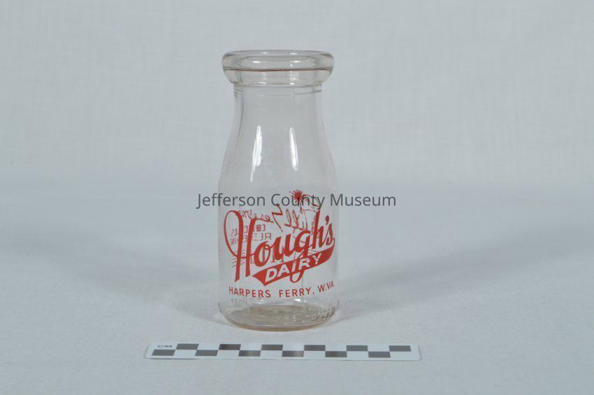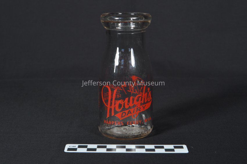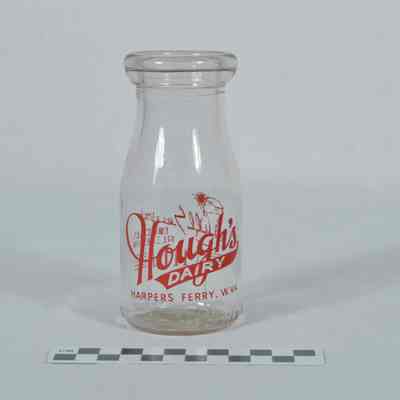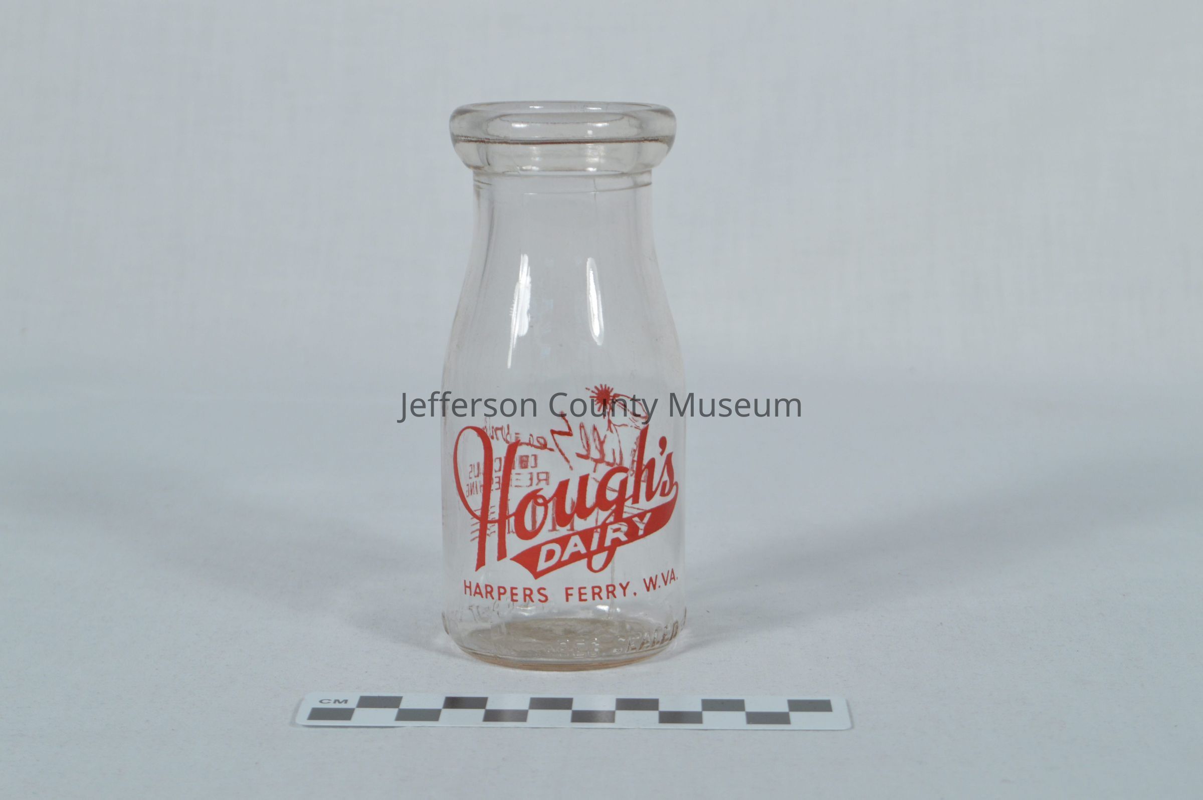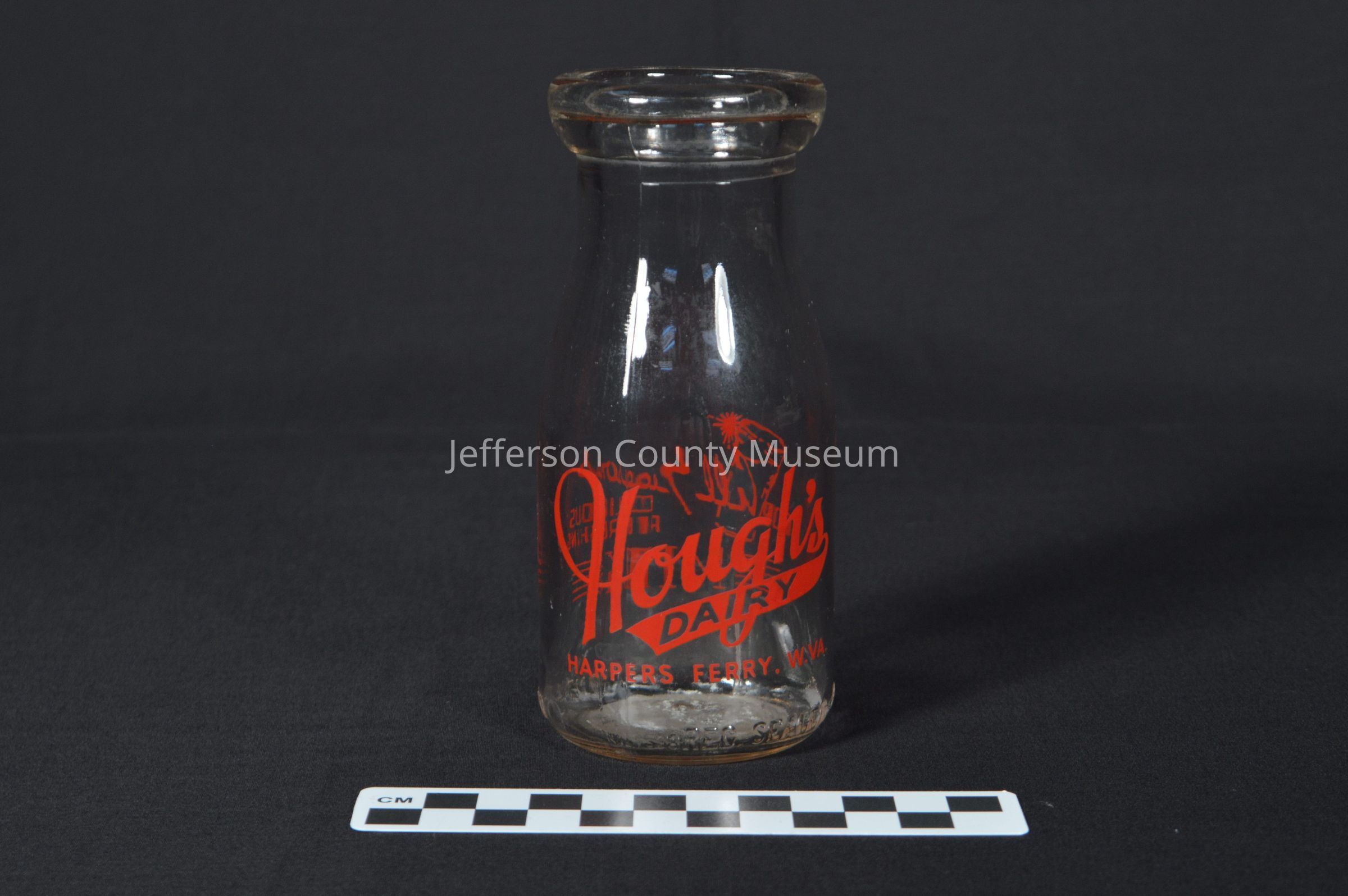 Cream bottle from Hough's Dairy. Clear glass with red lettering: "Hough's Dairy / HARPERS FERRY, W.VA." Below that, in clear, raised letters: REG. SEALED". On opposite side of bottle, in red letters: "For All Seasons / DELICIOUS / REFRESHING / MILK". Below that, in clear, raised letters: "HALF PINT LIQUID". On bottom, in clear, raised letters: " X / 17 [plant where manufactured] 53 [year of manufacture]" and below that in script: "Duraglas".Acquisition