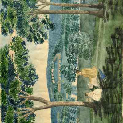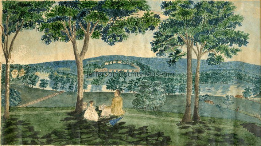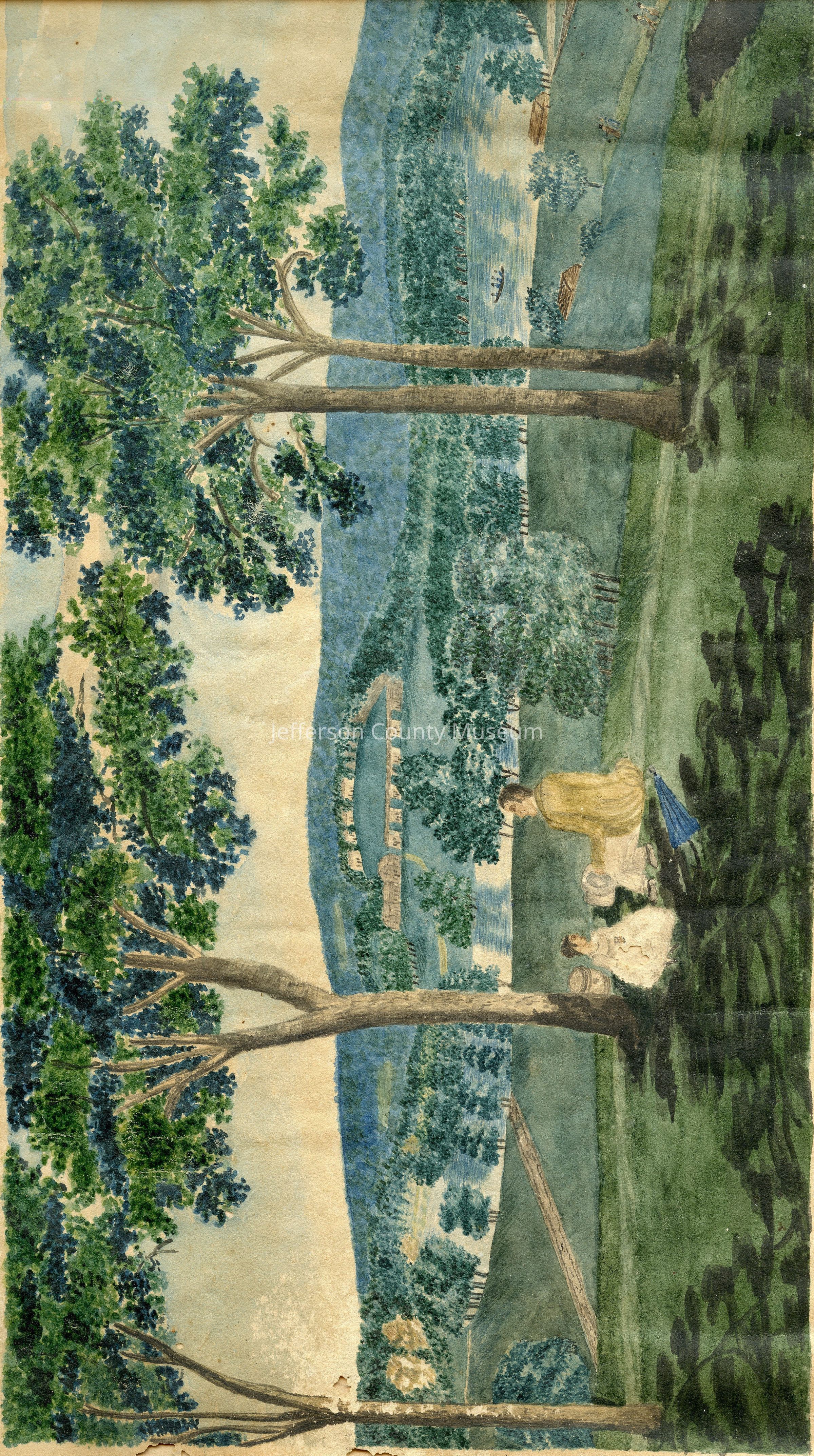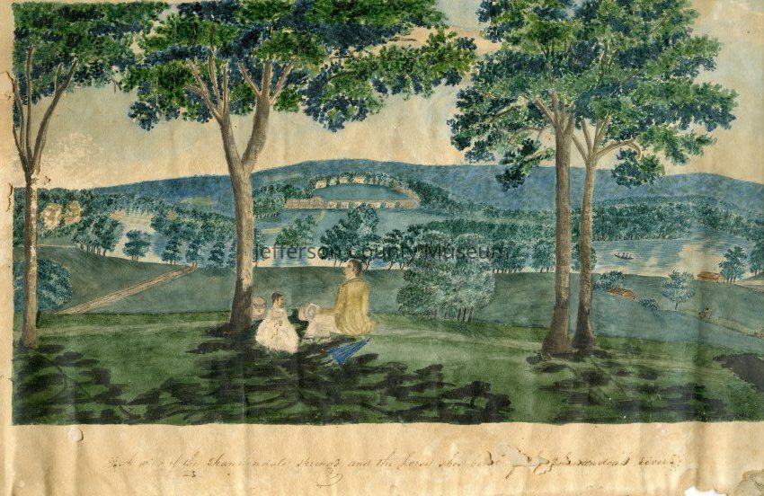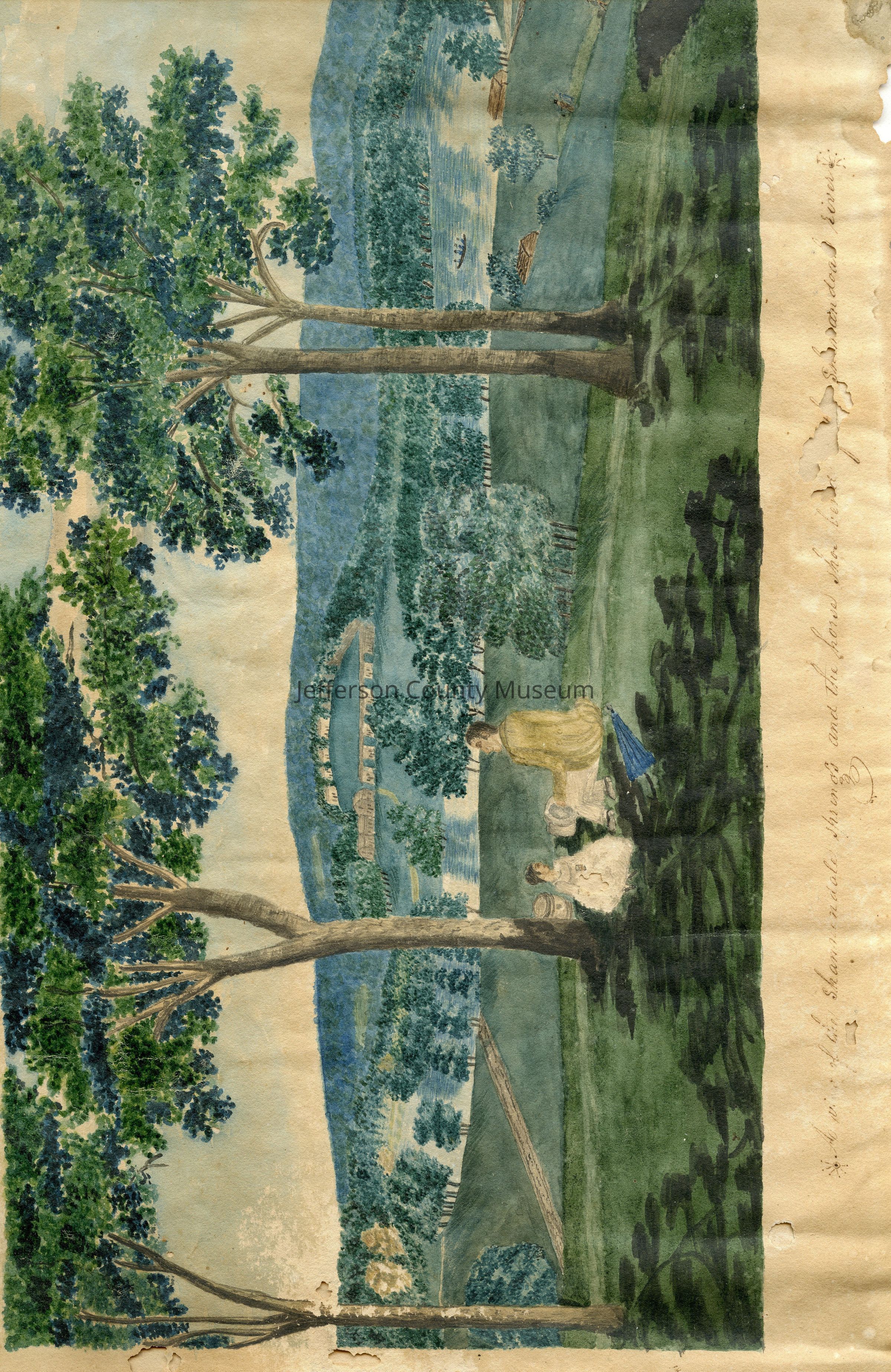 Primitive watercolor of hills, river and trees. Building on hillside across river. Boat with four people in river. Predominant color is green. Man and woman sitting under a tree having a picnic in foreground. Handwritten in brown ink at bottom "A view of the Shannondale springs and the horse shoe bend of the Shenandoah river".Acquisition