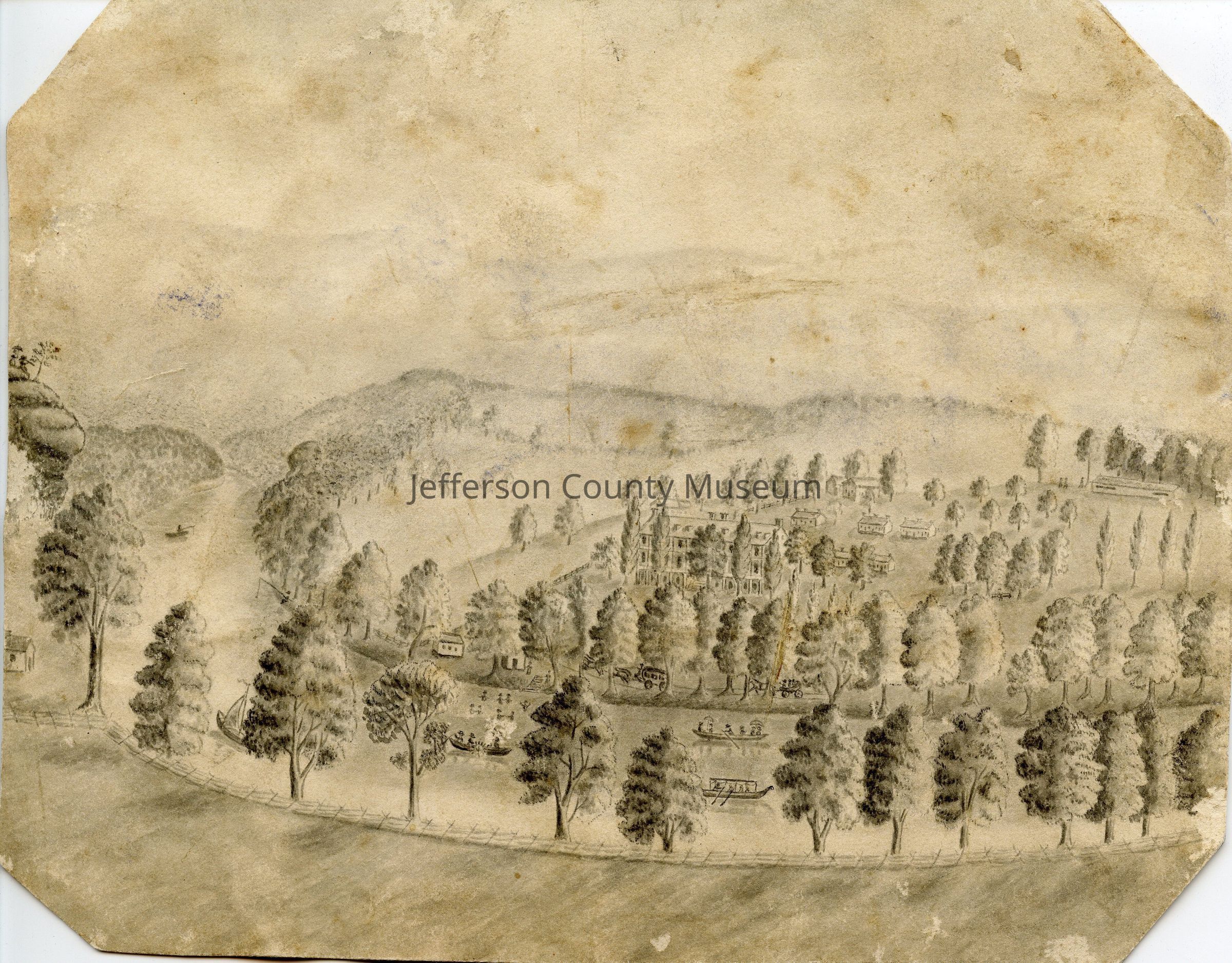 Black and white primitive drawing of Shannondale Springs showing hills, trees, buildings and river with boats and people in boats. Glued to cardboard with newspaper articles on back.Acquisition