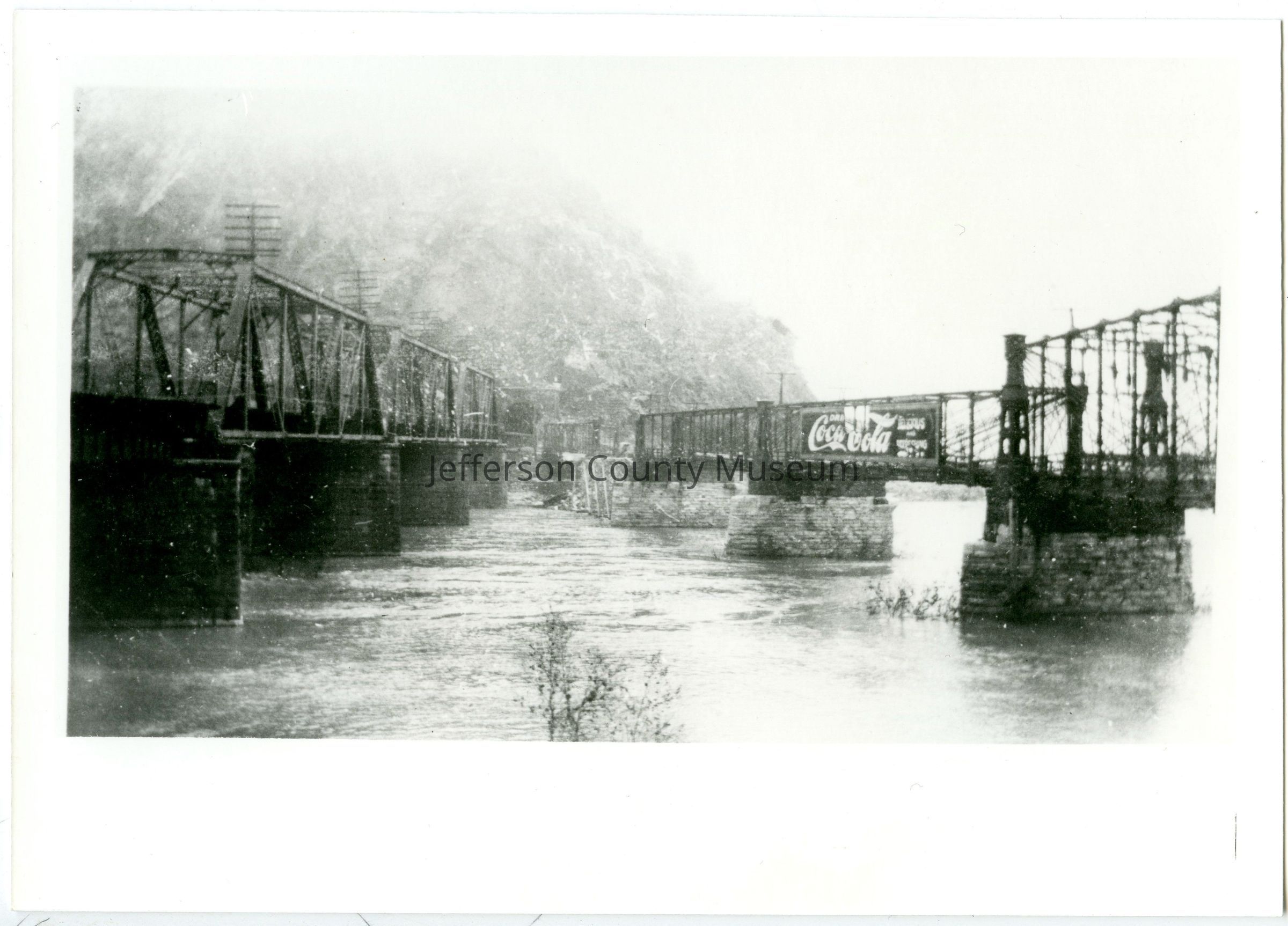 Two bridges at Harpers Ferry, after 1924 flood. Advertisement for Coca Cola on side of bridge on right.