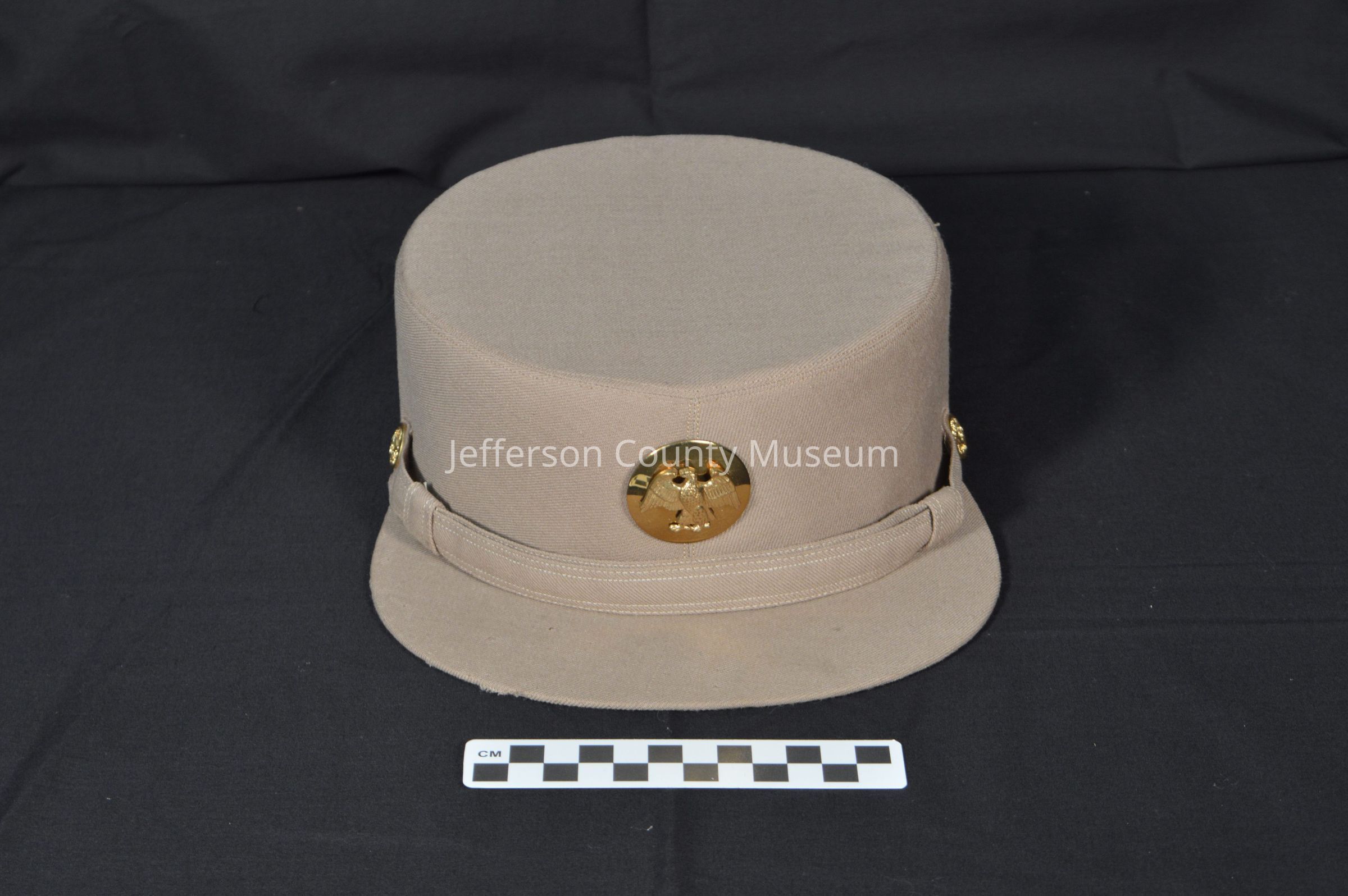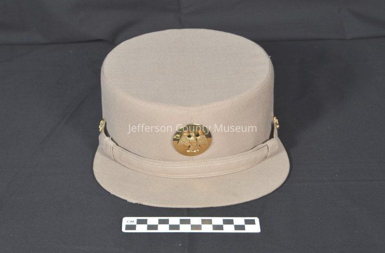 Beige cloth U.S. Women's Army Corps (WAC) hat worn by Madalean Lawson McIver during World War II. Hat is same one shown in IMG3312. Gold eagle pin at center front and small gold eagle pins at either side of bill. Interior lining is green with black printing: "HOPKINS Tailoring Company Baltimore, MD." Small white tag sewn into back of band: "Size 22 1/2". See Media file for biographical details.Acquisition