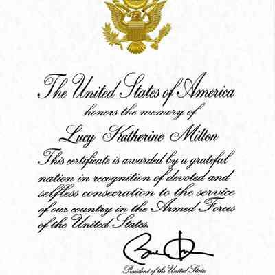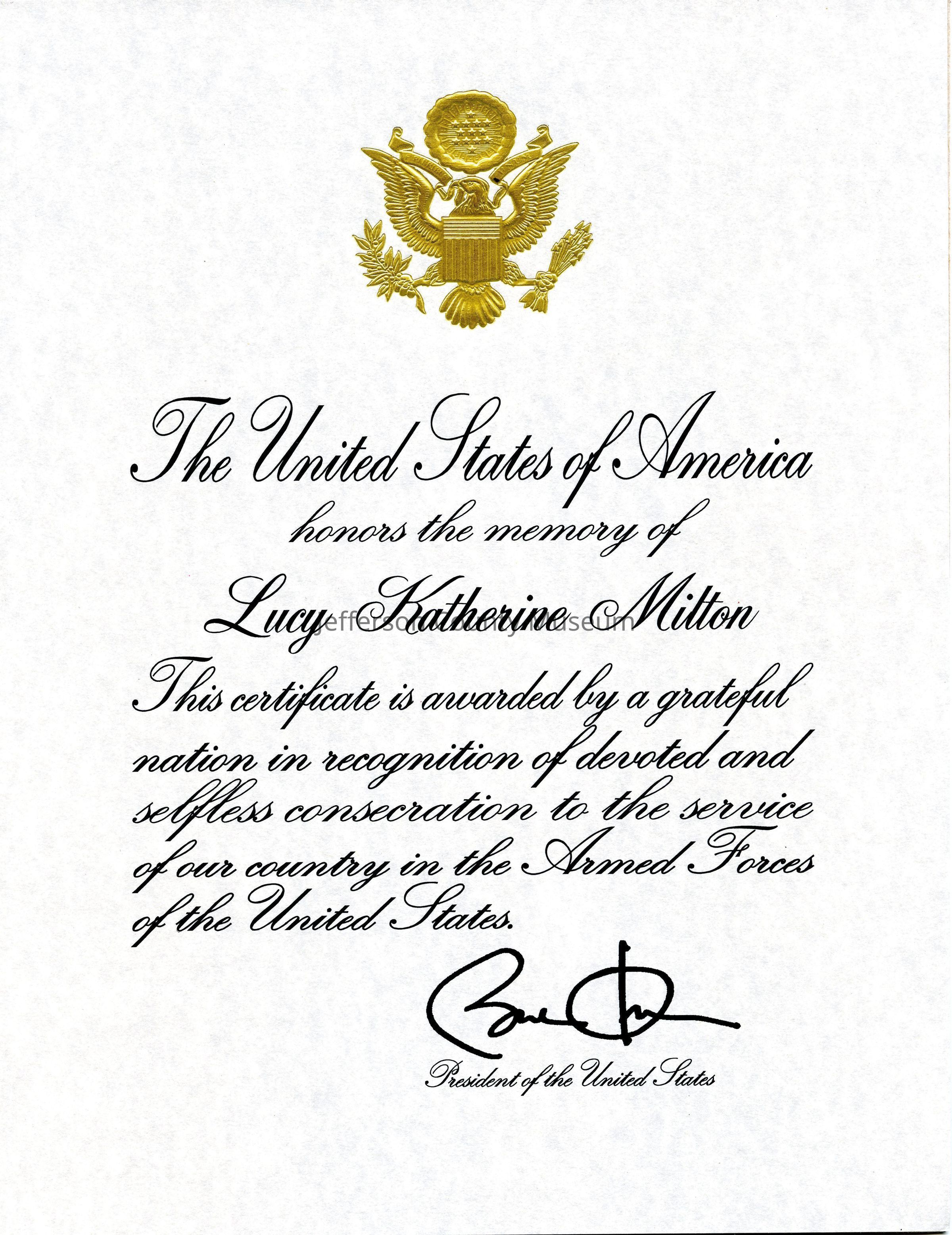 Presidential Memorial Certificate awarded posthumously in 2017 to Lucy Katherine Milton, along with mailing envelope and cover enclosure