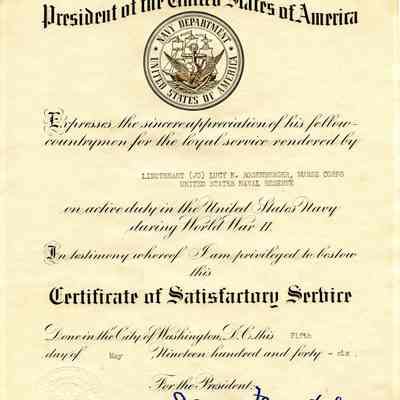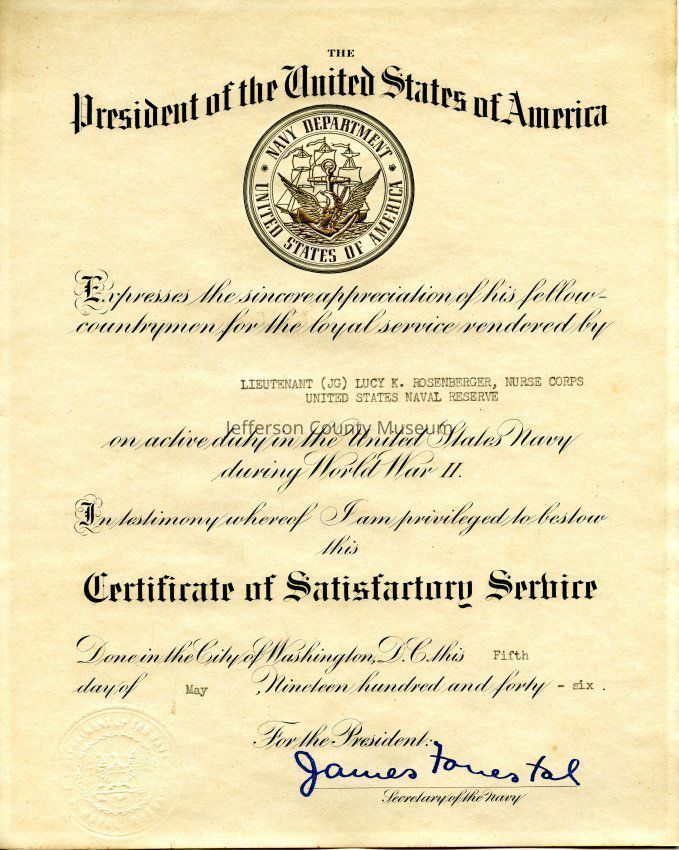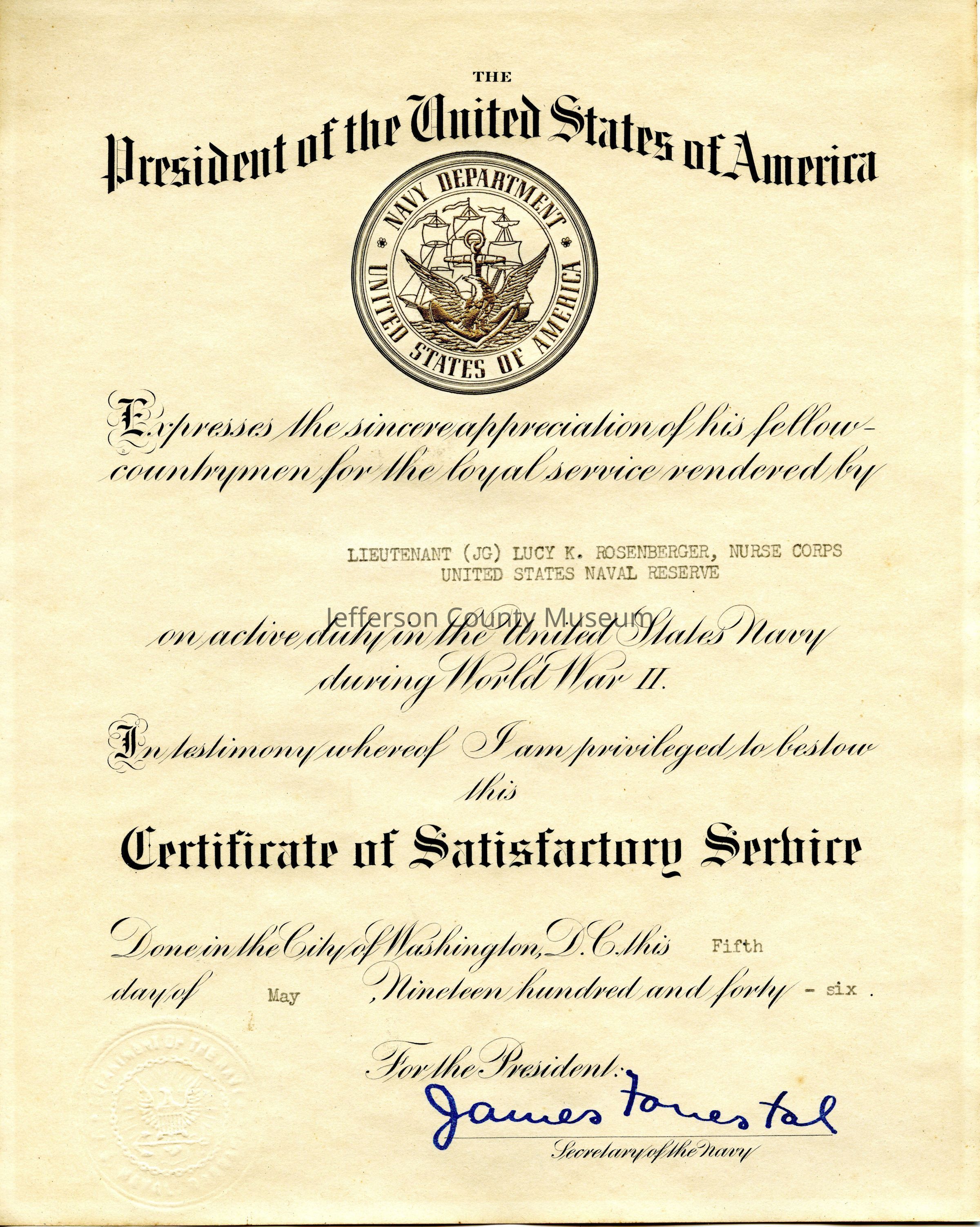 Certificate of Satisfactory Service signed by James Forrestal, Secretary of the Navy, and presented to Lieutenant (JG) Lucy K. Rosenberger, Nurse Corps United States Naval Reserve, 1946