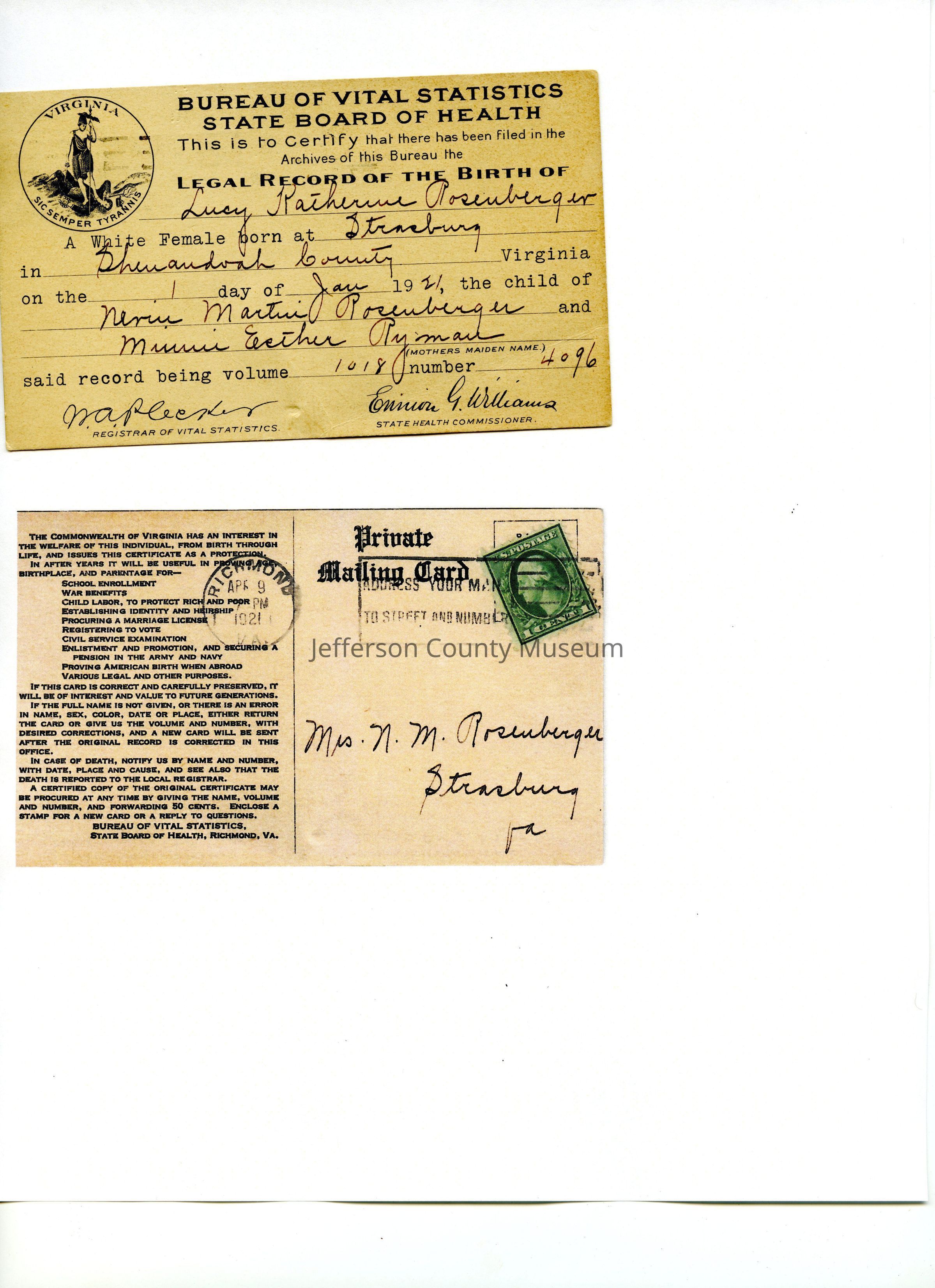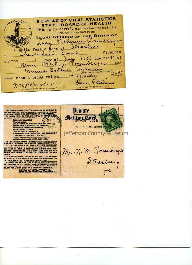 postcard dated Apr 9, 1921, and addressed to Mr. N. M. Rosenberger certifying that the legal record of birth of Lucy Katherine Rosenberger was filed with the Virginia Bureau of Vital Statistics