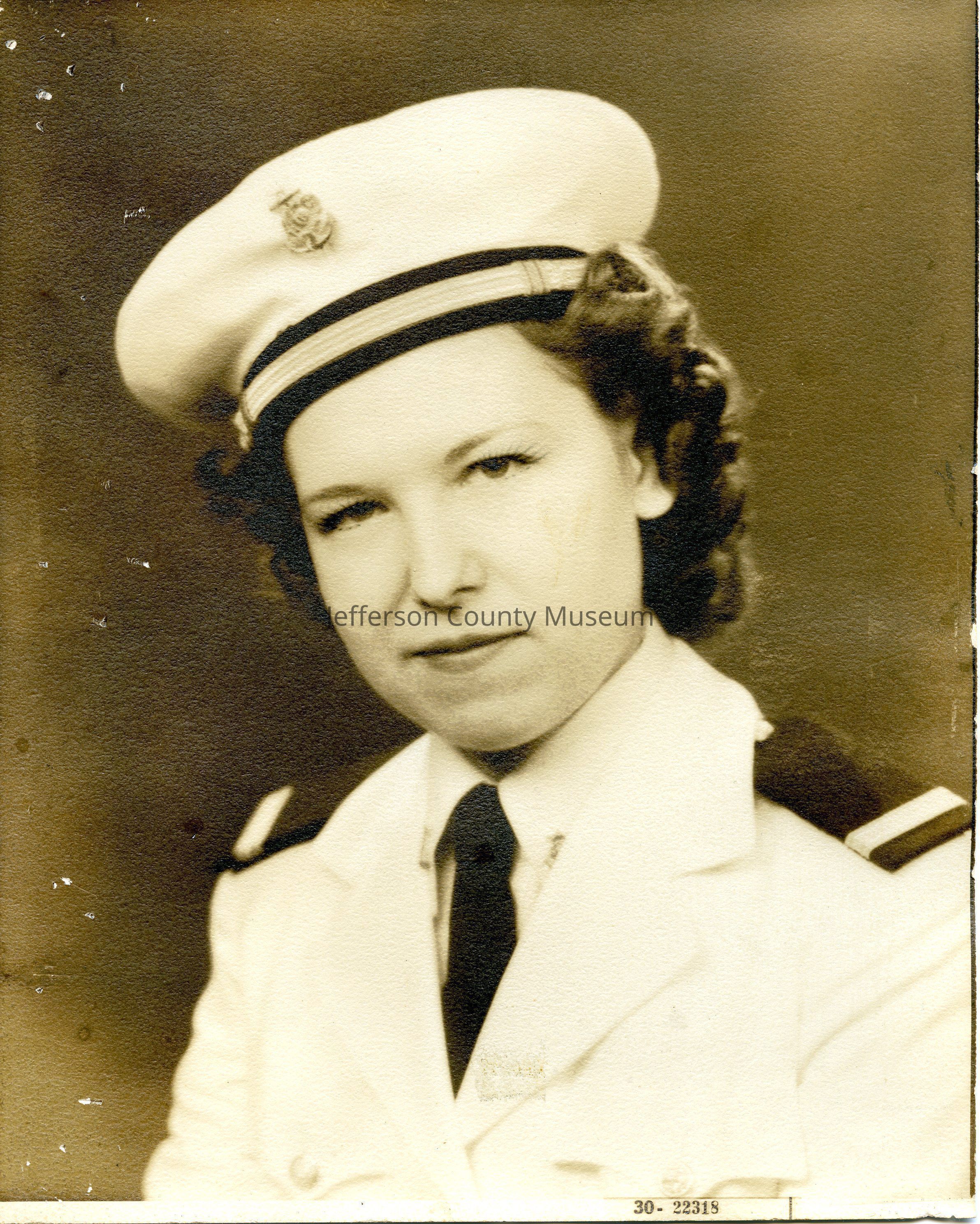 Sepia-tone photo of Lucy Katherine Rosenberger in white U.S. Navy uniform, c1942