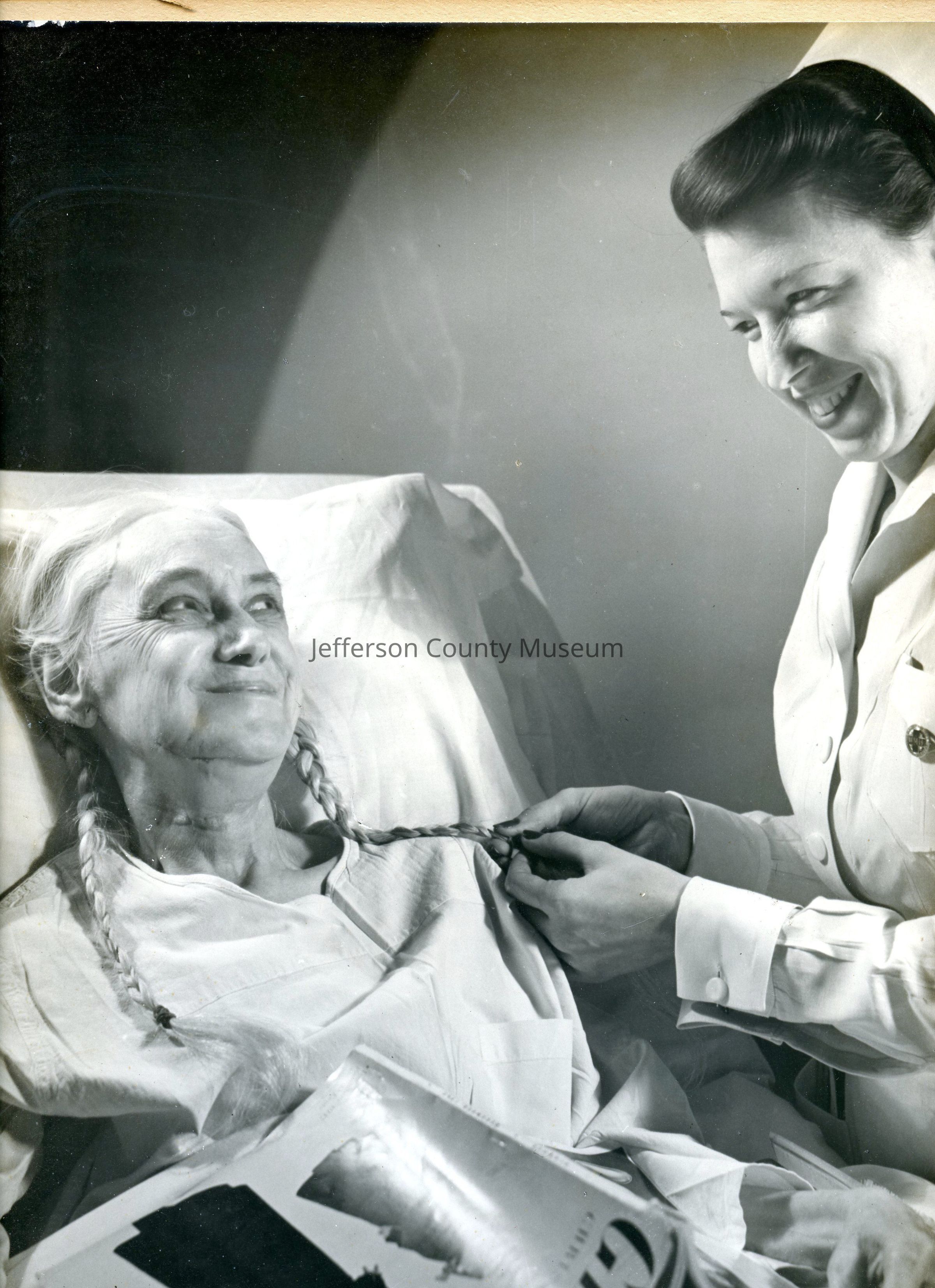 Black & white photo of Lucy Katherine Rosenberger in her nurse's uniform and she is braiding the hair of a female patient reclining in a hospital bed