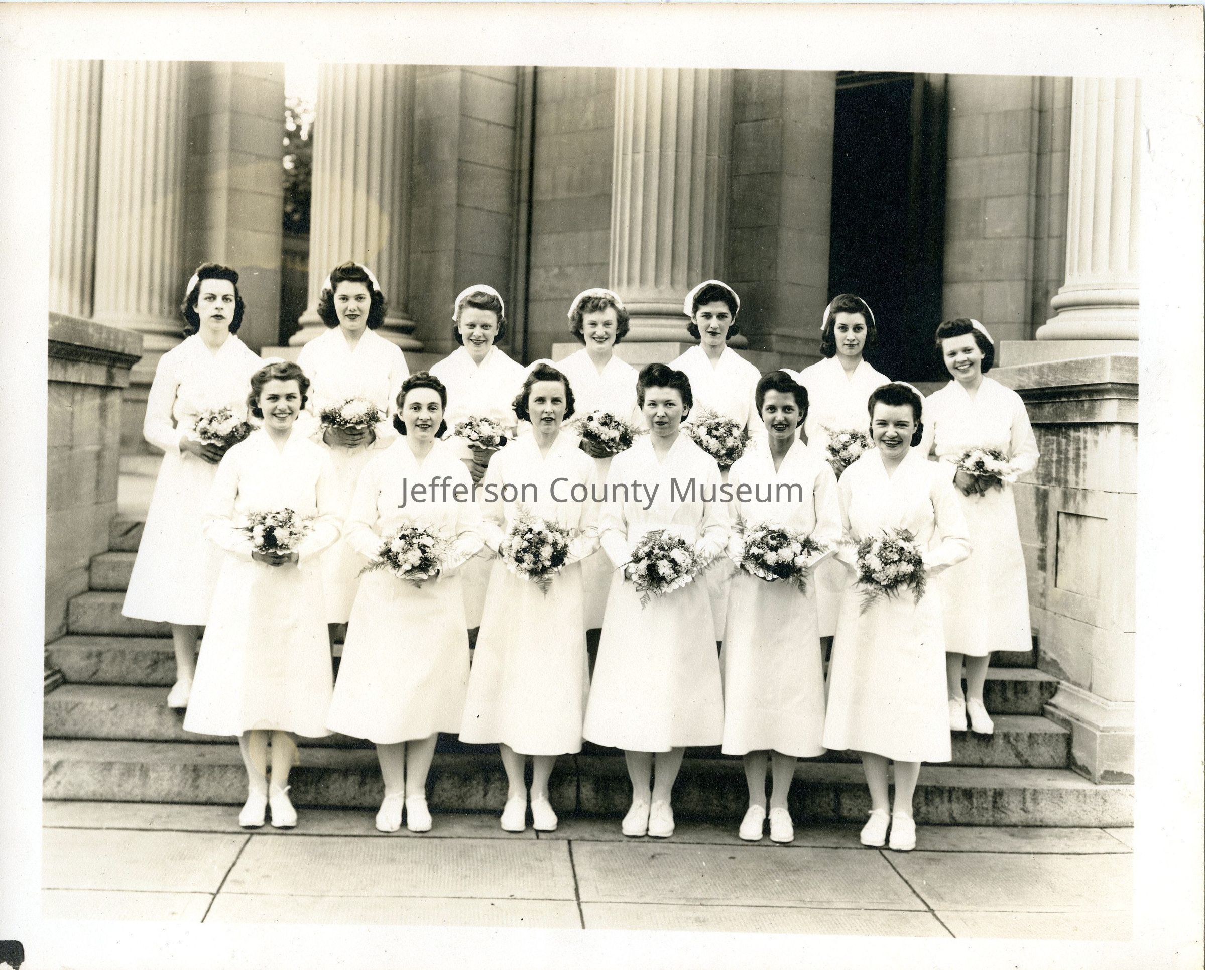 Sepia-tone photo of Winchester Memorial Hospital School of Nursing's 1942 graduating class. Lucy Katherine Rosenberger is in the front row, third from the right