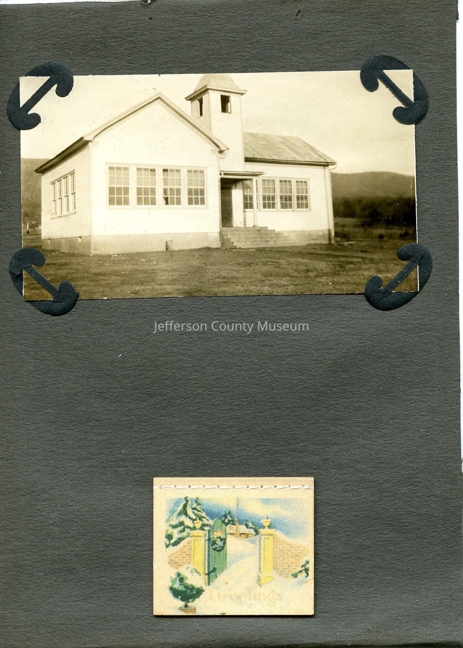 Sepia-tone photo of Top Knot School (outside of Strasburg, VA), attached to black construction paper, with small 1927 calendar pasted below photo (Lucy Katherine Rosenberger attended Top Knot School)