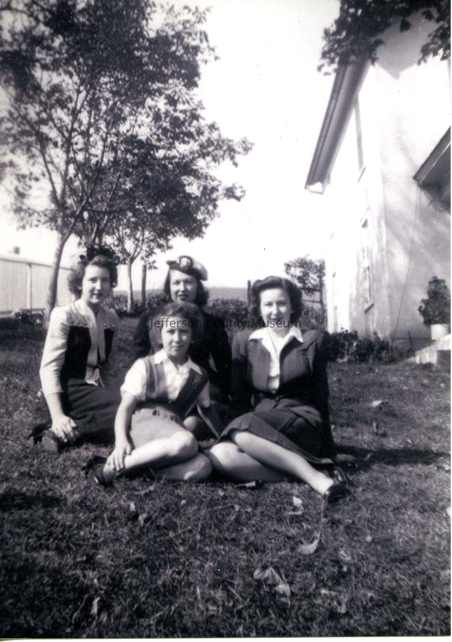 Black & white photo of Lucy Katherine Rosenberger and her three sisters, c1943. Front row, from left: Rachel Rosenberger and Anna Lee Rosenberger. Back row, from left: Helen Rosenberger and Lucy Katherine Rosenberger in her U.S. Navy uniform