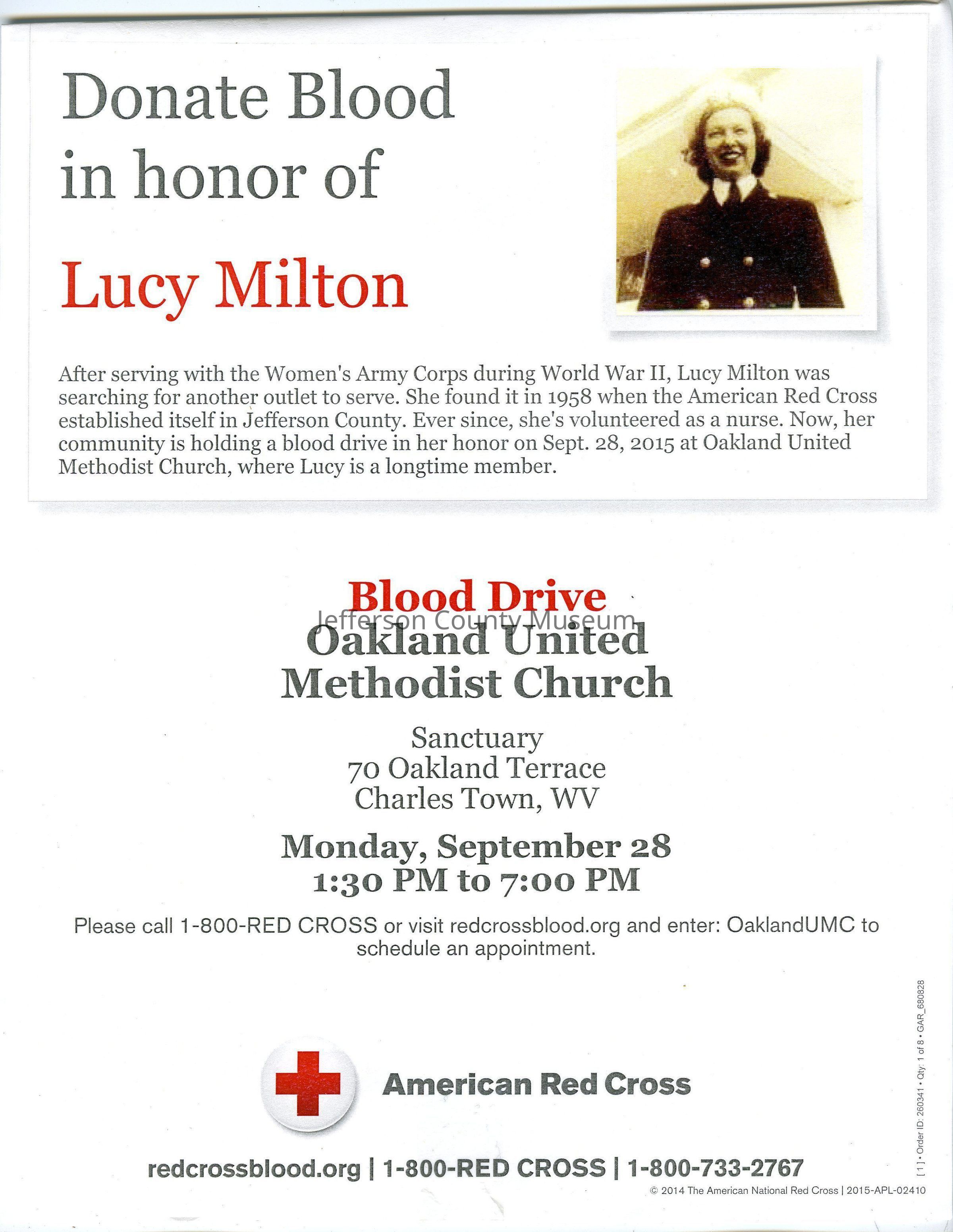 Flyer advertising American Red Cross Blood Drive in honor of Lucy Milton, c2010. Flyer states that Lucy Milton was in the Women's Army Corps during World War II; this was incorrect, she was a lieutenant in the U.S. Navy during World War II