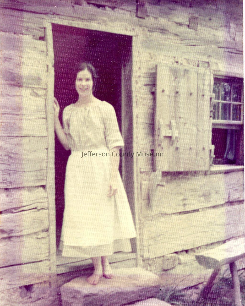 color photo of Jeral Milton, standing in doorway of log cabin, c1976; photo was taken when she worked for the Lincoln Boyhood National Memorial in Dale, Indiana. Lucy Rosenberger Milton was the mother of Jeral Milton
