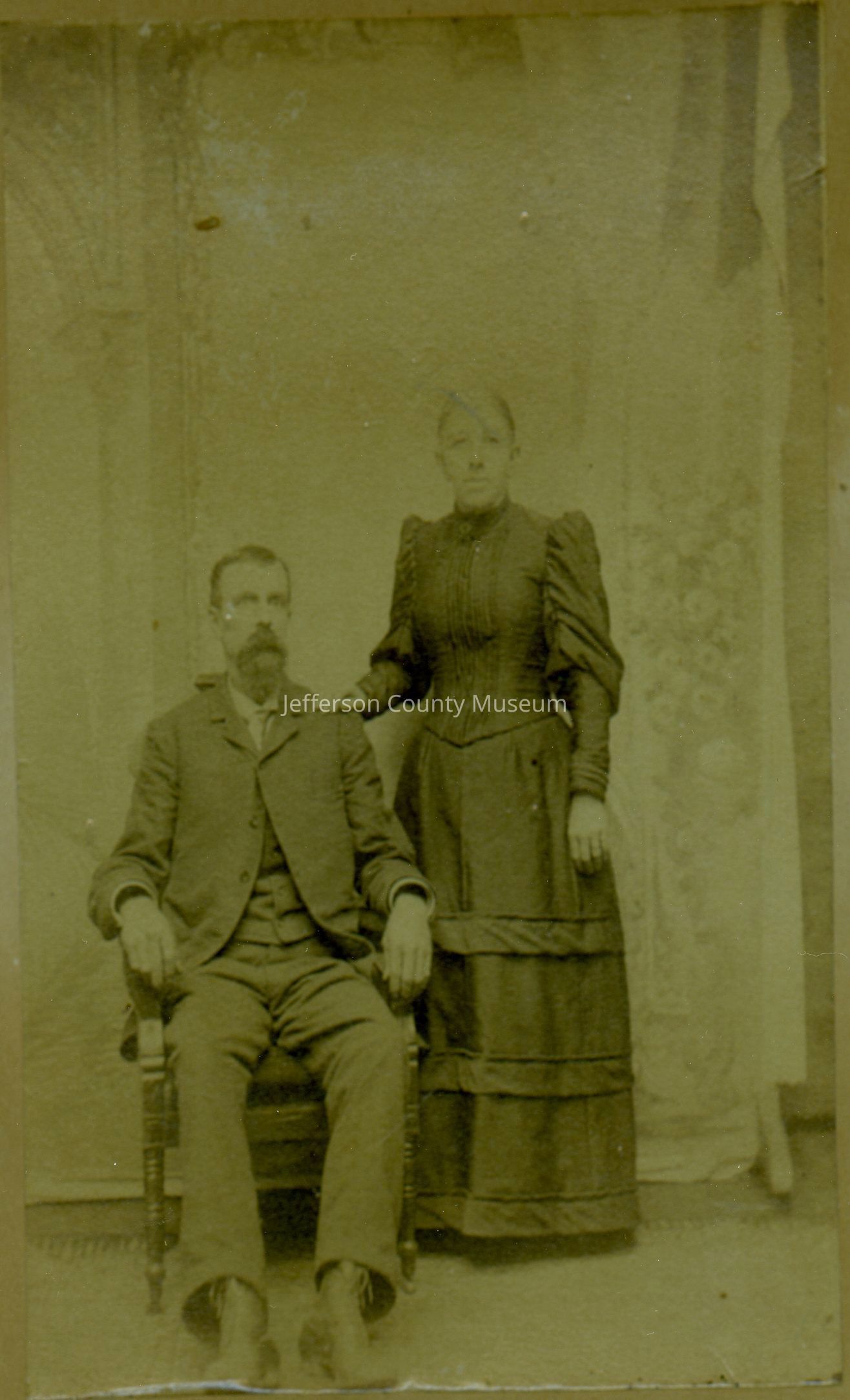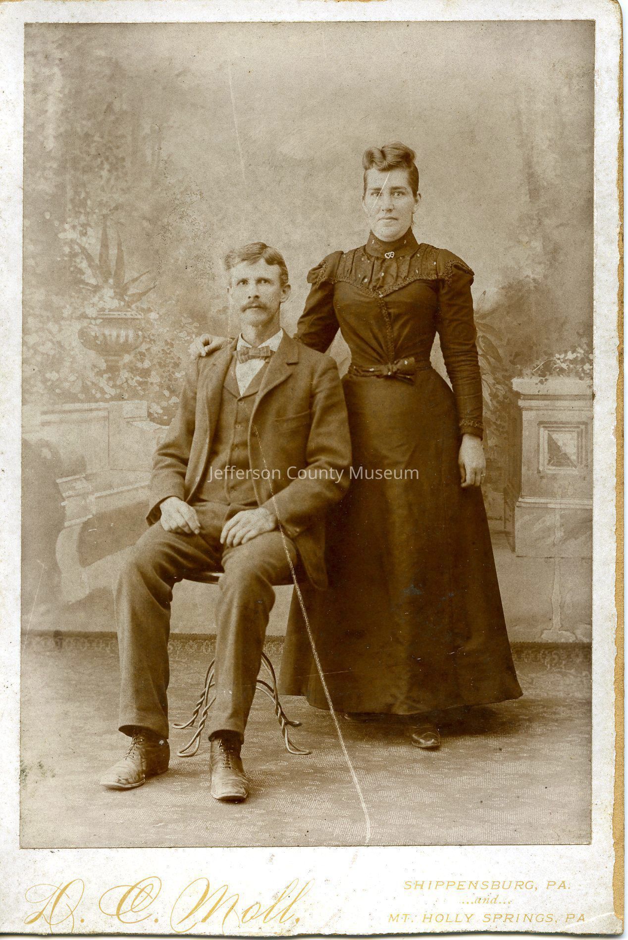 Sepia-tone cabinet photo of unidentified man and woman, by photographer in Shippensburg and Mt. Holly Springs, PA
