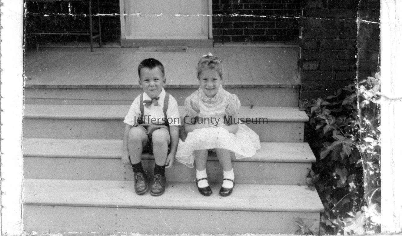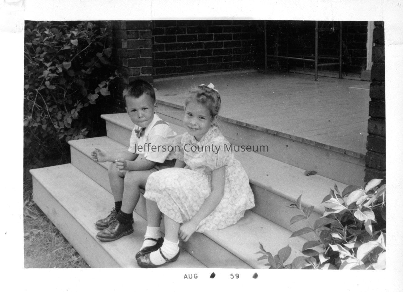 two black & white photos of James ("J") and Jeral Milton, taken on front steps of the home of James William and Carlotta Dice Gruber Milton on the occasion of their 40th wedding anniversary party