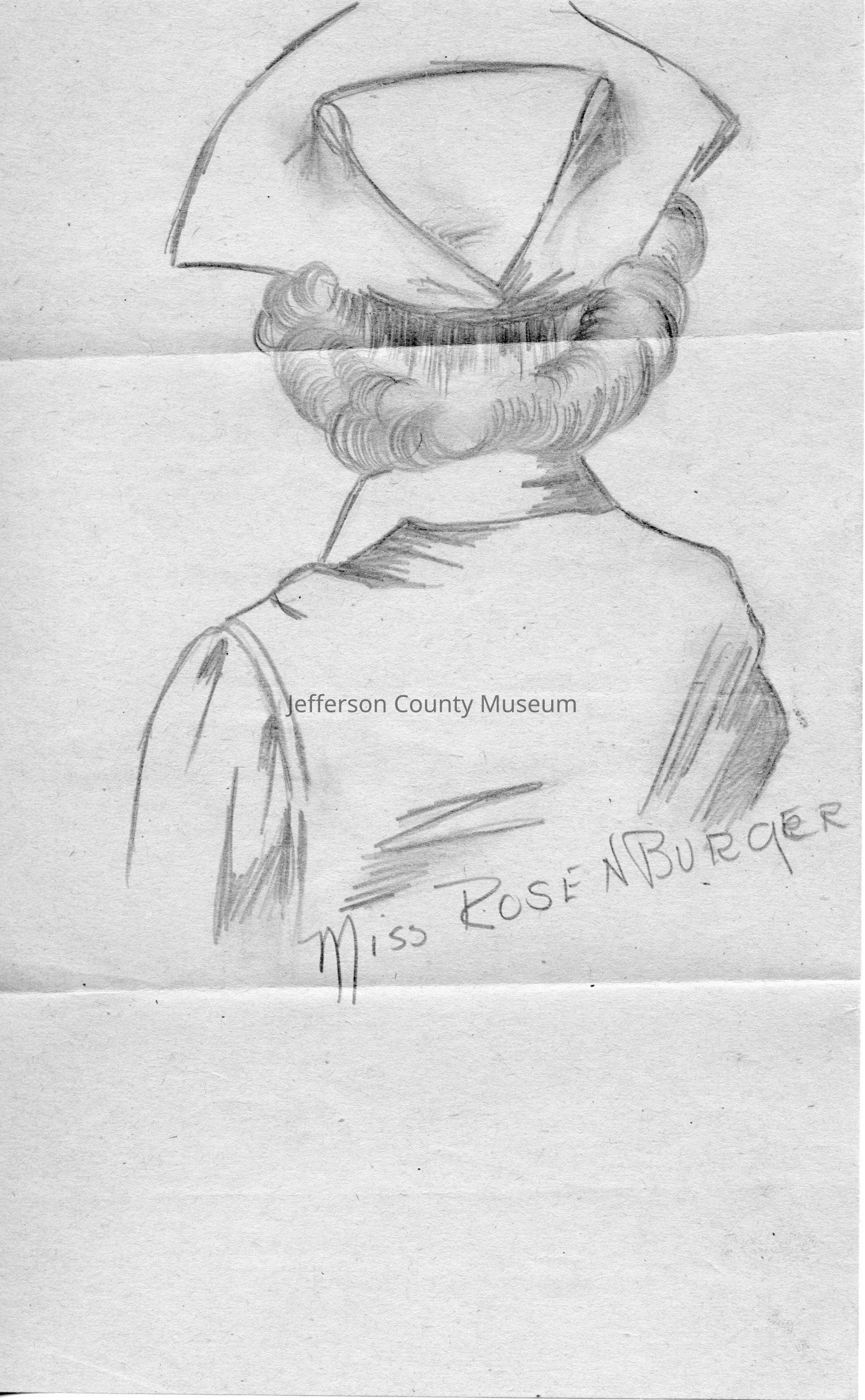 pencil drawing on paper, by unidentified artist, of back of a woman's head and shoulders and wearing a nurse's style cap; block-printed below drawing: "MISS ROSENBURGER" [sic]; paper was folded in thirds