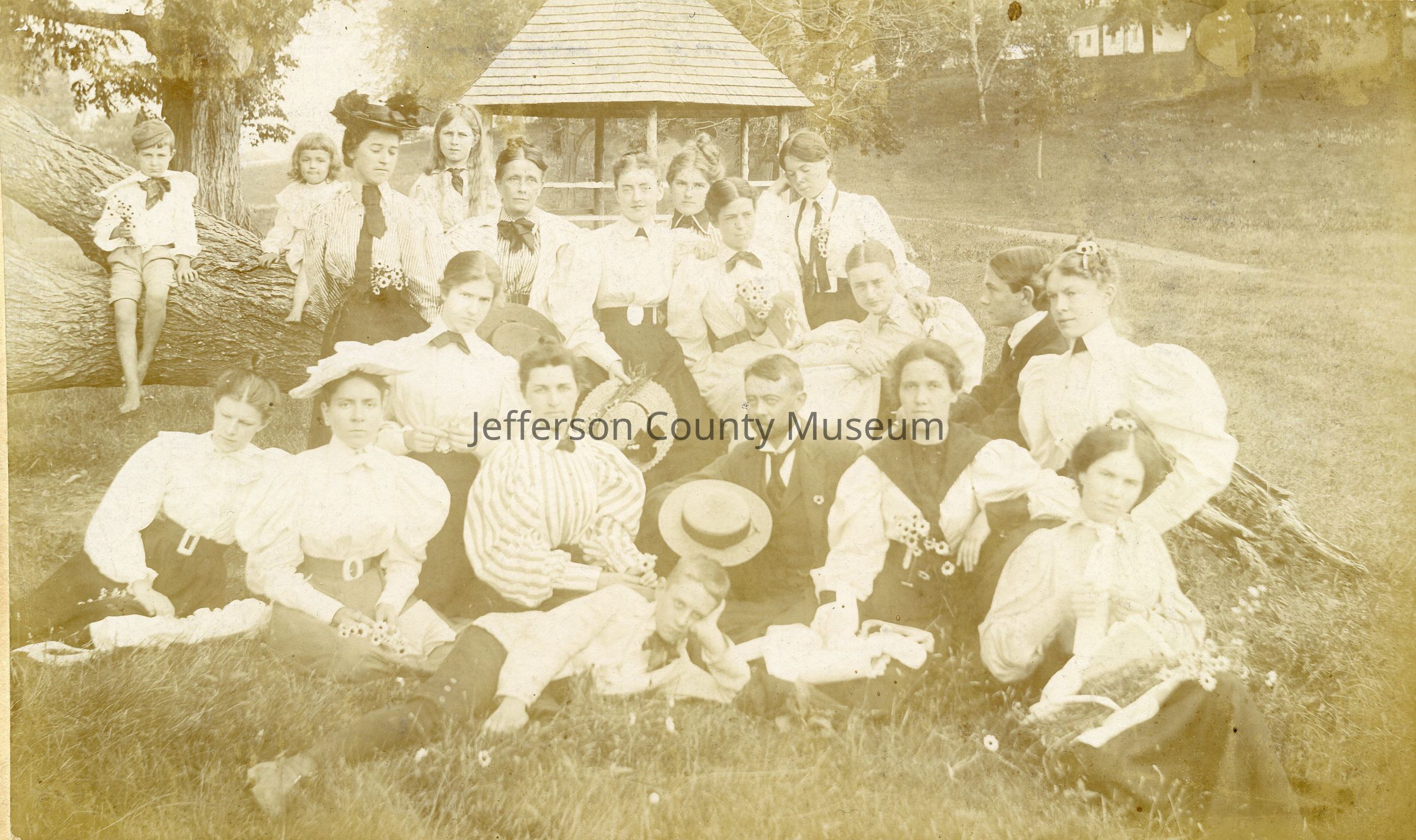 Shows group of men, women and children. Man seated in center is holding a straw boater. Handwritten in blue ink on back "Shannondale Spring near Charles Town W.Va. 1895". On card stock.Acquisition