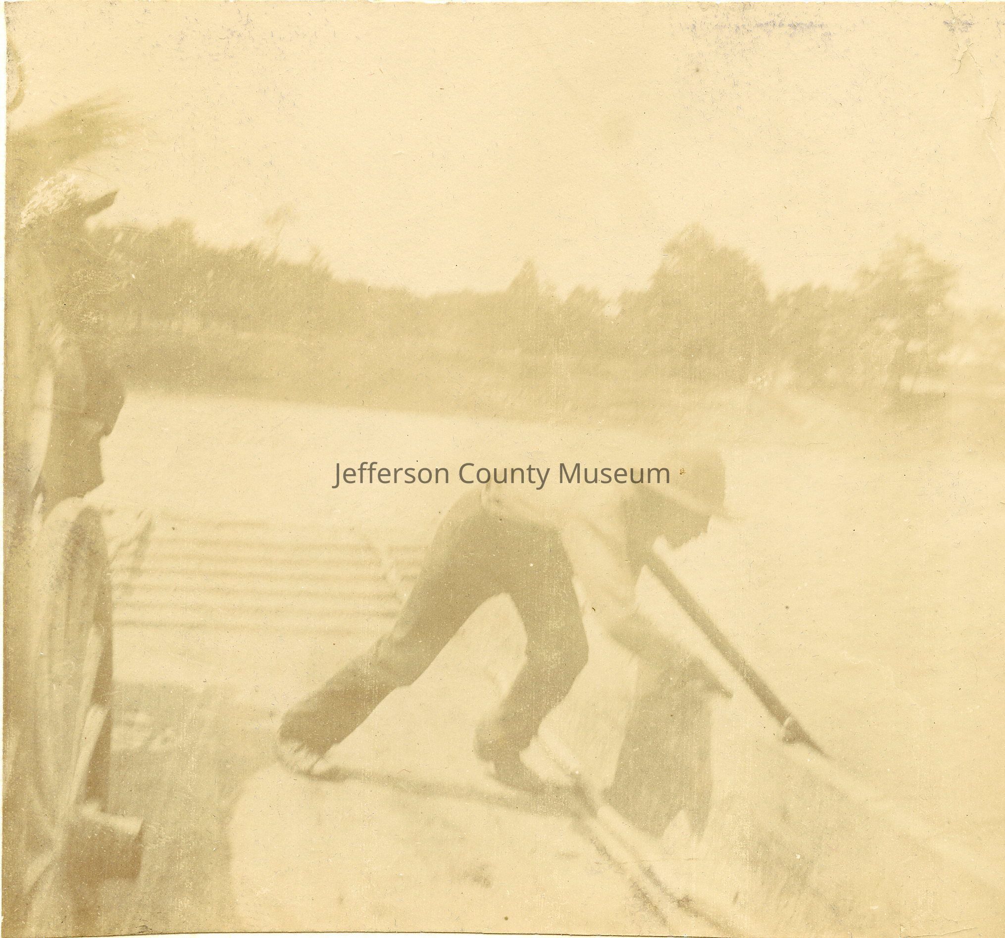 African American man on ferry leaning over with an oar in place on ferry. Handwritten on back in pencil "Uncle Horace Shannondale Springs". On card stock.Acquisition