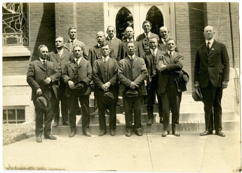 Jury in trial of William "Bill" Blizzard, one of the Miners' Trials held in Charles Town. Judge J. M. Woods presided. Unionist William ‘‘Bill’’ Blizzard (September 19, 1892 - July 31, 1958) was tried for treason and murder for his role in the Battle of Blair Mountain but was acquitted in May 1922.
