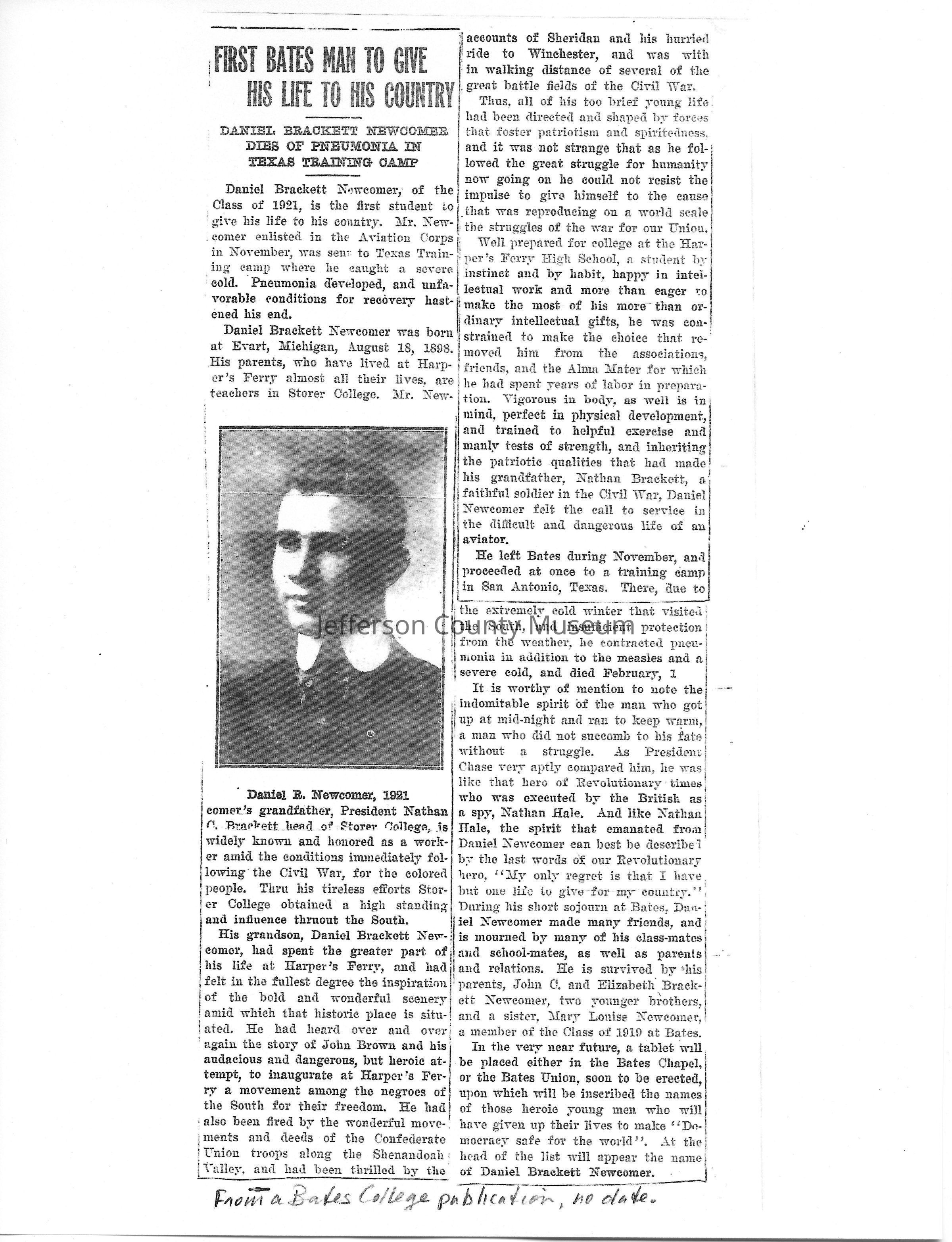 Memorial poem for Daniel Brackett Newcomer, son of Rev. John C. and Elizabeth Brackett Newcomer, of Harpers Ferry. Poem by Blanche A. Wheatley; memoriam by Frances Willard, Woman's Christian Temperance Union, Bolivar-Harpers Ferry Chapter. Mr. Newcomer was the first World War I soldier from Jefferson County to die in service; he died on February 1, 1918, at Fort Sam Houston, San Antonio, Texas.