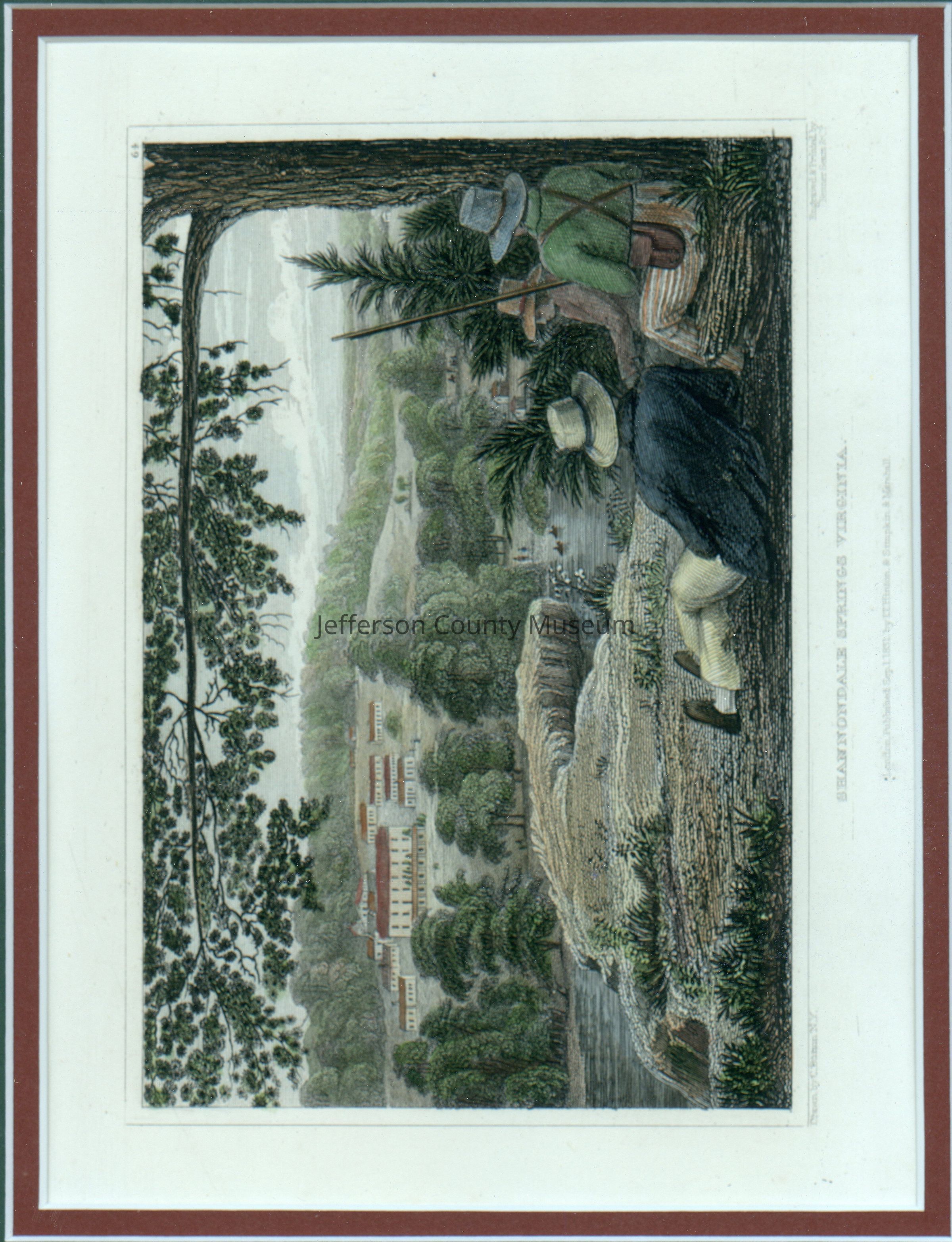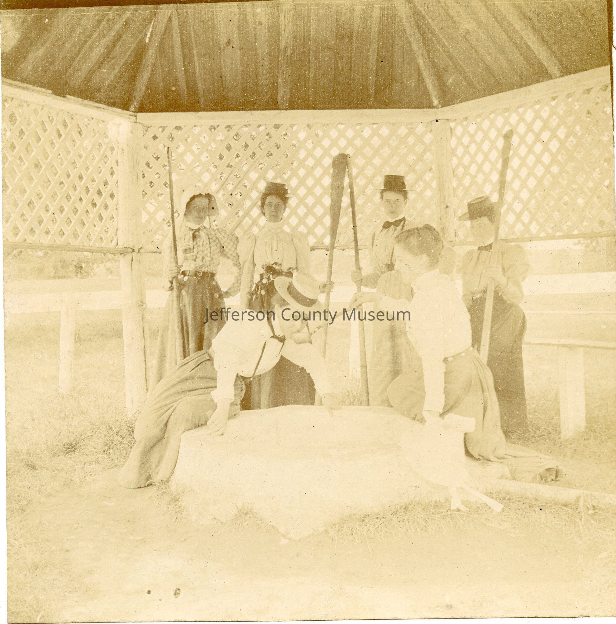 Six women in spring house at Shannondale Springs. Four are standing holding oars, one is offering another a drink of water from a ladle. Glued to card stock.Acquisition