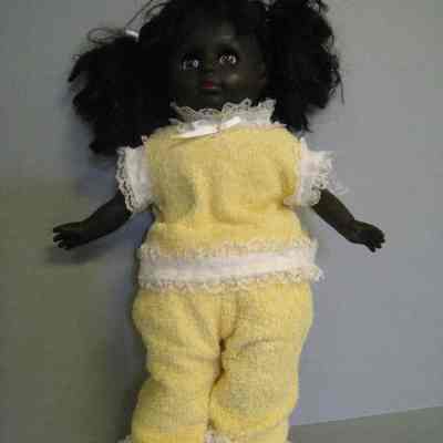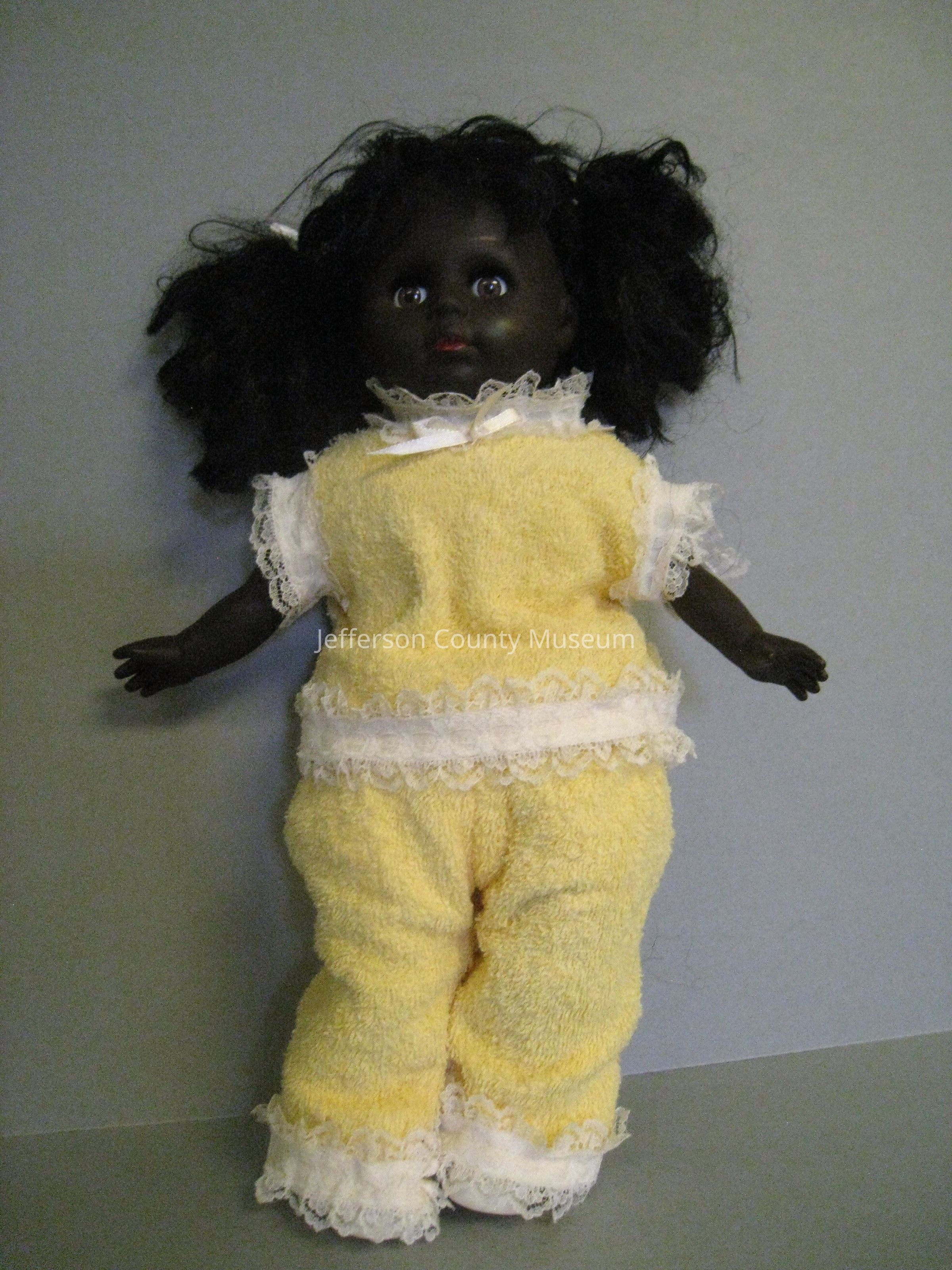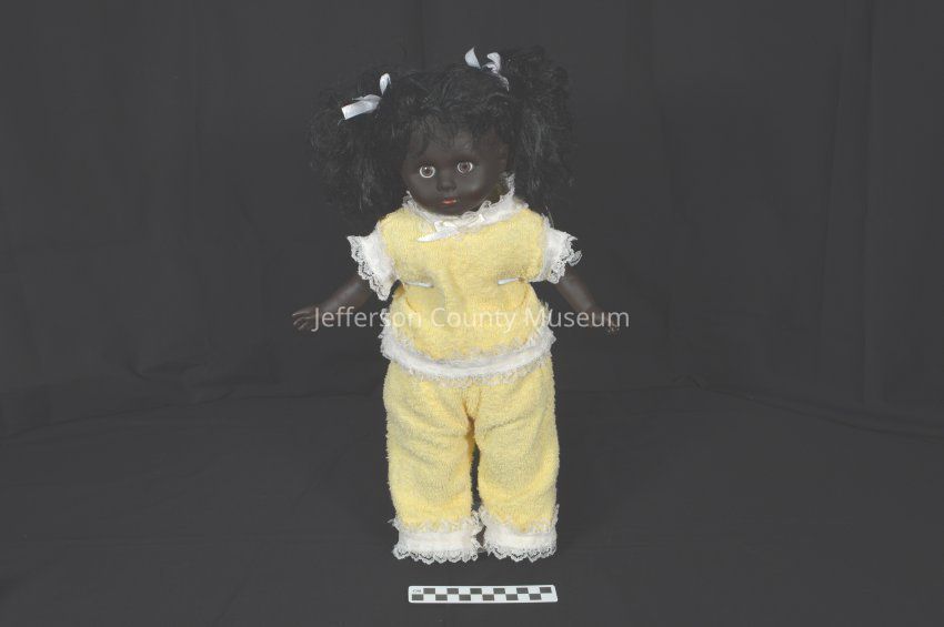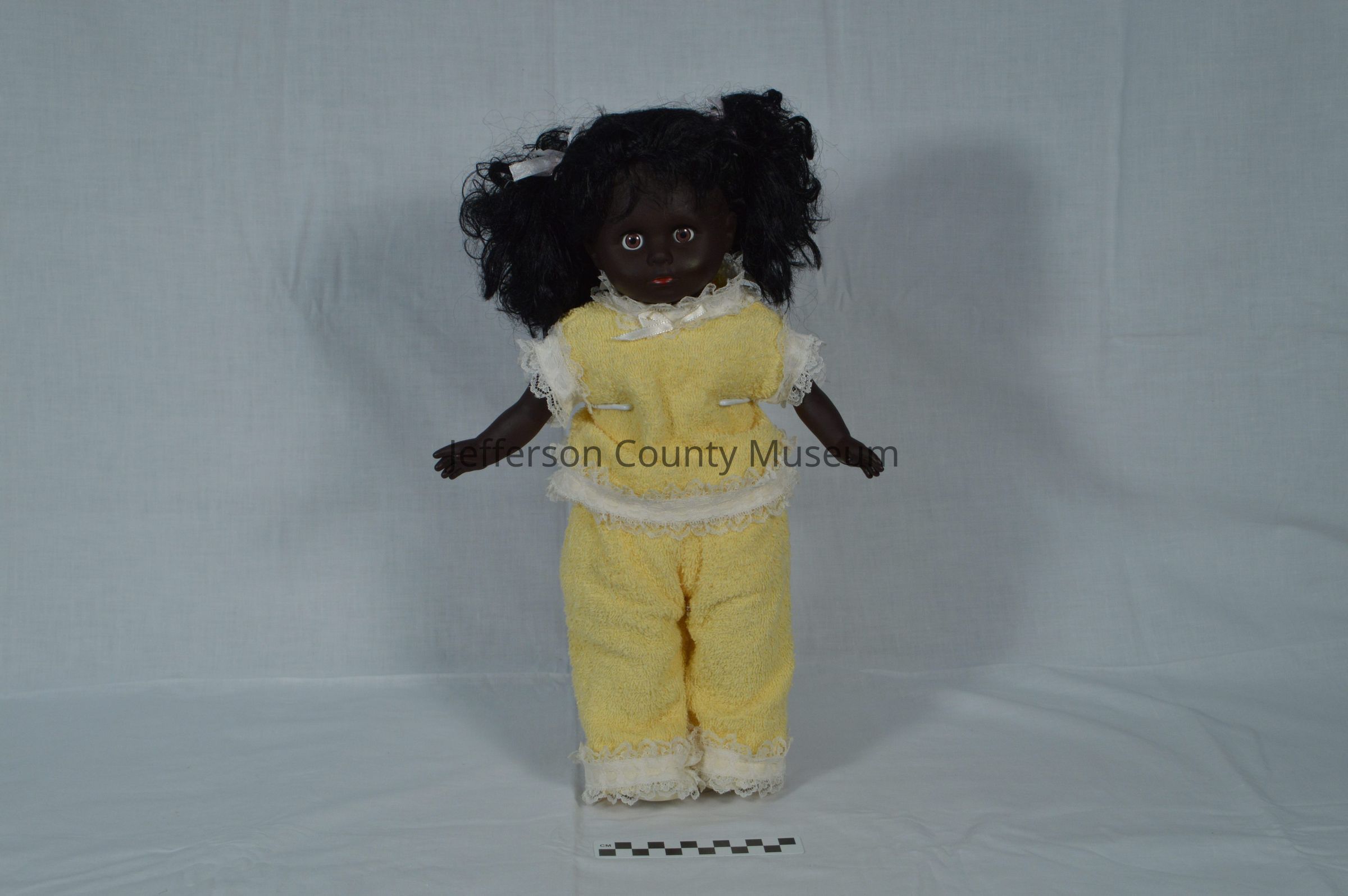 Black female doll with plastic head, arms, and legs. Head has black hair tied in pony-tails with pink ribbon on either side and eyes that open and close. Cloth body is dressed in yellow toweling shirt and pants with white lace around pants cuffs, shirt bottom, sleeves, and neck and with white socks and white plastic shoes. Clothing appears to be machine-stitched, but hand-made. The number "9782" is impressed in back of neck.Acquisition