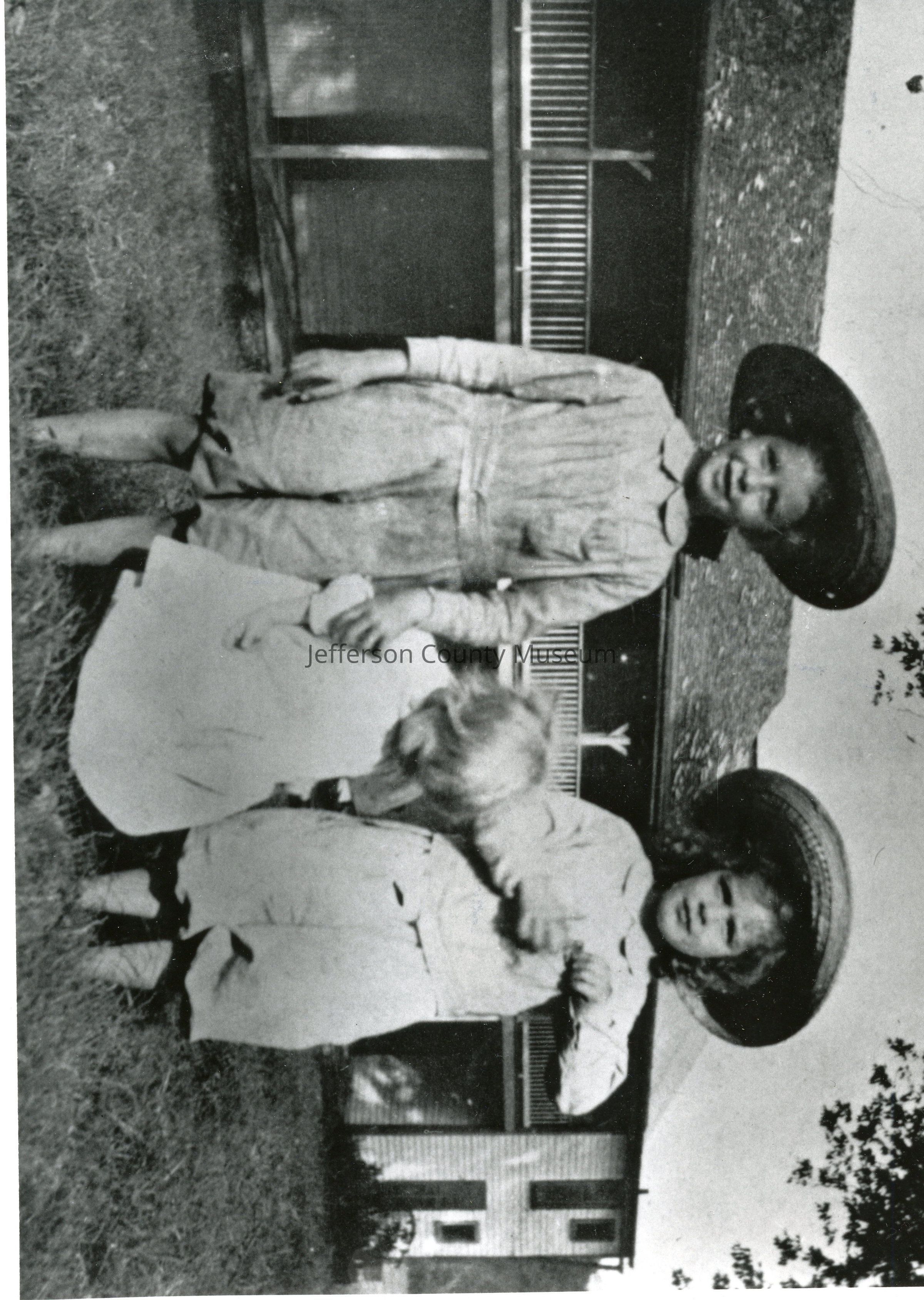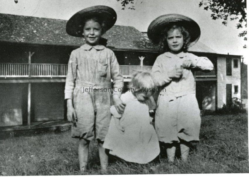 Three children standing in front of hotel at Shannondale. Two are wearing straw hats. One is Virginia Cosy, probably on right.Acquisition