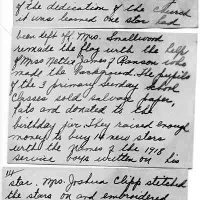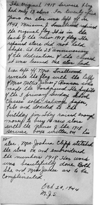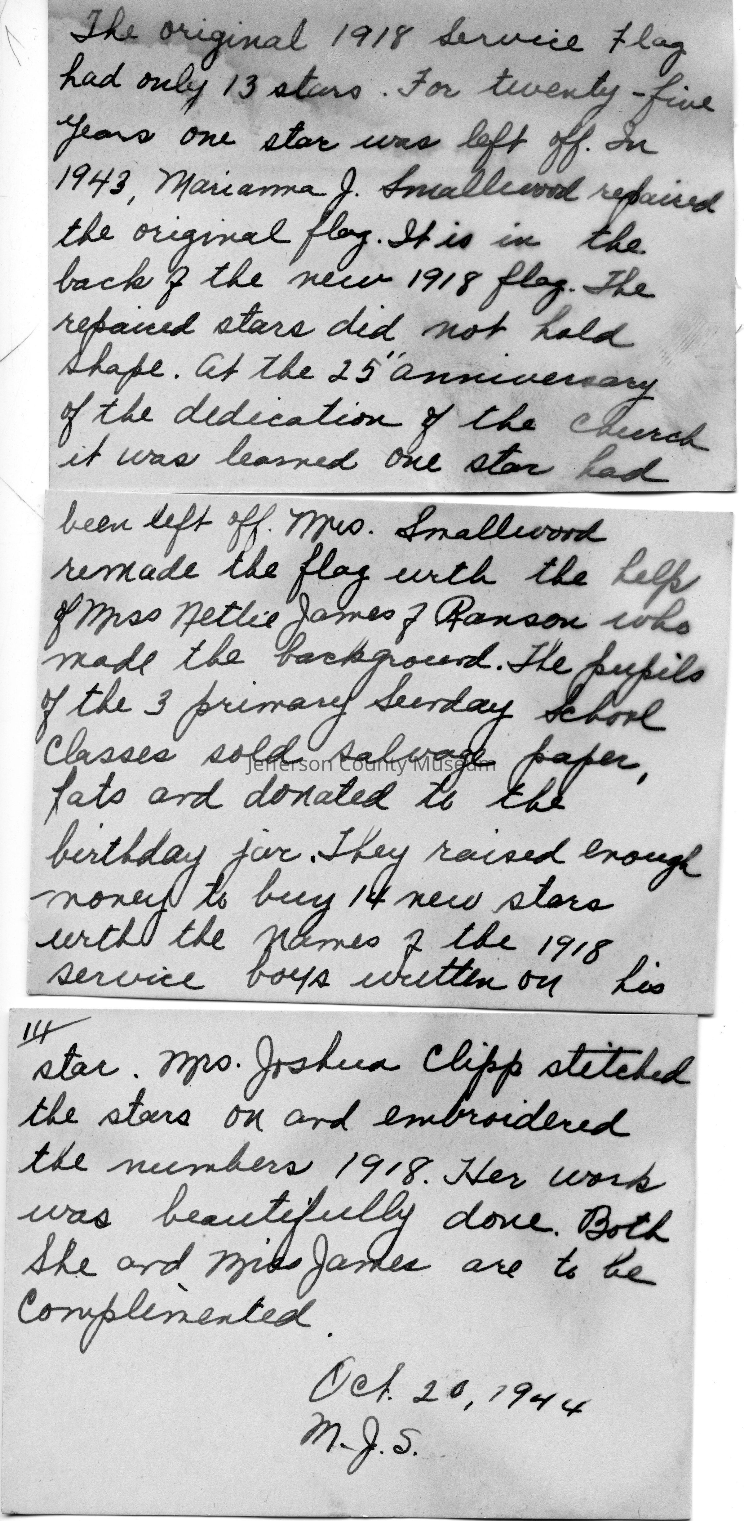 (C) Three cards, handwritten in ink by Marianna Johnson Smallwood, giving the history of the two banners and dated October 20, 1944.