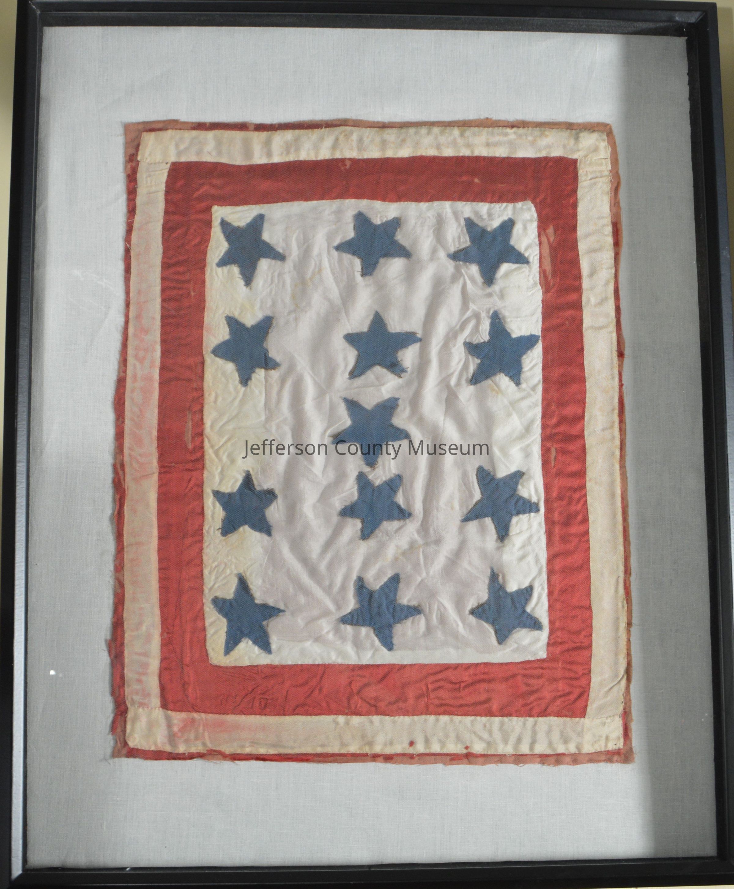 (A) Red and white satin banner with thirteen blue stars (no names) hand-stitched to white satin fabric.